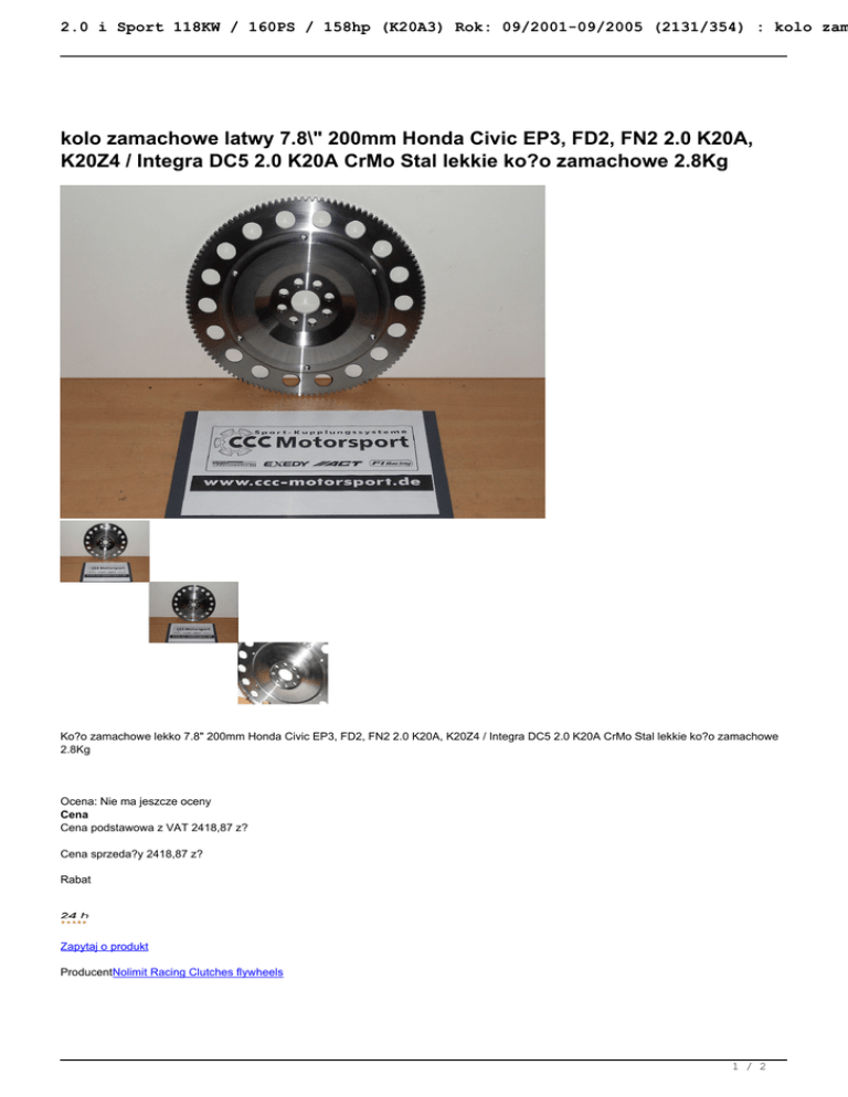 2.0 i Sport 118KW / 160PS / 158hp (K20A3) Rok: 09/2001-09/2005 (2131/354) : kolo zam kolo zamachowe latwy 7.8\" 200mm Honda Civic EP3, FD2, FN2 2.0 K20A, K20Z4 / Integra DC5 2.0 K20A CrMo Stal lekkie ko?o zamachowe 2.8Kg Ko?o zamachowe lekko 7.8" 200mm Honda Civic EP3, FD2, FN2 2.0 K20A, K20Z4 / Integra DC5 2.0 K20A CrMo Stal lekkie ko?o zamachowe 2.8Kg Ocena: Nie ma jeszcze oceny Cena Cena podstawowa z VAT 2418,87 z? Cena sprzeda?y 2418,87 z? Rabat Zapytaj o produkt ProducentNolimit Racing Clutches flywheels 1 / 2 2.0 i Sport 118KW / 160PS / 158hp (K20A3) Rok: 09/2001-09/2005 (2131/354) : kolo zam Opis Ko?o zamachowe lekko 7.8" 200mm Honda Civic EP3, FD2, FN2 2.0 K20A, K20Z4 / Integra DC5 2.0 K20A CrMo Stal lekkie ko?o zamachowe 2.8Kg dane ko?o zamachowe Materia?: stal chromowo-molibdenowej CrMo ?rednica sprz?g?a: 200mm Waga: ca. 2.8Kg Pasuje do nast?puj?cych modeli / silników Civic EP3 2.0 K20A Rok: 2001-2005 Civic FD2 2.0 K20A Rok: 2007-2011 Civic FN2 2.0 K20Z4 Rok: 2007-2010 Integra DC5 2.0 K20A Rok: 2001-2003 2 / 2 Powered by TCPDF (www.tcpdf.org)