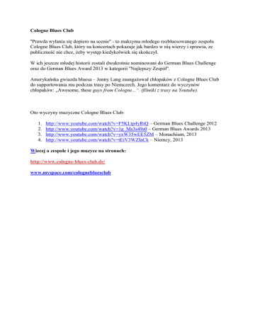 Cologne Blues Club ''Prawda wyłania się dopiero na scenie'' - to maksyma młodego rozbluesowanego zespołu Cologne Blues Club, który na koncertach pokazuje jak bardzo w nią wierzy i sprawia, ze publiczność nie chce, żeby występ kiedykolwiek się skończył. W ich jeszcze młodej historii zostali dwukrotnie nominowani do German Blues Challenge oraz do German Blues Award 2013 w kategorii ''Najlepszy Zespół''. Amerykańska gwiazda bluesa – Jonny Lang zaangażował chłopaków z Cologne Blues Club do supportowania mu podczas trasy po Niemczech. Jego komentarz do wyczynów chłopaków: „Awesome, these guys from Cologne...“. (filmiki z trasy na Youtube). Oto wyczyny muzyczne Cologne Blues Club: 1. 2. 3. 4. http://www.youtube.com/watch?v=F5KLtp4yRtQ – German Blues Challenge 2012 http://www.youtube.com/watch?v=1g_Ms3s49s0 – German Blues Awards 2013 http://www.youtube.com/watch?v=yxW35wEE5ZM – Monachium, 2013 http://www.youtube.com/watch?v=tEiV3WZIaCk – Niemcy, 2013 Wiecej o zespole i jego muzyce na stronach: http://www.cologne-blues-club.de/ www.myspace.com/colognebluesclub