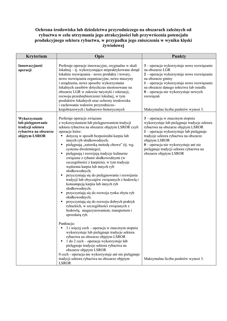 Ochrona środowiska lub dziedzictwa przyrodniczego na obszarach zależnych od rybactwa w celu utrzymania jego atrakcyjności lub przywrócenia potencjału produkcyjnego sektora rybactwa, w przypadku jego zniszczenia w wyniku klęski żywiołowej Kryterium Innowacyjność operacji Wykorzystanie lub pielęgnowanie tradycji sektora rybactwa na obszarze objętym LSROR Opis Punkty Preferuje operacje innowacyjne, oryginalne w skali lokalnej – tj. wykorzystujące niepraktykowane dotąd lokalnie rozwiązania - nowe produkty i towary, nowe rozwiązania organizacyjne, nowe maszyny i urządzenia, nowe sposoby wykorzystania lokalnych zasobów dotychczas niestosowane na obszarze LGR w zakresie turystyki i rekreacji, rozwoju przedsiębiorczości lokalnej, w tym produktów lokalnych oraz ochrony środowiska i zachowania walorów przyrodniczokrajobrazowych i kulturowo-historycznych 3 – operacja wykorzystuje nowe rozwiązanie na obszarze LGR 2 – operacja wykorzystuje nowe rozwiązanie na obszarze gminy 1 – operacja wykorzystuje nowe rozwiązanie na obszarze danego sołectwa lub osiedla 0 – operacja nie wykorzystuje nowych rozwiązań Preferuje operacje związane z wykorzystaniem lub pielęgnowaniem tradycji sektora rybactwa na obszarze objętym LSROR czyli operacje które: dotyczą w sposób bezpośredni karpia lub innych ryb słodkowodnych; pielęgnują „zatorską metodę chowu” (tj. wg. systemu dwuletniego); pielęgnują i rozwijają tradycje kulinarne związane z rybami słodkowodnymi (w szczególności z karpiem), w tym tradycje wędzenia karpia lub innych ryb słodkowodnych; przyczyniają się do pielęgnowania i rozwijania tradycji lub obyczajów związanych z hodowlą i konsumpcją karpia lub innych ryb słodkowodnych; przyczyniają się do rozwoju rynku zbytu ryb słodkowodnych; przyczyniają się do rozwoju dobrych praktyk rybackich, w szczególności związanych z hodowlą, magazynowaniem, transportem i sprzedażą ryb. 3 – operacja w znacznym stopniu wykorzystuje lub pielęgnuje tradycje sektora rybactwa na obszarze objętym LSROR 1 – operacja wykorzystuje lub pielęgnuje tradycje sektora rybactwa na obszarze objętym LSROR 0 – operacja nie wykorzystuje ani nie pielęgnuje tradycji sektora rybactwa na obszarze objętym LSROR Punktacja: 3 i więcej cech – operacja w znacznym stopniu wykorzystuje lub pielęgnuje tradycje sektora rybactwa na obszarze objętym LSROR 1 do 2 cech – operacja wykorzystuje lub pielęgnuje tradycje sektora rybactwa na obszarze objętym LSROR 0 cech - operacja nie wykorzystuje ani nie pielęgnuje tradycji sektora rybactwa na obszarze objętym LSROR Maksymalna liczba punktów wynosi 3. Maksymalna liczba punktów wynosi 3. Wykorzystanie lokalnych zasobów w operacji Preferuje operacje wykorzystujące lokalne walory przyrodnicze oraz lokalną historię i kulturę W operacji wykorzystuje się lokalne walory: Przyrodnicze – 1 Kulturowe – 1 Historyczne – 1 0 - operacja nie wykorzystuje żadnego z w/w walorów Maksymalna liczba punktów wynosi 3. Poprawa jakości życia mieszkańców Preferuje operacje pozytywnie wpływające na poprawę jakości życia mieszkańców czyli takie, które są powiązane/wpływają na którąś z poniżej wymienionych cech: zwiększają dochody lokalnej społeczności; poprawiają dostęp do infrastruktury; poprawiają dostęp do edukacji i poprawiają jej jakość; poprawiają dostęp do opieki zdrowotnej i poprawiają jej jakość; poprawiają bezpieczeństwo (publiczne/socjalne); pozytywnie wpływają na przyrodę i jakość środowiska; pozytywnie wpływają na transport i komunikację na obszarze; wpływają na kontakty z instytucjami i urzędami; pozytywnie wpływają na styl życia lokalnych społeczności; zwiększają uczestnictwo w życiu społecznym; wpływają na rozwój technologii informacyjnokomunikacyjnych. Punktacja: 3 i więcej cech – operacja wpłynie w sposób znaczący na poprawę jakości życia mieszkańców 1 do 2 cech – operacja wpłynie pozytywnie na poprawę jakości życia mieszkańców 0 cech - operacja nie wpłynie na poprawę jakości życia mieszkańców Zasięg oddziaływania Preferuje operacje o szerszym zasięgu oddziaływania. Przez odziaływanie rozumiemy zasięg wpływów/korzyści społeczno-ekonomicznych osiąganych dzięki realizacji projektu (kto i jak daleko skorzysta z efektów projektu). 6 – operacja wpłynie w sposób znaczący na poprawę jakości życia mieszkańców 3 – operacja wpłynie pozytywnie na poprawę jakości życia mieszkańców 0 – operacja nie wpłynie na poprawę jakości życia mieszkańców Maksymalna liczba punktów wynosi 6. 3 – operacja oddziałuje poza Dolinę Karpia 2 – operacja oddziałuje na Dolinę Karpia 1 – operacja oddziałuje na 1 gminę Dolina Karpia obejmuje gminy: Brzeźnica, Osiek, Polanka Wielka, Przeciszów, Spytkowice, Tomice, Zator. Maksymalna liczba punktów wynosi 3. Oddziaływanie operacji na środowisko naturalne Preferuje operacje wpływające pozytywnie w aspekcie: - zachowania różnorodności biologicznej lub, - ochrony przyrody lub, - ochrony przeciwpowodziowej lub, - poprawy warunków melioracyjnych. 6 – operacja wpłynie pozytywnie na zachowanie różnorodności biologicznej lub ochrony przyrody 3 – operacja wpłynie pozytywnie na poprawę ochrony przeciwpowodziowej lub warunków melioracyjnych 0 – operacja nie wpłynie pozytywnie na poprawę żadnego z w/w aspektów Maksymalna liczba punktów wynosi 6. Rodzaj wnioskodawcy Preferuje podmioty, o których mowa w § 2 ust. 1 Rozporządzenia 3 - wnioskodawca jest podmiotem, o którym mowa w § 2 ust. 1 Rozporządzenia 0 – wnioskodawca nie jest podmiotem, o którym mowa w § 2 ust. 1 Rozporządzenia Maksymalna liczba punktów wynosi 3. Miejsce zamieszkania, siedziba lub oddział wnioskodawcy Preferuje lokalnych wnioskodawców posiadających miejsce zamieszkania, siedzibę lub oddział na obszarze działania LGR od co najmniej 2 lat 6 – wnioskodawca posi