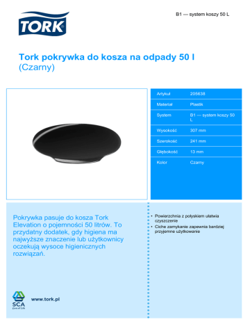 B1 — system koszy 50 L Tork pokrywka do kosza na odpady 50 l (Czarny) Pokrywka pasuje do kosza Tork Elevation o pojemności 50 litrów. To przydatny dodatek, gdy higiena ma najwyższe znaczenie lub użytkownicy oczekują wysoce higienicznych rozwiązań. www.tork.pl Artykuł 205638 Materiał Plastik System B1 — system koszy 50 L Wysokość 307 mm Szerokość 241 mm Głębokość 13 mm Kolor Czarny • Powierzchnia z połyskiem ułatwia czyszczenie • Ciche zamykanie zapewnia bardziej przyjemne użytkowanie B1 — system koszy 50 L Informacje o opakowaniu Opakowanie pojedyncze Opakowanie transportowe Paleta EAN 7322540366686 7322540366686 7322540401745 Sztuki 1 1 154 Opakowania pojedyncze - 1 154 Wysokość 126 mm 126 mm 1914 mm Szerokość 316 mm 316 mm 800 mm Długość 250 mm 250 mm 1200 mm Objętość 10 dm3 10 dm3 1.5 m3 Waga netto 296 g 0.3 kg 45.58 kg Waga brutto 523 g 0.5 kg 80.54 kg Rodzaj opakowania - Carton - Wybierz wkład dopasowany do Twoich potrzeb Tork worki na śmieci, 50L Kontakt SCA Hygiene Sp. z o.o. ul. Puławska 435A 02-801 Warszawa, Polska Tel.: +48 22 543 75 00 Faks: +48 22 543 75 01 Tork jest marką grupy SCA, Svenska Cellulosa Aktiebolaget. Grupa SCA oferuje artykuły higieniczne oraz produkty pochodzenia drzewnego w ponad 100 krajach. Więcej informacji można znaleźć pod adresem www.sca.com www.tork.pl 204060