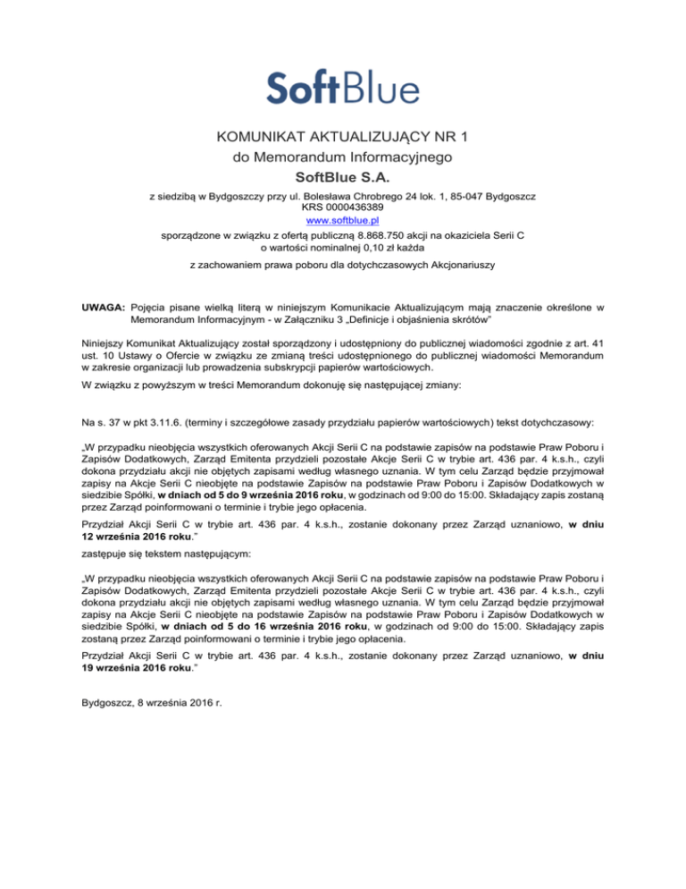 KOMUNIKAT AKTUALIZUJĄCY NR 1 do Memorandum Informacyjnego SoftBlue S.A. z siedzibą w Bydgoszczy przy ul. Bolesława Chrobrego 24 lok. 1, 85-047 Bydgoszcz KRS 0000436389 www.softblue.pl sporządzone w związku z ofertą publiczną 8.868.750 akcji na okaziciela Serii C o wartości nominalnej 0,10 zł każda z zachowaniem prawa poboru dla dotychczasowych Akcjonariuszy UWAGA: Pojęcia pisane wielką literą w niniejszym Komunikacie Aktualizującym mają znaczenie określone w Memorandum Informacyjnym - w Załączniku 3 „Definicje i objaśnienia skrótów” Niniejszy Komunikat Aktualizujący został sporządzony i udostępniony do publicznej wiadomości zgodnie z art. 41 ust. 10 Ustawy o Ofercie w związku ze zmianą treści udostępnionego do publicznej wiadomości Memorandum w zakresie organizacji lub prowadzenia subskrypcji papierów wartościowych. W związku z powyższym w treści Memorandum dokonuję się następującej zmiany: Na s. 37 w pkt 3.11.6. (terminy i szczegółowe zasady przydziału papierów wartościowych) tekst dotychczasowy: „W przypadku nieobjęcia wszystkich oferowanych Akcji Serii C na podstawie zapisów na podstawie Praw Poboru i Zapisów Dodatkowych, Zarząd Emitenta przydzieli pozostałe Akcje Serii C w trybie art. 436 par. 4 k.s.h., czyli dokona przydziału akcji nie objętych zapisami według własnego uznania. W tym celu Zarząd będzie przyjmował zapisy na Akcje Serii C nieobjęte na podstawie Zapisów na podstawie Praw Poboru i Zapisów Dodatkowych w siedzibie Spółki, w dniach od 5 do 9 września 2016 roku, w godzinach od 9:00 do 15:00. Składający zapis zostaną przez Zarząd poinformowani o terminie i trybie jego opłacenia. Przydział Akcji Serii C w trybie art. 436 par. 4 k.s.h., zostanie dokonany przez Zarząd uznaniowo, w dniu 12 września 2016 roku.” zastępuje się tekstem następującym: „W przypadku nieobjęcia wszystkich oferowanych Akcji Serii C na podstawie zapisów na podstawie Praw Poboru i Zapisów Dodatkowych, Zarząd Emitenta przydzieli pozostałe Akcje Serii C w trybie art. 436 par. 4 k.s.h., czyli dokona przydziału akcji nie objętych zapisami według własnego uznania. W tym celu Zarząd będzie przyjmował zapisy na Akcje Serii C nieobjęte na podstawie Zapisów na podstawie Praw Poboru i Zapisów Dodatkowych w siedzibie Spółki, w dniach od 5 do 16 września 2016 roku, w godzinach od 9:00 do 15:00. Składający zapis zostaną przez Zarząd poinformowani o terminie i trybie jego opłacenia. Przydział Akcji Serii C w trybie art. 436 par. 4 k.s.h., zostanie dokonany przez Zarząd uznaniowo, w dniu 19 września 2016 roku.” Bydgoszcz, 8 września 2016 r.