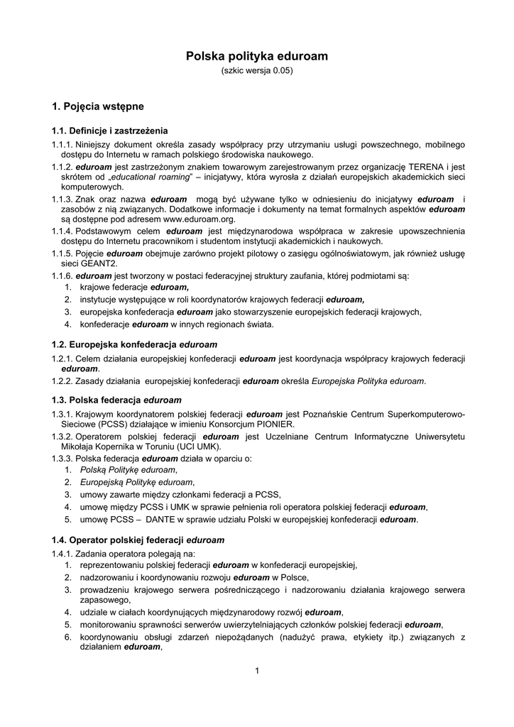 Polska polityka eduroam (szkic wersja 0.05) 1. Pojęcia wstępne 1.1. Definicje i zastrzeżenia 1.1.1. Niniejszy dokument określa zasady współpracy przy utrzymaniu usługi powszechnego, mobilnego dostępu do Internetu w ramach polskiego środowiska naukowego. 1.1.2. eduroam jest zastrzeżonym znakiem towarowym zarejestrowanym przez organizację TERENA i jest skrótem od „educational roaming” – inicjatywy, która wyrosła z działań europejskich akademickich sieci komputerowych. 1.1.3. Znak oraz nazwa eduroam mogą być używane tylko w odniesieniu do inicjatywy eduroam i zasobów z nią związanych. Dodatkowe informacje i dokumenty na temat formalnych aspektów eduroam są dostępne pod adresem www.eduroam.org. 1.1.4. Podstawowym celem eduroam jest międzynarodowa współpraca w zakresie upowszechnienia dostępu do Internetu pracownikom i studentom instytucji akademickich i naukowych. 1.1.5. Pojęcie eduroam obejmuje zarówno projekt pilotowy o zasięgu ogólnoświatowym, jak również usługę sieci GEANT2. 1.1.6. eduroam jest tworzony w postaci federacyjnej struktury zaufania, której podmiotami są: 1. krajowe federacje eduroam, 2. instytucje występujące w roli koordynatorów krajowych federacji eduroam, 3. europejska konfederacja eduroam jako stowarzyszenie europejskich federacji krajowych, 4. konfederacje eduroam w innych regionach świata. 1.2. Europejska konfederacja eduroam 1.2.1. Celem działania europejskiej konfederacji eduroam jest koordynacja współpracy krajowych federacji eduroam. 1.2.2. Zasady działania europejskiej konfederacji eduroam określa Europejska Polityka eduroam. 1.3. Polska federacja eduroam 1.3.1. Krajowym koordynatorem polskiej federacji eduroam jest Poznańskie Centrum SuperkomputerowoSieciowe (PCSS) działające w imieniu Konsorcjum PIONIER. 1.3.2. Operatorem polskiej federacji eduroam jest Uczelniane Centrum Informatyczne Uniwersytetu Mikołaja Kopernika w Toruniu (UCI UMK). 1.3.3. Polska federacja eduroam działa w oparciu o: 1. Polską Politykę eduroam, 2. Europejską Politykę eduroam, 3. umowy zawarte między członkami federacji a PCSS, 4. umowę między PCSS i UMK w sprawie pełnienia roli operatora polskiej federacji eduroam, 5. umowę PCSS – DANTE w sprawie udziału Polski w europejskiej konfederacji eduroam. 1.4. Operator polskiej federacji eduroam 1.4.1. Zadania operatora polegają na: 1. reprezentowaniu polskiej federacji eduroam w konfederacji europejskiej, 2. nadzorowaniu i koordynowaniu rozwoju eduroam w Polsce, 3. prowadzeniu krajowego serwera pośredniczącego i nadzorowaniu działania krajowego serwera zapasowego, 4. udziale w ciałach koordynujących międzynarodowy rozwój eduroam, 5. monitorowaniu sprawności serwerów uwierzytelniających członków polskiej federacji eduroam, 6. koordynowaniu obsługi zdarzeń niepożądanych (nadużyć prawa, etykiety itp.) związanych z działaniem eduroam, 1 7. przyjmowaniu zgłoszeń od nowych członków federacji eduroam, 8. utrzymywaniu serwisu www.eduroam.pl, 9. przygotowywaniu umów między PCSS a członkami federacji. 1.5. Członkowie polskiej federacji eduroam 1.5.1. Członkiem polskiej federacji eduroam może być instytucja posiadająca status: 1. szkoły wyższej, 2. instytutu badawczego. 1.5.2. Podstawowym warunkiem przystąpienia do polskiej federacji eduroam jest wyrażenie zgody na występowanie w roli instytucji udzielającej gościnnego dostępu do Internetu oraz akceptacja postanowień niniejszej polityki. 1.5.3. Każdy członek polskiej federacji eduroam ma prawo do występowania w roli instytucji uwierzytelniającej i tym samym zapewnienia swoim użytkownikom dostępu do Internetu na terenie wszystkich instytucji współpracujących z eduroam. 1.5.4. Obowiązki członków polskiej federacji eduroam Jako instytucja udzielająca gościnnego dostępu do Internetu członek federacji eduroam zobowiązuje się do: 1. bezpłatnego udostępnienia sieci bezprzewodowej prowadzonej zgodnie ze „Specyfikacją Techniczną”, wszystkim osobom, które mogą zostać poprawnie uwierzytelnione przez innych członków eduroam; 2. prowadzenia serwisu WWW pod adresem http://eduroam.(nazwa_domenowa_instytucji), w którym muszą być zawarte podstawowe informacje dla gości w językach polskim i angielskim zgodnie ze „Specyfikacją techniczną”. Jako instytucja uwierzytelniająca członek federacji eduroam zobowiązuje się do: 1. potwierdzania tożsamości zarejestrowanych osób za pomocą serwera uwierzytelniającego; 2. utrzymywania zapisów wszystkich operacji uwierzytelnienia, zgodnie z wymaganiami opisanymi w „Specyfikacji technicznej”; 3. współpracy z operatorem polskiej federacji eduroam w wypadkach naruszenia bezpieczeństwa, etykiety sieciowej, prawa itp.; 4. udzielania wsparcia technicznego zarejestrowanym przez nią osobom pragnącym skorzystać z zasobów eduroam udostępnianych lokalnie i w innych instytucjach biorących udział w projekcie. 1.5.5. Członkowie polskiej federacji eduroam nie będą występować względem siebie z roszczeniami cywilno-prawnymi z tytułu ewentualnych incydentów sieciowych. 1.6. Zasoby eduroam 1.6.1. Przez zasoby eduroam rozumie się punkty (bezprzewodowe i przewodowe) dostępu do sieci, łącznie z mechanizmami uwierzytelniania użytkowników. 1.6.2. Zasoby eduroam muszą być oznakowane logo eduroam, przy czym dopuszczalne jest oznakowanie całych budynków, bądź obszarów w tych budynkach, gdzie sieć jest dostępna. 1.7. Użytkownicy 1.7.1. Użytkownikiem eduroam może być osoba związana z instytucjami uwierzytelniającymi stowarzyszonymi w eduroam. 1.7.2. Użytkownik jest odpowiedzialny za wszelkie działania sieciowe dokonane po uwierzytelnieniu przy pomocy jego danych uwierzytelniających. W przypadku podejrzenia, że dane uwierzytelniające mogły się dostać w ręce osób trzecich, użytkownik jest zobowiązany do niezwłocznego zawiadomienia o tym fakcie administratora w swojej instytucji macierzystej. 1.7.3. Uży