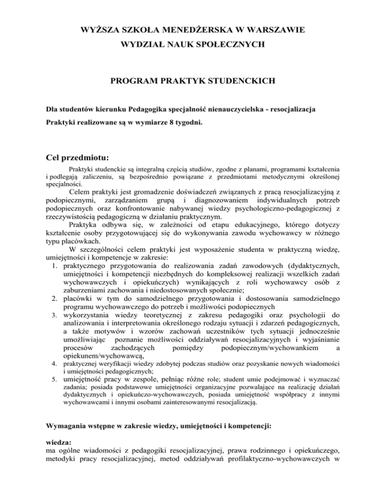 WYŻSZA SZKOŁA MENEDŻERSKA W WARSZAWIE WYDZIAŁ NAUK SPOŁECZNYCH PROGRAM PRAKTYK STUDENCKICH Dla studentów kierunku Pedagogika specjalność nienauczycielska - resocjalizacja Praktyki realizowane są w wymiarze 8 tygodni. Cel przedmiotu: Praktyki studenckie są integralną częścią studiów, zgodne z planami, programami kształcenia i podlegają zaliczeniu, są bezpośrednio powiązane z przedmiotami metodycznymi określonej specjalności. Celem praktyki jest gromadzenie doświadczeń związanych z pracą resocjalizacyjną z podopiecznymi, zarządzaniem grupą i diagnozowaniem indywidualnych potrzeb podopiecznych oraz konfrontowanie nabywanej wiedzy psychologiczno-pedagogicznej z rzeczywistością pedagogiczną w działaniu praktycznym. Praktyka odbywa się, w zależności od etapu edukacyjnego, którego dotyczy kształcenie osoby przygotowującej się do wykonywania zawodu wychowawcy w różnego typu placówkach. W szczególności celem praktyki jest wyposażenie studenta w praktyczną wiedzę, umiejętności i kompetencje w zakresie: 1. praktycznego przygotowania do realizowania zadań zawodowych (dydaktycznych, umiejętności i kompetencji niezbędnych do kompleksowej realizacji wszelkich zadań wychowawczych i opiekuńczych) wynikających z roli wychowawcy osób z zaburzeniami zachowania i niedostosowanych społecznie; 2. placówki w tym do samodzielnego przygotowania i dostosowania samodzielnego programu wychowawczego do potrzeb i możliwości podopiecznych 3. wykorzystania wiedzy teoretycznej z zakresu pedagogiki oraz psychologii do analizowania i interpretowania określonego rodzaju sytuacji i zdarzeń pedagogicznych, a także motywów i wzorów zachowań uczestników tych sytuacji jednocześnie umożliwiając poznanie możliwości oddziaływań resocjalizacyjnych i wyjaśnianie procesów zachodzących pomiędzy podopiecznym/wychowankiem a opiekunem/wychowawcą, 4. praktycznej weryfikacji wiedzy zdobytej podczas studiów oraz pozyskanie nowych wiadomości i umiejętności pedagogicznych; 5. umiejętność pracy w zespole, pełniąc różne role; student umie podejmować i wyznaczać zadania; posiada podstawowe umiejętności organizacyjne pozwalające na realizację działań dydaktycznych i opiekuńczo-wychowawczych, posiada umiejętność współpracy z innymi wychowawcami i innymi osobami zainteresowanymi resocjalizacją. Wymagania wstępne w zakresie wiedzy, umiejętności i kompetencji: wiedza: ma ogólne wiadomości z pedagogiki resocjalizacyjnej, prawa rodzinnego i opiekuńczego, metodyki pracy resocjalizacyjnej, metod oddziaływań profilaktyczno-wychowawczych w środowisku, psychologii nieprzystosowania społecznego, diagnostyki resocjalizacyjnej, systemów resocjalizacyjnych w Europie i na Świecie i subkultur młodzieżowych; umiejętności: zastosowania wiedzy w pracy zespołowej, wypowiadania się z zakresu resocjalizacji, wyszukiwania informacji, dokonywania ich analizy oraz krytycznego odniesienia się do nich kompetencje: elastyczność, gotowość do uczenia się, myślenie analityczne, organizacja pracy własnej, otwartość na zmiany W trakcie praktyki następuje kształtowanie kompetencji dydaktycznych i opiekuńczowychowawczych przez: Treści programowe: 1) zapoznanie się ze specyfiką placówki, w której praktyka jest odbywana, w szczególności poznanie realizowanych przez nią zadań dydaktycznych i opiekuńczo-wychowawczych, sposobu funkcjonowania, organizacji pracy, pracowników, uczestników procesów pedagogicznych oraz prowadzonej dokumentacji; 2) obserwowanie: a) zorganizowanej i podejmowanej spontanicznie aktywności formalnych i nieformalnych grup uczniów, b) aktywności poszczególnych podopiecznych, w tym podopiecznych ze specjalnymi potrzebami edukacyjnymi, c) interakcji dorosłych (nauczyciel, wychowawca) – podopieczny/wychowanek oraz interakcji między podopiecznymi (w tym samym i w różnym wieku), d) procesów komunikowania interpersonalnego i społecznego w grupach wychowawczych, ich prawidłowości i zakłóceń e) czynności podejmowanych przez opiekuna praktyk oraz prowadzonych przez niego zajęć, f) sposobu integrowania przez opiekuna praktyk różnej działalności, w tym opiekuńczowychowawczej, dydaktycznej, pomocowej i terapeutycznej g) dynamiki grupy, ról pełnionych przez uczestników grupy, zachowania i postaw podopiecznych, h) działań podejmowanych przez opiekuna praktyk na rzecz zapewnienia bezpieczeństwa i zachowania dyscypliny w grupie; 3) współdziałanie z opiekunem praktyk w: a) sprawowaniu opieki i nadzoru nad grupą oraz zapewnianiu bezpieczeństwa, b) podejmowaniu działań wychowawczych wynikających z zastanych sytuacji, c) prowadzeniu zorganizowanych zajęć wychowawczych, d) podejmowaniu działań na rzecz podopiecznych (indywidualnych potrzeb) Organizacja praktyk: W trakcie praktyk studentowi (słuchaczowi) zapewnia się następujące formy aktywności: 1) wizyty w placówkach resocjalizacyjnych (zakładach poprawczych, schroniskach dla nieletnich, ośrodkach szkolno-wychowawczych, pogotowiu opiekuńczym, ośrodkach profilaktyki i terapii uzależnień, aresztach śledczych i zakłady karnych dla dorosłych, ośrodkach diagnostycznych, ośrodkach adaptacji społecznej); 2) obserwowanie zajęć; 3) asystowanie wychowawcy/opiekunowi prowadzącemu zajęcia (w miarę możliwości); 4) samodzielne prowadzenie niektórych zajęć; 5) planowanie i omawianie zajęć prowadzonych przez siebie i innych (wychowawców/opiekunów, nauczycieli, studentów, podopiecznych). Metody oceny Podstawą zaliczenia praktyki jest wypełnienie obowiązków wynikających z programu oraz udokumentowanie przebiegu praktyki. Osoba prowadząca studenta podczas praktyk indywidualnych praktyk z Placówki potwierdza odbycie przez studenta praktyki i ocenia ją, dokonując wpisu w dzienniku praktyk pedagogicznych oraz karcie praktykanta. W opinii o przebiegu praktyki powinny być wskazane osiągnięcia studenta oraz jego braki i trudn