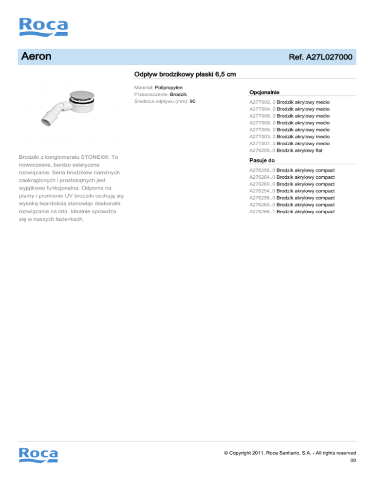 Aeron Ref. A27L027000 Odpływ brodzikowy płaski 6,5 cm Materiał: Polipropylen Przeznaczenie: Brodzik Średnica odpływu (mm): 90 Brodziki z konglomeratu STONEX®. To nowoczesne, bardzo estetyczne rozwiązanie. Seria brodzików narożnych zaokrąglonych i prostokątnych jest wyjątkowo funkcjonalna. Odporne na plamy i promienie UV brodziki cechują się wysoką twardością stanowiąc doskonałe rozwiązanie na lata. Idealnie sprawdza się w naszych łazienkach. Opcjonalnie A27T002..0 Brodzik akrylowy medio A27T004..0 Brodzik akrylowy medio A27T006..0 Brodzik akrylowy medio A27T008..0 Brodzik akrylowy medio A27T005..0 Brodzik akrylowy medio A27T003..0 Brodzik akrylowy medio A27T007..0 Brodzik akrylowy medio A276259..0 Brodzik akrylowy flat Pasuje do A276256..0 Brodzik akrylowy compact A276264..0 Brodzik akrylowy compact A276260..0 Brodzik akrylowy compact A276254..0 Brodzik akrylowy compact A276258..0 Brodzik akrylowy compact A276265..0 Brodzik akrylowy compact A276266..1 Brodzik akrylowy compact © Copyright 2011, Roca Sanitario, S.A. - All rights reserved 00