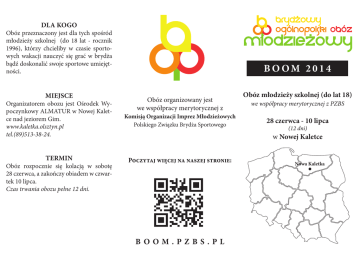 DLA KOGO Obóz przeznaczony jest dla tych spośród młodzieży szkolnej (do 18 lat - rocznik 1996), którzy chcieliby w czasie sportowych wakacji nauczyć się grać w brydża bądź doskonalić swoje sportowe umiejętności. MIEJSCE B o1o Obóz organizowany jest we współpracy merytorycznej z Organizatorem obozu jest Ośrodek Wypoczynkowy ALMATUR w Nowej Kaletce nad jeziorem Gim. www.kaletka.olsztyn.pl tel.(89)513-38-24. Komisją Organizacji Imprez Młodzieżowych Polskiego Związku Brydża Sportowego TERMIN Poczytaj więcej na naszej stronie: Obóz rozpocznie się kolacją w sobotę 28 czerwca, a zakończy obiadem w czwartek 10 lipca. Czas trwania obozu pełne 12 dni. brydzowy B ogolnopolski oboz oo l mlodziezowy BOOM 2014 Obóz młodzieży szkolnej (do lat 18) we współpracy merytorycznej z PZBS 28 czerwca - 10 lipca (12 dni) w Nowej Kaletce BOOM.PZBS.PL Nowa Kaletka L I C Z BA M I E J S C O G R A N I C Z O NA ! D E C Y D U J E KO L E J N O Ś Ć Z G Ł O S Z E Ń ! ZAKWATEROWANIE Zakwaterowanie w dwóch standardach w zależności od ceny: A) 950 zł od osoby w piętrowym pawilonie w pokojach kilkuosobowych z węzłem sanitarnym (WC, prysznic, umywalka) B) 800 zł od osoby w wolno-stojących domkach bez sanitariatu i wody (Toi-toi w wystarczających ilościach oraz umywalki „pod chmurką” z dostępem do dodatkowych sanitariatów w pawilonie) WYŻYWIENIE Codziennie trzy pełnowartościowe posiłki. Ponadto oscylacyjny dodatkowy podwieczorek. Śniadania i kolacje w formie szwedzkiego stołu. PLAN DNIA Codziennie po śniadaniu zajęcia szkoleniowe z brydża sportowego w 4 lub 5 grupach zaawansowania (w tym dla nieumiejących grać). Po obiedzie zajęcia sportowe, gry planszowe, wakacyjna liga brydżowa, mecze z udziałem zaproszonych gości. Po kolacji codzienne turnieje z podziałami na finały i rozmaitymi systemami liczenia wyników. W programie sportowym: przebieżki poranne prowadzone przez Adriana Bakalarza, turnieje sportowe, techniki relaksacyjne, mecz „w coś”: my kontra ktoś, opiekunowie kontra uczestnicy, plażowanie i pływanie w jeziorze. W programie kulturalno-rozrywkowym: wycieczki (w tym do Parku Linowego), ogniska, pierwsza w historii próba stworzenia chóru brydżystów i na pewno jakieś karaoke… OKOLICA Spokojna i bezpieczna okolica pośród mazurskich lasów nad przepięknym, płytkim i piaszczystym jeziorem Gim! Na czas Obozu ośrodek zostanie wyłączony z normalnego użytkowania. Na terenie plaża z pomostem i boiska do koszykówki, siatkówki plażowej, badmintona i mini-piłki nożnej. W pobliżu pełnowymiarowe boisko miejscowego klubu oraz Park Linowy. KADRA W kadrze brydżowej – gwiazdozbiór! W kadrze poza-brydżowej: lekarz, ratownik, pielęgniarka i opiekunowie pedagogiczni zgodnie z przepisami Ministerstwa Edukacji Narodowej. Oraz Adrian Bakalarz i Janusz Maliszewski (kierownik BOOM). SZKOLENIOWCY Pierwsze 6 dni: Antoni Zdzienicki, Leszek Nowak, Roland Lippik, Janusz Maliszewski, Halina i Grzegorz Kaleta, Ryszard Kiełczewski oraz zaproszeni goście Drugie 6 dni: Marek Markowski, Mirosław Cichocki, Marek Wójcicki, Marek Małysa, Ryszard Kiełczewski i zaproszeni goście SĘDZIOWIE Jerzy Greś, Michał Klichowicz, Marcin Wasłowicz, Jerzy Matura TRANSPORT Istnieje możliwość zorganizowania transportu wyczarterowanymi autokarami z wybranych kierunków z opcją łączenia grup na trasie. Niezależnie od środka transportu, dojazd na koszt własny. ZGŁOSZENIA Zgłoszenia grupowe i indywidualne, z zastrzeżeniem w jakim standardzie, należy kierować mailem na adres [email protected] Decyduje kolejność zgłoszeń. WIĘCEJ? Dodatkowe informacje o obozie można uzyskać u kierownika obozu: Janusz Maliszewski tel: 605-655-382 mail: [email protected] B o1o