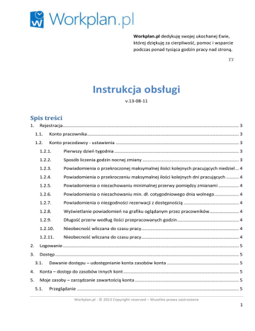 Workplan.pl dedykuję swojej ukochanej Ewie, której dziękuję za cierpliwośd, pomoc i wsparcie podczas ponad tysiąca godzin pracy nad stroną. TS Instrukcja obsługi v.13-08-11 Spis treści 1. Rejestracja ......................................................................................................................................... 3 1.1. Konto pracownika ...................................................................................................................... 3 1.2. Konto pracodawcy - ustawienia ................................................................................................ 3 1.2.1. Pierwszy dzieo tygodnia ................................................................................................. 3 1.2.2. Sposób liczenia godzin nocnej zmiany ........................................................................... 3 1.2.3. Powiadomienia o przekroczonej maksymalnej ilości kolejnych pracujących niedziel ... 4 1.2.4. Powiadomienia o przekroczeniu maksymalnej ilości kolejnych dni pracujących .......... 4 1.2.5. Powiadomienia o niezachowaniu minimalnej przerwy pomiędzy zmianami ................ 4 1.2.6. Powiadomienia o niezachowaniu min. dł. cotygodniowego dnia wolnego ................... 4 1.2.7. Powiadomienia o niezgodności rezerwacji z dostępnością ........................................... 4 1.2.8. Wyświetlanie powiadomieo na grafiku oglądanym przez pracowników....................... 4 1.2.9. Długośd przerw według ilości przepracowanych godzin ................................................ 4 1.2.10. Nieobecnośd wliczana do czasu pracy............................................................................ 4 1.2.11. Nieobecnośd wliczana do czasu pracy............................................................................ 4 2. Logowanie ......................................................................................................................................... 5 3. Dostęp ............................................................................................................................................... 5 3.1. Dawanie dostępu – udostępnianie konta zasobów konta ........................................................ 5 4. Konta – dostęp do zasobów innych kont .......................................................................................... 5 5. Moje zasoby – zarządzanie zawartością konta ................................................................................. 5 5.1. Przeglądanie .............................................................................................................................. 5 Workplan.pl - © 2013 Copyright reserved – Wszelkie prawa zastrzeżone 1 5.2. 6. Kategorie zasobów – edycja zawartości ........................................................................................... 6 6.1. 8. Plany pracy - dyspozycyjnośd..................................................................................................... 6 6.1.1. Nawigacja – wybór miesiąca .......................................................................................... 6 6.1.2. Legenda – co i jak wpisywad ........................................................................................... 7 6.1.3. Załączniki do dyspozycyjności ........................................................................................ 7 6.2. 7. Dodawanie nowych zasobów .................................................................................................... 6 Plany pracy – grafik.................................................................................................................... 7 6.2.1. Aktywacja pracowników – dodawanie do grafiku ......................................................... 7 6.2.2. Dezaktywacja pracowników ........................................................................................... 8 6.2.3. Nawigacja – numery tygodni .......................................................................................... 8 6.2.4. Podsumowanie wyświetlanego tygodnia i miesiąca ...................................................... 8 6.2.5. Ilośd i rodzaj zmian w miesiącu ...................................................................................... 9 6.2.6. Status grafiku tygodnia – w budowie, roboczy i gotowy .............................................. 9 6.2.7. Kolejnośd wyświetlania pracowników – sortowanie ..................................................... 9 6.2.8. Obszary grafiku – obecny tydzieo i sąsiadujące dni ....................................................... 9 6.2.9. Wykresy obłożenia czasu pracownikami – ile osób w danej godzinie w pracy ........... 10 6.2.10. Wyświetlanie powiadomieo – ustawienia tymczasowe .............................................. 10 6.2.11. Legenda – wskazówki i skróty ...................................................................................... 10 6.2.12. Rezerwacja czasu – wypełnianie grafiku godzinami .................................................... 11 6.2.13. Nocne zmiany ............................................................................................................... 11 6.3. Wydarzenia .............................................................................................................................. 11 6.4. Sondaże.................................................................................................................................... 11 6.5. Forum....................................................................................................................................... 12 6.6. Dokumenty .............................................................................................................................. 12 Komentarze i oceny .......................................................................................................................