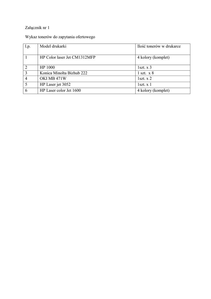 Załącznik nr 1 Wykaz tonerów do zapytania ofertowego l.p. Model drukarki Ilość tonerów w drukarce 1 HP Color laser Jet CM1312MFP 4 kolory (komplet) 2 3 4 5 6 HP 1000 Konica Minolta Bizhub 222 OKI MB 471W HP Laser jet 3052 HP Laser color Jet 1600 1szt. x 3 1 szt. x 8 1szt. x 2 1szt. x 1 4 kolory (komplet)