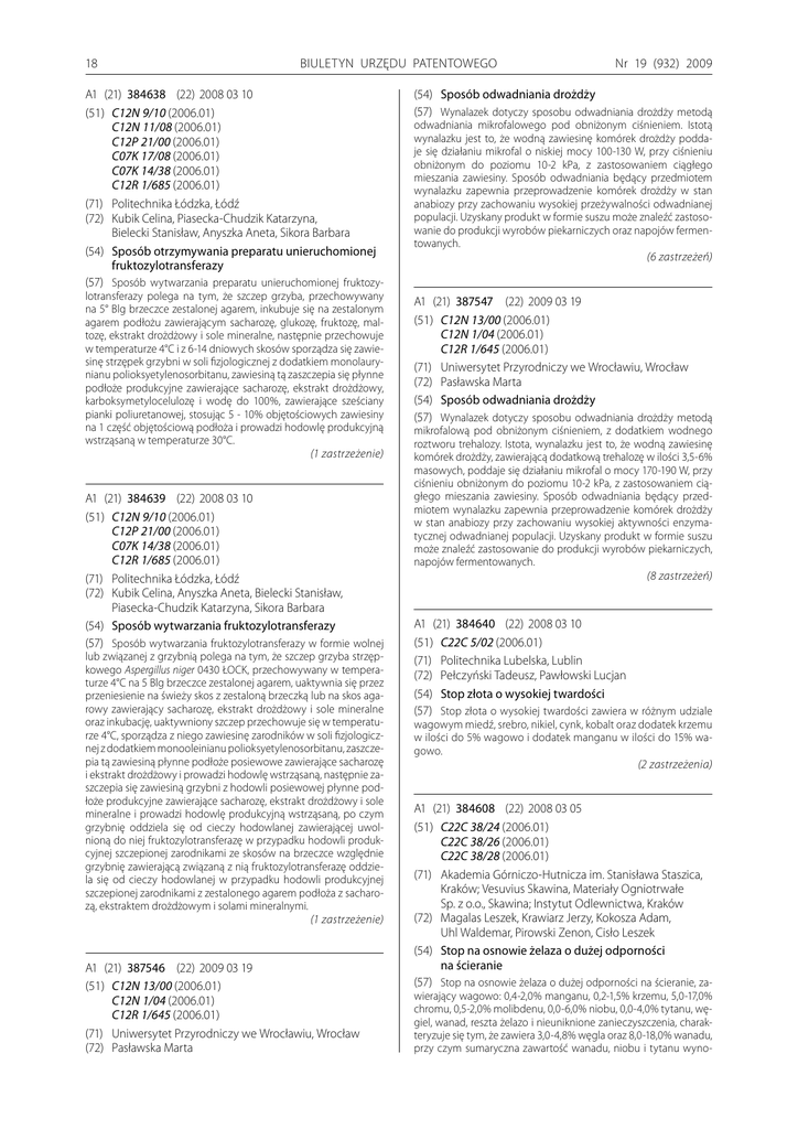 18 BIULETYN URZĘDU PATENTOWEGO Nr 19 (932) 2009 A1 (21) 384638 (22) 2008 03 10 (51) C12N 9/10 (2006.01) C12N 11/08 (2006.01) C12P 21/00 (2006.01) C07K 17/08 (2006.01) C07K 14/38 (2006.01) C12R 1/685 (2006.01) (71) Politechnika Łódzka, Łódź (72) Kubik Celina, Piasecka-Chudzik Katarzyna, Bielecki Stanisław, Anyszka Aneta, Sikora Barbara (54) Sposób otrzymywania preparatu unieruchomionej fruktozylotransferazy (57) Sposób wytwarzania preparatu unieruchomionej fruktozy- (54) Sposób odwadniania drożdży (57) Wynalazek dotyczy sposobu odwadniania drożdży metodą lotransferazy polega na tym, że szczep grzyba, przechowywany na 5° Blg brzeczce zestalonej agarem, inkubuje się na zestalonym agarem podłożu zawierającym sacharozę, glukozę, fruktozę, maltozę, ekstrakt drożdżowy i sole mineralne, następnie przechowuje w temperaturze 4°C i z 6-14 dniowych skosów sporządza się zawiesinę strzępek grzybni w soli fizjologicznej z dodatkiem monolaurynianu polioksyetylenosorbitanu, zawiesiną tą zaszczepia się płynne podłoże produkcyjne zawierające sacharozę, ekstrakt drożdżowy, karboksymetylocelulozę i wodę do 100%, zawierające sześciany pianki poliuretanowej, stosując 5 - 10% objętościowych zawiesiny na 1 część objętościową podłoża i prowadzi hodowlę produkcyjną wstrząsaną w temperaturze 30°C. (1 zastrzeżenie) A1 (21) 387547 (22) 2009 03 19 (51) C12N 13/00 (2006.01) C12N 1/04 (2006.01) C12R 1/645 (2006.01) (71) Uniwersytet Przyrodniczy we Wrocławiu, Wrocław (72) Pasławska Marta (54) Sposób odwadniania drożdży (57) Wynalazek dotyczy sposobu odwadniania drożdży metodą A1 (21) 384639 (22) 2008 03 10 (51) C12N 9/10 (2006.01) C12P 21/00 (2006.01) C07K 14/38 (2006.01) C12R 1/685 (2006.01) (71) Politechnika Łódzka, Łódź (72) Kubik Celina, Anyszka Aneta, Bielecki Stanisław, Piasecka-Chudzik Katarzyna, Sikora Barbara (54) Sposób wytwarzania fruktozylotransferazy (57) Sposób wytwarzania fruktozylotransferazy w formie wolnej lub związanej z grzybnią polega na tym, że szczep grzyba strzępkowego Aspergillus niger 0430 ŁOCK, przechowywany w temperaturze 4°C na 5 Blg brzeczce zestalonej agarem, uaktywnia się przez przeniesienie na świeży skos z zestaloną brzeczką lub na skos agarowy zawierający sacharozę, ekstrakt drożdżowy i sole mineralne oraz inkubację, uaktywniony szczep przechowuje się w temperaturze 4°C, sporządza z niego zawiesinę zarodników w soli fizjologicznej z dodatkiem monooleinianu polioksyetylenosorbitanu, zaszczepia tą zawiesiną płynne podłoże posiewowe zawierające sacharozę i ekstrakt drożdżowy i prowadzi hodowlę wstrząsaną, następnie zaszczepia się zawiesiną grzybni z hodowli posiewowej płynne podłoże produkcyjne zawierające sacharozę, ekstrakt drożdżowy i sole mineralne i prowadzi hodowlę produkcyjną wstrząsaną, po czym grzybnię oddziela się od cieczy hodowlanej zawierającej uwolnioną do niej fruktozylotransferazę w przypadku hodowli produkcyjnej szczepionej zarodnikami ze skosów na brzeczce względnie grzybnię zawierającą związaną z nią fruktozylotransferazę oddziela się od cieczy hodowlanej w przypadku hodowli produkcyjnej szczepionej zarodnikami z zestalonego agarem podłoża z sacharozą, ekstraktem drożdżowym i solami mineralnymi. (1 zastrzeżenie) A1 (21) 387546 (22) 2009 03 19 (51) C12N 13/00 (2006.01) C12N 1/04 (2006.01) C12R 1/645 (2006.01) (71) Uniwersytet Przyrodniczy we Wrocławiu, Wrocław (72) Pasławska Marta odwadniania mikrofalowego pod obniżonym ciśnieniem. Istotą wynalazku jest to, że wodną zawiesinę komórek drożdży poddaje się działaniu mikrofal o niskiej mocy 100-130 W, przy ciśnieniu obniżonym do poziomu 10-2 kPa, z zastosowaniem ciągłego mieszania zawiesiny. Sposób odwadniania będący przedmiotem wynalazku zapewnia przeprowadzenie komórek drożdży w stan anabiozy przy zachowaniu wysokiej przeżywalności odwadnianej populacji. Uzyskany produkt w formie suszu może znaleźć zastosowanie do produkcji wyrobów piekarniczych oraz napojów fermentowanych. (6 zastrzeżeń) mikrofalową pod obniżonym ciśnieniem, z dodatkiem wodnego roztworu trehalozy. Istota, wynalazku jest to, że wodną zawiesinę komórek drożdży, zawierającą dodatkową trehalozę w ilości 3,5-6% masowych, poddaje się działaniu mikrofal o mocy 170-190 W, przy ciśnieniu obniżonym do poziomu 10-2 kPa, z zastosowaniem ciągłego mieszania zawiesiny. Sposób odwadniania będący przedmiotem wynalazku zapewnia przeprowadzenie komórek drożdży w stan anabiozy przy zachowaniu wysokiej aktywności enzymatycznej odwadnianej populacji. Uzyskany produkt w formie suszu może znaleźć zastosowanie do produkcji wyrobów piekarniczych, napojów fermentowanych. (8 zastrzeżeń) A1 (21) 384640 (22) 2008 03 10 (51) C22C 5/02 (2006.01) (71) Politechnika Lubelska, Lublin (72) Pełczyński Tadeusz, Pawłowski Lucjan (54) Stop złota o wysokiej twardości (57) Stop złota o wysokiej twardości zawiera w różnym udziale wagowym miedź, srebro, nikiel, cynk, kobalt oraz dodatek krzemu w ilości do 5% wagowo i dodatek manganu w ilości do 15% wagowo. (2 zastrzeżenia) A1 (21) 384608 (22) 2008 03 05 (51) C22C 38/24 (2006.01) C22C 38/26 (2006.01) C22C 38/28 (2006.01) (71) Akademia Górniczo-Hutnicza im. Stanisława Staszica, Kraków; Vesuvius Skawina, Materiały Ogniotrwałe Sp. z o.o., Skawina; Instytut Odlewnictwa, Kraków (72) Magalas Leszek, Krawiarz Jerzy, Kokosza Adam, Uhl Waldemar, Pirowski Zenon, Cisło Leszek (54) Stop na osnowie żelaza o dużej odporności na ścieranie (57) Stop na osnowie żelaza o dużej odporności na ścieranie, zawierający wagowo: 0,4-2,0% manganu, 0,2-1,5% krzemu, 5,0-17,0% chromu, 0,5-2,0% molibdenu, 0,0-6,0% niobu, 0,0-4,0% tytanu, węgiel, wanad, reszta żelazo i nieuniknione zanieczyszczenia, charakteryzuje się tym, że zawiera 3,0-4,8% węgla oraz 8,0-18,0% wanadu, przy czym sumaryczna zawartość wanadu, niobu i tytanu wyno- Nr 1
