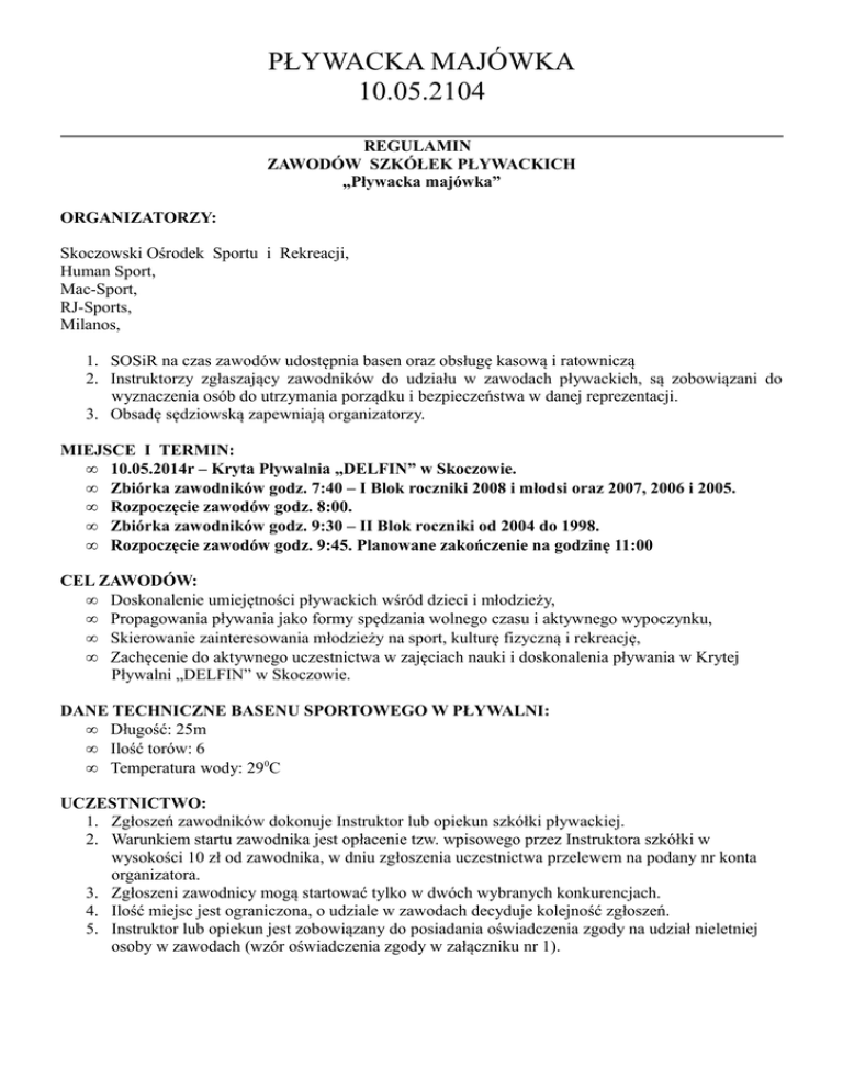 PŁYWACKA MAJÓWKA 10.05.2104 REGULAMIN ZAWODÓW SZKÓŁEK PŁYWACKICH „Pływacka majówka” ORGANIZATORZY: Skoczowski Ośrodek Sportu i Rekreacji, Human Sport, Mac-Sport, RJ-Sports, Milanos, 1. SOSiR na czas zawodów udostępnia basen oraz obsługę kasową i ratowniczą 2. Instruktorzy zgłaszający zawodników do udziału w zawodach pływackich, są zobowiązani do wyznaczenia osób do utrzymania porządku i bezpieczeństwa w danej reprezentacji. 3. Obsadę sędziowską zapewniają organizatorzy. MIEJSCE I TERMIN: • 10.05.2014r – Kryta Pływalnia „DELFIN” w Skoczowie. • Zbiórka zawodników godz. 7:40 – I Blok roczniki 2008 i młodsi oraz 2007, 2006 i 2005. • Rozpoczęcie zawodów godz. 8:00. • Zbiórka zawodników godz. 9:30 – II Blok roczniki od 2004 do 1998. • Rozpoczęcie zawodów godz. 9:45. Planowane zakończenie na godzinę 11:00 CEL ZAWODÓW: • Doskonalenie umiejętności pływackich wśród dzieci i młodzieży, • Propagowania pływania jako formy spędzania wolnego czasu i aktywnego wypoczynku, • Skierowanie zainteresowania młodzieży na sport, kulturę fizyczną i rekreację, • Zachęcenie do aktywnego uczestnictwa w zajęciach nauki i doskonalenia pływania w Krytej Pływalni „DELFIN” w Skoczowie. DANE TECHNICZNE BASENU SPORTOWEGO W PŁYWALNI: • Długość: 25m • Ilość torów: 6 • Temperatura wody: 290C UCZESTNICTWO: 1. Zgłoszeń zawodników dokonuje Instruktor lub opiekun szkółki pływackiej. 2. Warunkiem startu zawodnika jest opłacenie tzw. wpisowego przez Instruktora szkółki w wysokości 10 zł od zawodnika, w dniu zgłoszenia uczestnictwa przelewem na podany nr konta organizatora. 3. Zgłoszeni zawodnicy mogą startować tylko w dwóch wybranych konkurencjach. 4. Ilość miejsc jest ograniczona, o udziale w zawodach decyduje kolejność zgłoszeń. 5. Instruktor lub opiekun jest zobowiązany do posiadania oświadczenia zgody na udział nieletniej osoby w zawodach (wzór oświadczenia zgody w załączniku nr 1). PŁYWACKA MAJÓWKA 10.05.2104 GRUPY WIEKOWE: 1. CHŁOPCY, DZIEWCZĘTA rocznik 2008 i młodsi oraz rocznik 2007 i 2006 • pływanie z przyrządami 25 m, • styl dowolny 25 m, 2. CHŁOPCY, DZIEWCZĘTA rocznik 2005 • styl klasyczny 25 m, • styl grzbietowy 25 m, • styl dowolny 25 m 4. CHŁOPCY, DZIEWCZĘTA rocznik 2004 • styl klasyczny 25 m, • styl grzbietowy 25 m, • styl dowolny 25 m 4. CHŁOPCY, DZIEWCZĘTA rocznik 2003, • styl klasyczny 50 m, • styl dowolny 50 m. • styl grzbietowy 50 m. 5. CHŁOPCY, DZIEWCZĘTA rocznik 2002 i2001, • styl klasyczny 50 m, • styl dowolny 50 m • styl motylkowy 25 m. 6. Rocznik 2000 i starsi, • styl motylkowy 50 m, • styldowolny 50 m. KOLEJNOŚĆ ROZGRYWANIA KONKURENCJI: • pływanie z przyrządami 2008 i młodsi, • styl dowolny, • styl klasyczny, • styl grzbietowy, • styl motylkowy. NAGRODY DLA ZAWODNIKÓW: • Pierwszych trzech zawodników w każdej kategorii wiekowej i w każdym stylu pływackim otrzymuje dyplom oraz medal. BEZPIECZEŃSTWO: 1. Na hali basenowej w trakcie zawodów może jednocześnie przebywać maksymalnie 220 osób w tym 180 zawodników. 2. Za porządek i ład w trakcie zawodów, są odpowiedzialni Instruktorzy i osoby wyznaczone do opieki. Łączna ilość opiekunów nie może przekraczać 40 osób. 3. Podczas zawodów pływackich, pełniący dyżur Ratownicy Krytej Pływalni „DELFIN”, prowadzą czynności zgodnie ze swoimi obowiązkami służbowymi. POSTANOWIENIA KOŃCOWE: • Wszystkie konkurencje rozgrywane są osobno dla dziewcząt i chłopców, • Dodatkowo podczas zawodów pływackich, zawodników oraz osoby towarzyszące obowiązuje Regulamin Krytej Pływalni „DELFIN”, a w szczególności Regulamin korzystania z Basenu, PŁYWACKA MAJÓWKA 10.05.2104 • Po dokonaniu zgłoszenia do zawodów nie będą możliwe jakiekolwiek zmiany dotyczące startów zawodników; dopisywanie, zamiana itp., • Zgłoszenie do zawodów jest równoznaczne z akceptacją postanowień niniejszego regulaminu, • Prowadzącym zawody jest: W SPRAWACH SPORNYCH, NIE UJĘTYCH WNINIEJSZYM REGULAMINIE OSTATECZNĄ DECYZJĘ PODEJMUJĄORGANIZATORZY