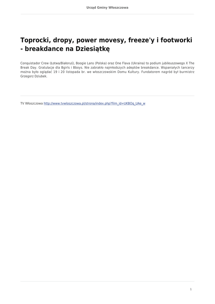 Urząd Gminy Włoszczowa Toprocki, dropy, power movesy, freeze'y i footworki - breakdance na Dziesiątkę Conquistador Crew (Łotwa/Białoruś), Boogie Lans (Polska) oraz One Flava (Ukraina) to podium jubileuszowego X The Break Day. Gratulacje dla Bgirls i Bboys. Nie zabrakło najmłodszych adeptów breakdance. Wspaniałych tancerzy można było oglądać 19 i 20 listopada br. we włoszczowskim Domu Kultury. Fundatorem nagród był burmistrz Grzegorz Dziubek. TV Włoszczowa http://www.tvwloszczowa.pl/strona/index.php?film_id=UKBOq_UAe_w 1