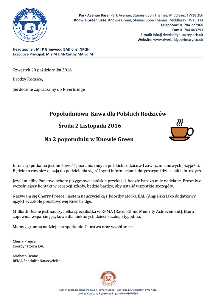 Park Avenue Base: Park Avenue, Staines upon Thames, Middlesex TW18 2EF Knowle Green Base: Knowle Green, Staines upon Thames, Middlesex TW18 1AJ Telephone: 01784 227960 Fax: 01784 463793 E-mail: [email protected] Website: www.riverbridgeprimary.co.uk Headteacher: Mr P Grimwood BA(hons);NPQH Executive Principal: Mrs M E McCarthy MA Ed.M Czwartek 20 października 2016 Drodzy Rodzice, Serdecznie zapraszamy do Riverbridge Popołudniowa Kawa dla Polskich Rodziców Środa 2 Listopada 2016 Na 2 popotudniu w Knowle Green Intencją spotkania jest możliwość poznania innych polskich rodziców I zawiązania nowych pizyjażni. Będzie to również okazją do podzielenia się różnymi informacjami, dotycsącymi dzieci jak I dorosłych. Jeżeli mieliby Panstwo ochote pizygotowac polskie przekąski, bedzie bardzo mile widziane, Prosmiy o wcześniejszy kontakt w recepcji szkoły, bedzie bardzo, aby ustalić wszystkie szczegóły. Nazywam się Cherry Preece i jestem nauczycielką i koordynatorką EAL (Angielski jako dodatkowy język) w szkołe podstawowej Riverbridge. Midhath Deane jest nauczycielka specjalistka w REMA (Race, Ethnic Minority Achievement), która zapewnia wsparcie językowe dla niektórych dzieci kazdego tygodnia. Mamy ogromną nadzieje na spotkanie Panstwa oraz współprace. Cherry Preece Koordynatorka EAL Midhath Deane REMA Specialist Nauczycielka Lumen Learning Trust c/o Saxon Primary School, Briar Road, Shepperton TW17 0JB Limited Company Registered England No 08670599