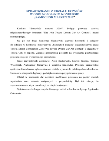SPRAWOZDANIE Z UDZIAŁU UCZNIÓW W OGÓLNOPOLSKIM KONKURSIE „SAMOCHÓD MARZEŃ 2016” Konkurs "Samochód marzeń 2016", będący pierwszą częścią międzynarodowego konkursu "The 10th Toyota Dream Car Art Contest", został rozstrzygnięty. Już po raz drugi Samorząd Uczniowski zaprosił koleżanki i kolegów do udziału w konkursie plastycznym „Samochód marzeń” organizowanym przez Toyota Motor Corporation „The 9th Toyota Dream Car Art Contest” z siedzibą w Toyota City w Japonii. Zadanie konkursowe polegało na wykonaniu plastycznego projektu swojego wymarzonego samochodu. Prace przygotowali uczniowie: Aron Budkowski, Marcel Tanona, Tomasz Wieczorek, Aleksander Skoczylas i Wiktoria Skoczylas. Projekty uczniowskie opatrzone formularzem zgłoszeniowym zostały wysłane do polskiego biura konkursu. Uczniowie otrzymali dyplomy- podziękowania za przygotowanie pracy. Udział w konkursie dał uczniom możliwość przelania na papier swoich wyobrażeń oraz marzeń związanych z przyszłością. Był też okazją do zaprezentowania się w rywalizacji na etapie krajowym. Opiekunem szkolnego zespołu biorącego udział w konkursie była p. Agnieszka Ostrowska.