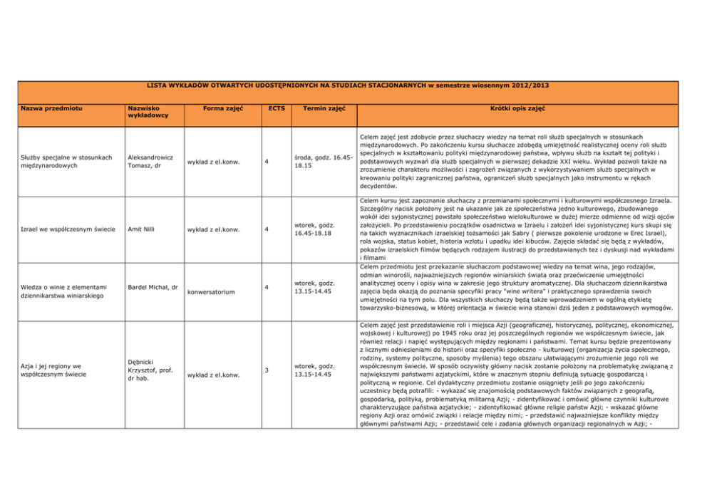 LISTA WYKŁADÓW OTWARTYCH UDOSTĘPNIONYCH NA STUDIACH STACJONARNYCH w semestrze wiosennym 2012/2013 Nazwa przedmiotu Służby specjalne w stosunkach międzynarodowych Izrael we współczesnym świecie Wiedza o winie z elementami dziennikarstwa winiarskiego Azja i jej regiony we współczesnym świecie Nazwisko wykładowcy Aleksandrowicz Tomasz, dr Amit Nilli Bardel Michał, dr Dębnicki Krzysztof, prof. dr hab. Forma zajęć wykład z el.konw. wykład z el.konw. konwersatorium wykład z el.konw. ECTS 4 4 4 3 Termin zajęć Krótki opis zajęć środa, godz. 16.4518.15 Celem zajęć jest zdobycie przez słuchaczy wiedzy na temat roli służb specjalnych w stosunkach międzynarodowych. Po zakończeniu kursu słuchacze zdobędą umiejętność realistycznej oceny roli służb specjalnych w kształtowaniu polityki międzynarodowej państwa, wpływu służb na kształt tej polityki i podstawowych wyzwań dla służb specjalnych w pierwszej dekadzie XXI wieku. Wykład pozwoli także na zrozumienie charakteru możliwości i zagrożeń związanych z wykorzystywaniem służb specjalnych w kreowaniu polityki zagranicznej państwa, ograniczeń służb specjalnych jako instrumentu w rękach decydentów. wtorek, godz. 16.45-18.18 Celem kursu jest zapoznanie słuchaczy z przemianami społecznymi i kulturowymi współczesnego Izraela. Szczególny nacisk położony jest na ukazanie jak ze społeczeństwa jedno kulturowego, zbudowanego wokół idei syjonistycznej powstało społeczeństwo wielokulturowe w dużej mierze odmienne od wizji ojców założycieli. Po przedstawieniu początków osadnictwa w Izraelu i założeń idei syjonistycznej kurs skupi się na takich wyznacznikach izraelskiej tożsamości jak Sabry ( pierwsze pokolenie urodzone w Erec Israel), rola wojska, status kobiet, historia wzlotu i upadku idei kibuców. Zajęcia składać się będą z wykładów, pokazów izraelskich filmów będących rodzajem ilustracji do przedstawianych tez i dyskusji nad wykładami i filmami wtorek, godz. 13.15-14.45 Celem przedmiotu jest przekazanie słuchaczom podstawowej wiedzy na temat wina, jego rodzajów, odmian winorośli, najważniejszych regionów winiarskich świata oraz przećwiczenie umiejętności analitycznej oceny i opisy wina w zakresie jego struktury aromatycznej. Dla słuchaczom dziennikarstwa zajęcia będa okazją do poznania specyfiki pracy "wine writera" i praktycznego sprawdzenia swoich umiejętności na tym polu. Dla wszystkich słuchaczy będą także wprowadzeniem w ogólną etykietę towarzysko-biznesową, w której orientacja w świecie wina stanowi dziś jeden z podstawowych wymogów. wtorek, godz. 13.15-14.45 Celem zajęć jest przedstawienie roli i miejsca Azji (geograficznej, historycznej, politycznej, ekonomicznej, wojskowej i kulturowej) po 1945 roku oraz jej poszczególnych regionów we współczesnym świecie, jak również relacji i napięć występujących między regionami i państwami. Temat kursu będzie prezentowany z licznymi odniesieniami do historii oraz specyfiki społeczno - kulturowej (organizacja życia społecznego, rodziny, systemy polityczne, sposoby myślenia) tego obszaru ułatwiającymi zrozumienie jego roli we współczesnym świecie. W sposób oczywisty główny nacisk zostanie położony na problematykę związaną z największymi państwami azjatyckimi, które w znacznym stopniu definiują sytuację gospodarczą i polityczną w regionie. Cel dydaktyczny przedmiotu zostanie osiągnięty jeśli po jego zakończeniu uczestnicy będą potrafili: - wykazać się znajomością podstawowych faktów związanych z geografią, gospodarką, polityką, problematyką militarną Azji; - zidentyfikować i omówić główne czynniki kulturowe charakteryzujące państwa azjatyckie; - zidentyfikować główne religie państw Azji; - wskazać główne regiony Azji oraz omówić związki i relacje między nimi; - przedstawić najważniejsze konflikty między głównymi państwami Azji; - przedstawić cele i zadania głównych organizacji regionalnych w Azji; - zidentyfikować najważniejsze interesy głównych nieazjatyckich państw świata w Azji; Cywilizacja chińska Historia Polski po 1914 r. Propedeutyka filozofii Dziak Waldemar J., prof. dr hab. Friszke Andrzej, prof. dr hab. Gadacz Tadeusz, prof. dr hab. Biografia i kariera dziennikarza Hrybacz Barbara, red. Literatura i media Komar Michał, prof. dr wykład wykład wykład konwersatorium wykład z el.konw. czwartek, godz. 9.45-11.15 Głównym celem wykładu jest ukazanie słuchaczom związków pomiędzy starożytną cywilizacją Chin a współczesnymi zachowaniami politycznymi obywateli Azji, aliści nie jesteśmy w stanie zrozumieć niczego ze współczesnych konfliktów społecznych, narodowościowych, socjologicznych bez przyswojenia podstawowej wiedzy ze szkół starożytnej filozofii, taoizmu, moizmu. Celem wykładu jest także przybliżenie studentom ogromnego wkładu współczesnej cywilizacji chińskiej na cywilizacją i kulturą, nie bez znaczenia jest wpływ cywilizacji chińskiej na Polskę na przestrzeni ostatniego tysiąca lat. Chcemy też ukazać, ze współczesny model polityczny tego przywództwa wypływa z wielowiekowej tradycji Chin. środa, godz. 15.0016.30 Celem zajęć jest przekazanie wiedzy o najważniejszych polskich doświadczeniach XX wieku, zapoznanie studentów z przemianami jakim ulegało społeczeństwo, przybliżenie problematyki głównych nurtów polskiej polityki, miejsca zajmowanego przez Polskę w Europie, w tym kształtowania jej granic i relacji z sąsiadami. Historia najnowsza to bowiem doświadczenia nadal wpływające na współczesne postawy, style myślenia, stereotypy, a także definiowanie państwowej racji stanu. Opanowane w toku zajęć podstawy wiedza są niezbędne dla prawidłowego analizowania zjawisk z zakresu politologii, stosunków międzynarodowych, a także szeregu dziedzin socjologii (np. przemian i świadomości społeczeństwa polskiego). wtorek, godz. 13