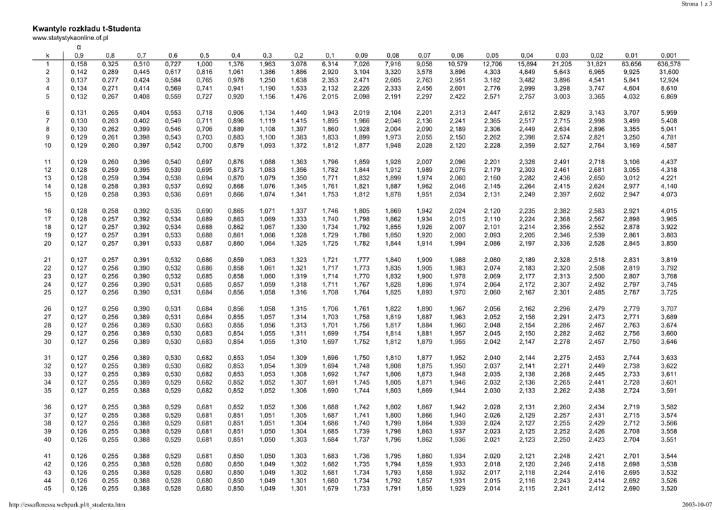 Strona 1 z 3 Kwantyle rozkładu t-Studenta www.statystykaonline.of.pl α k 1 2 3 4 5 0,9 0,158 0,142 0,137 0,134 0,132 0,8 0,325 0,289 0,277 0,271 0,267 0,7 0,510 0,445 0,424 0,414 0,408 0,6 0,727 0,617 0,584 0,569 0,559 0,5 1,000 0,816 0,765 0,741 0,727 0,4 1,376 1,061 0,978 0,941 0,920 0,3 1,963 1,386 1,250 1,190 1,156 0,2 3,078 1,886 1,638 1,533 1,476 0,1 6,314 2,920 2,353 2,132 2,015 0,09 7,026 3,104 2,471 2,226 2,098 0,08 7,916 3,320 2,605 2,333 2,191 0,07 9,058 3,578 2,763 2,456 2,297 0,06 10,579 3,896 2,951 2,601 2,422 0,05 12,706 4,303 3,182 2,776 2,571 0,04 15,894 4,849 3,482 2,999 2,757 0,03 21,205 5,643 3,896 3,298 3,003 0,02 31,821 6,965 4,541 3,747 3,365 0,01 63,656 9,925 5,841 4,604 4,032 0,001 636,578 31,600 12,924 8,610 6,869 6 7 8 9 10 0,131 0,130 0,130 0,129 0,129 0,265 0,263 0,262 0,261 0,260 0,404 0,402 0,399 0,398 0,397 0,553 0,549 0,546 0,543 0,542 0,718 0,711 0,706 0,703 0,700 0,906 0,896 0,889 0,883 0,879 1,134 1,119 1,108 1,100 1,093 1,440 1,415 1,397 1,383 1,372 1,943 1,895 1,860 1,833 1,812 2,019 1,966 1,928 1,899 1,877 2,104 2,046 2,004 1,973 1,948 2,201 2,136 2,090 2,055 2,028 2,313 2,241 2,189 2,150 2,120 2,447 2,365 2,306 2,262 2,228 2,612 2,517 2,449 2,398 2,359 2,829 2,715 2,634 2,574 2,527 3,143 2,998 2,896 2,821 2,764 3,707 3,499 3,355 3,250 3,169 5,959 5,408 5,041 4,781 4,587 11 12 13 14 15 0,129 0,128 0,128 0,128 0,128 0,260 0,259 0,259 0,258 0,258 0,396 0,395 0,394 0,393 0,393 0,540 0,539 0,538 0,537 0,536 0,697 0,695 0,694 0,692 0,691 0,876 0,873 0,870 0,868 0,866 1,088 1,083 1,079 1,076 1,074 1,363 1,356 1,350 1,345 1,341 1,796 1,782 1,771 1,761 1,753 1,859 1,844 1,832 1,821 1,812 1,928 1,912 1,899 1,887 1,878 2,007 1,989 1,974 1,962 1,951 2,096 2,076 2,060 2,046 2,034 2,201 2,179 2,160 2,145 2,131 2,328 2,303 2,282 2,264 2,249 2,491 2,461 2,436 2,415 2,397 2,718 2,681 2,650 2,624 2,602 3,106 3,055 3,012 2,977 2,947 4,437 4,318 4,221 4,140 4,073 16 17 18 19 20 0,128 0,128 0,127 0,127 0,127 0,258 0,257 0,257 0,257 0,257 0,392 0,392 0,392 0,391 0,391 0,535 0,534 0,534 0,533 0,533 0,690 0,689 0,688 0,688 0,687 0,865 0,863 0,862 0,861 0,860 1,071 1,069 1,067 1,066 1,064 1,337 1,333 1,330 1,328 1,325 1,746 1,740 1,734 1,729 1,725 1,805 1,798 1,792 1,786 1,782 1,869 1,862 1,855 1,850 1,844 1,942 1,934 1,926 1,920 1,914 2,024 2,015 2,007 2,000 1,994 2,120 2,110 2,101 2,093 2,086 2,235 2,224 2,214 2,205 2,197 2,382 2,368 2,356 2,346 2,336 2,583 2,567 2,552 2,539 2,528 2,921 2,898 2,878 2,861 2,845 4,015 3,965 3,922 3,883 3,850 21 22 23 24 25 0,127 0,127 0,127 0,127 0,127 0,257 0,256 0,256 0,256 0,256 0,391 0,390 0,390 0,390 0,390 0,532 0,532 0,532 0,531 0,531 0,686 0,686 0,685 0,685 0,684 0,859 0,858 0,858 0,857 0,856 1,063 1,061 1,060 1,059 1,058 1,323 1,321 1,319 1,318 1,316 1,721 1,717 1,714 1,711 1,708 1,777 1,773 1,770 1,767 1,764 1,840 1,835 1,832 1,828 1,825 1,909 1,905 1,900 1,896 1,893 1,988 1,983 1,978 1,974 1,970 2,080 2,074 2,069 2,064 2,060 2,189 2,183 2,177 2,172 2,167 2,328 2,320 2,313 2,307 2,301 2,518 2,508 2,500 2,492 2,485 2,831 2,819 2,807 2,797 2,787 3,819 3,792 3,768 3,745 3,725 26 27 28 29 30 0,127 0,127 0,127 0,127 0,127 0,256 0,256 0,256 0,256 0,256 0,390 0,389 0,389 0,389 0,389 0,531 0,531 0,530 0,530 0,530 0,684 0,684 0,683 0,683 0,683 0,856 0,855 0,855 0,854 0,854 1,058 1,057 1,056 1,055 1,055 1,315 1,314 1,313 1,311 1,310 1,706 1,703 1,701 1,699 1,697 1,761 1,758 1,756 1,754 1,752 1,822 1,819 1,817 1,814 1,812 1,890 1,887 1,884 1,881 1,879 1,967 1,963 1,960 1,957 1,955 2,056 2,052 2,048 2,045 2,042 2,162 2,158 2,154 2,150 2,147 2,296 2,291 2,286 2,282 2,278 2,479 2,473 2,467 2,462 2,457 2,779 2,771 2,763 2,756 2,750 3,707 3,689 3,674 3,660 3,646 31 32 33 34 35 0,127 0,127 0,127 0,127 0,127 0,256 0,255 0,255 0,255 0,255 0,389 0,389 0,389 0,389 0,388 0,530 0,530 0,530 0,529 0,529 0,682 0,682 0,682 0,682 0,682 0,853 0,853 0,853 0,852 0,852 1,054 1,054 1,053 1,052 1,052 1,309 1,309 1,308 1,307 1,306 1,696 1,694 1,692 1,691 1,690 1,750 1,748 1,747 1,745 1,744 1,810 1,808 1,806 1,805 1,803 1,877 1,875 1,873 1,871 1,869 1,952 1,950 1,948 1,946 1,944 2,040 2,037 2,035 2,032 2,030 2,144 2,141 2,138 2,136 2,133 2,275 2,271 2,268 2,265 2,262 2,453 2,449 2,445 2,441 2,438 2,744 2,738 2,733 2,728 2,724 3,633 3,622 3,611 3,601 3,591 36 37 38 39 40 0,127 0,127 0,127 0,126 0,126 0,255 0,255 0,255 0,255 0,255 0,388 0,388 0,388 0,388 0,388 0,529 0,529 0,529 0,529 0,529 0,681 0,681 0,681 0,681 0,681 0,852 0,851 0,851 0,851 0,851 1,052 1,051 1,051 1,050 1,050 1,306 1,305 1,304 1,304 1,303 1,688 1,687 1,686 1,685 1,684 1,742 1,741 1,740 1,739 1,737 1,802 1,800 1,799 1,798 1,796 1,867 1,866 1,864 1,863 1,862 1,942 1,940 1,939 1,937 1,936 2,028 2,026 2,024 2,023 2,021 2,131 2,129 2,127 2,125 2,123 2,260 2,257 2,255 2,252 2,250 2,434 2,431 2,429 2,426 2,423 2,719 2,715 2,712 2,708 2,704 3,582 3,574 3,566 3,558 3,551 41 42 43 44 45 0,126 0,126 0,126 0,126 0,126 0,255 0,255 0,255 0,255 0,255 0,388 0,388 0,388 0,388 0,388 0,529 0,528 0,528 0,528 0,528 0,681 0,680 0,680 0,680 0,680 0,850 0,850 0,850 0,850 0,850 1,050 1,049 1,049 1,049 1,049 1,303 1,302 1,302 1,301 1,301 1,683 1,682 1,681 1,680 1,679 1,736 1,735 1,734 1,734 1,733 1,795 1,794 1,793 1,792 1,791 1,860 1,859 1,858 1,857 1,856 1,934 1,933 1,932 1,931 1,929 2,020 2,018 2,017 2,015 2,014 2,121 2,120 2,118 2,116 2,115 2,248 2,246 2,244 2,243 2,241 2,421 2,418 2,416 2,414 2,412 2,701 2,698 2,695 2,692 2,690 3,544 3,538 3,532 3,526 3,520 http://essafloressa.webpark.pl/t_studenta.htm 2003-10-07 Strona 2 z 3 46 47 48 49 50 0,126 0,126 0,126 0,126 0,126 0,255 0,255 0,255 0,255 0,255 0,388 0,388 0,388 0,388 0,388 0,528 0,528 0,528 0,528 0,528 0,680 0,680 0,680 0,680 0,679 0,850 0,849 0,849 0,849 0,849 1,048 1,048 1,048 1,048 1,047 1,300 1,300 1,299 1,299 1,299 1,679 1,678 1,677 1,677 1,676 1,732 1,731 1,730 1,730 1,729 1,790 1,789 1,789 1,788 1,787 1,855 1,854 1,853 1,852 1,852 1,928 1,927 1,926 1,925 1,924 2,013 2,012 2,011 2,010 2,009 2,114 2,112 2,111 2,110 2,109 2,239 2,238 2,237 2,235 2,234 2,410 2