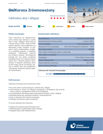 30 czerwca 2014 r. str. 1 UniFundusze Fundusz Inwestycyjny Otwarty UniKorona Zrównoważony Subfundusz akcji i obligacji Ryzyko portfela: minimalne Polityka inwestycyjna Celem subfunduszu jest długoterminowy wzrost wartości jego aktywów w wyniku lokat w akcje i obligacje. Udział akcji nie może być niższy niż 20% i wyższy niż 80% wartości aktywów. Lokaty subfunduszu są dokonywane przede wszystkim na podstawie analizy fundamentalnej, szczególnie w przypadku papierów o charakterze udziałowym. Podstawowym kryterium jest określenie rynkowej i technologicznej przewagi firm oraz jakości zarządzania przedsiębiorstwem. Przy ustalaniu proporcji udziału akcji i dłużnych papierów wartościowych w aktywach subfunduszu bierze się pod uwagę czynniki warunkujące sytuację na rynkach akcji oraz kształtowanie i perspektywy rentowności dłużnych papierów wartościowych. niskie umiarkowane wysokie bardzo wysokie Charakterystyka subfunduszu Typ subfunduszu subfundusz zrównoważony Data dostosowania struktury portfela 1 września 1995 r. Firma zarządzająca Union Investment TFI S.A. Akcjonariusz firmy zarządzającej Union Asset Management Holding AG – 100% Min. pierwsza wpłata 100 PLN Maks. opłata manipulacyjna zgodnie z tabelą opłat 5% Maks. opłata za zarządzanie 4% Zarządzający Tomasz Matras, Dariusz Lasek Wartość aktywów netto 480,69 mln PLN Wartość jednostki uczestnictwa Numer rachunku bankowego 303,19 PLN 34 1880 0009 0000 0013 0017 1009 Zalecany min. horyzont inwestycyjny: 3 Profil inwestora Subfundusz skierowany jest do inwestorów, którzy: •chcą mieć udział w zyskach płynących z polskich akcji i obligacji, •chcą korzystać ze wzrostu cen aktywów wynikającego z konwergencji stóp procentowych w związku z przystąpieniem Polski do Unii Europejskiej, •są zainteresowani alternatywą wobec bezpośredniej inwestycji w akcje i obligacje, •potrzebują elastycznej, przejrzystej inwestycji o wysokiej płynności, •mają co najmniej 3-letni horyzont inwestycyjny, •akceptują umiarkowane ryzyko inwestycyjne. To nie jest subfundusz dla inwestorów: • dążących do uzyskania gwarantowanego zysku, • nieakceptujących umiarkowanego ryzyka inwestycji, • lokujących swoje środki krótkoterminowo. lata 30 czerwca 2014 r. str. 2 UniFundusze Fundusz Inwestycyjny Otwarty UniKorona Zrównoważony Subfundusz akcji i obligacji Ryzyko portfela: minimalne niskie umiarkowane wysokie bardzo wysokie Wyniki inwestycyjne subfunduszu i benchmarku* 1m 3m 6m 1 rok 2 lata 5 lat UniKorona Zrównoważony (%) -0,92 -0,40 Benchmark (%) -0,01 0,85 Różnica -0,91 -1,25 10 lat 0,57 8,90 15,51 44,72 84,49 1,98 11,28 20,31 56,27 119,29 -1,41 -2,38 -4,80 -11,55 -34,80 * Stopy zwrotu subfunduszu i benchmarku obliczane są na podstawie ostatnich dni roboczych miesiąca. Zmiana wartości jednostki w porównaniu z benchmarkiem UniKorona Zrównoważony Benchmark UniKorona Zrównoważony 157 147 137 127 117 107 97 Cze ’09 Sty ’10 Sie ’10 Lut ’11 Wrz ’11 Mar ’12 Alokacja aktywów Paź ’12 Kwi ’13 Lis ’13 Cze ’14 Benchmark1 Akcje Bony i obligacje skarbowe Inne instrumenty dłużne oraz depozyty zabezpieczające Komercyjne instrumenty dłużne 56,69% 35,29% 5,68% 2,34% 0 20 40 60 80 100 50% WIG (Warszawski Indeks Giełdowy) 50% EFFAS POLAND 1–5 lat ¹ Wzorcowy portfel, który stanowi punkt odniesienia do dokonywania oceny wyników zarządzania aktywami funduszu. 30 czerwca 2014 r. str. 3 UniFundusze Fundusz Inwestycyjny Otwarty UniKorona Zrównoważony Subfundusz akcji i obligacji Ryzyko portfela: minimalne niskie umiarkowane Przemysł 8,08% Technologie 3,07% Finanse 43,41% Paliwa 5,83% Telekomunikacja 2,42% Użyteczność pub. 4,05% Surowce 11,78% Dobra konsumpcyjne 9,01% Usługi 12,35% Struktura walutowa Inne 100% 20 Współczynniki ryzyka 12 m Beta do benchmarku 1,06 Beta do WIG 0,56 Information ratio -2,51 Tracking error 0,01 Współczynnik Sharpe’a 0,88 Odchylenie standardowe 7,28% Duration* 1,73 * Modified duration subfunduszu na dzień 28.02.2014 r. bardzo wysokie Słowniczek Alokacja sektorowa portfela akcyjnego 0 wysokie 40 60 80 100 Beta do benchmarku – współczynnik ten pokazuje zależność pomiędzy zmianami wartości jednostki funduszu a benchmarku. Wskaźnik beta wynoszący 1 oznacza, że zmiany wartości jednostki funduszu są takie same jak benchmarku, co sugeruje, że skład instrumentów funduszu jest tożsamy ze składem instrumentów w benchmarku. Beta o wartości mniejszej niż 1 oznacza, że wzrost (spadek) benchmarku o 1% jest zazwyczaj powiązany ze wzrostem (spadkiem) wartości jednostki funduszu o mniej niż 1%. Wartość beta większa niż 1 oznacza, że wzrost (spadek) benchmarku o 1% jest zazwyczaj powiązany ze wzrostem (spadkiem) wartości jednostki funduszu o więcej niż 1%. Beta do WIG – współczynnik ten pokazuje zależność pomiędzy zmianami wartości jednostki funduszu a zmianami indeksu WIG. Wskaźnik beta wynoszący 1 oznacza, że zmiany wartości jednostki funduszu są takie same jak indeksu WIG. Beta o wartości mniejszej niż 1 oznacza, że wzrost (spadek) benchmarku o 1% jest zazwyczaj powiązany ze wzrostem (spadkiem) wartości indeksu WIG o mniej niż 1%. Wartość beta większa niż 1 oznacza, że wzrost (spadek) indeksu WIG o 1% jest zazwyczaj powiązany ze wzrostem (spadkiem) wartości jednostki funduszu o więcej niż 1%. Information ratio – współczynnik ten pokazuje, jak opłacalne jest ryzyko, jakie ponosi fundusz w stosunku do swojego benchmarku. Im wyższy poziom wskaźnika information ratio, tym przy niższym nakładzie ryzyka w stosunku do benchmarku został osiągnięty wynik funduszu. Fundusz, który osiąga information ratio powyżej 0,3, uważany jest za efektywnie zarządzany. Tracking error – współczynnik ten pokazuje, jak ryzykowny jest dany fundusz w stosunku do swojego benchmarku. Im wyższy wskaźnik, tym bardziej agresywnie zarządzany jest fundusz w stosunku do swojego 