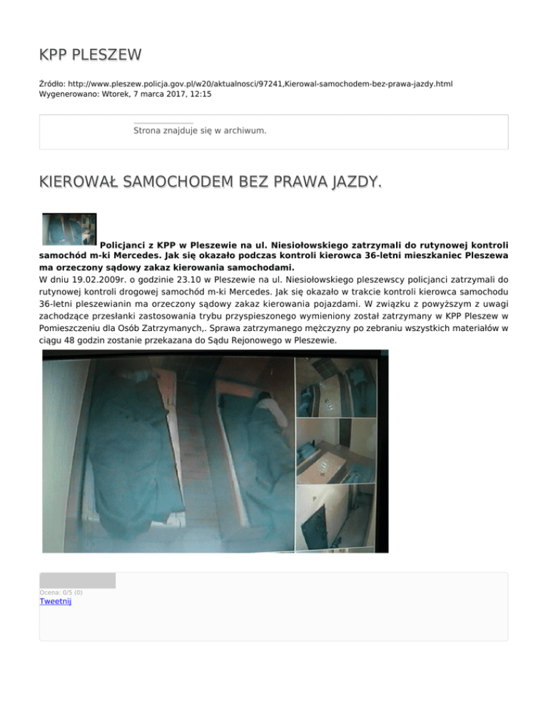 KPP PLESZEW Źródło: http://www.pleszew.policja.gov.pl/w20/aktualnosci/97241,Kierowal-samochodem-bez-prawa-jazdy.html Wygenerowano: Wtorek, 7 marca 2017, 12:15 Strona znajduje się w archiwum. KIEROWAŁ SAMOCHODEM BEZ PRAWA JAZDY. Policjanci z KPP w Pleszewie na ul. Niesiołowskiego zatrzymali do rutynowej kontroli samochód m-ki Mercedes. Jak się okazało podczas kontroli kierowca 36-letni mieszkaniec Pleszewa ma orzeczony sądowy zakaz kierowania samochodami. W dniu 19.02.2009r. o godzinie 23.10 w Pleszewie na ul. Niesiołowskiego pleszewscy policjanci zatrzymali do rutynowej kontroli drogowej samochód m-ki Mercedes. Jak się okazało w trakcie kontroli kierowca samochodu 36-letni pleszewianin ma orzeczony sądowy zakaz kierowania pojazdami. W związku z powyższym z uwagi zachodzące przesłanki zastosowania trybu przyspieszonego wymieniony został zatrzymany w KPP Pleszew w Pomieszczeniu dla Osób Zatrzymanych,. Sprawa zatrzymanego mężczyzny po zebraniu wszystkich materiałów w ciągu 48 godzin zostanie przekazana do Sądu Rejonowego w Pleszewie. Ocena: 0/5 (0) Tweetnij
