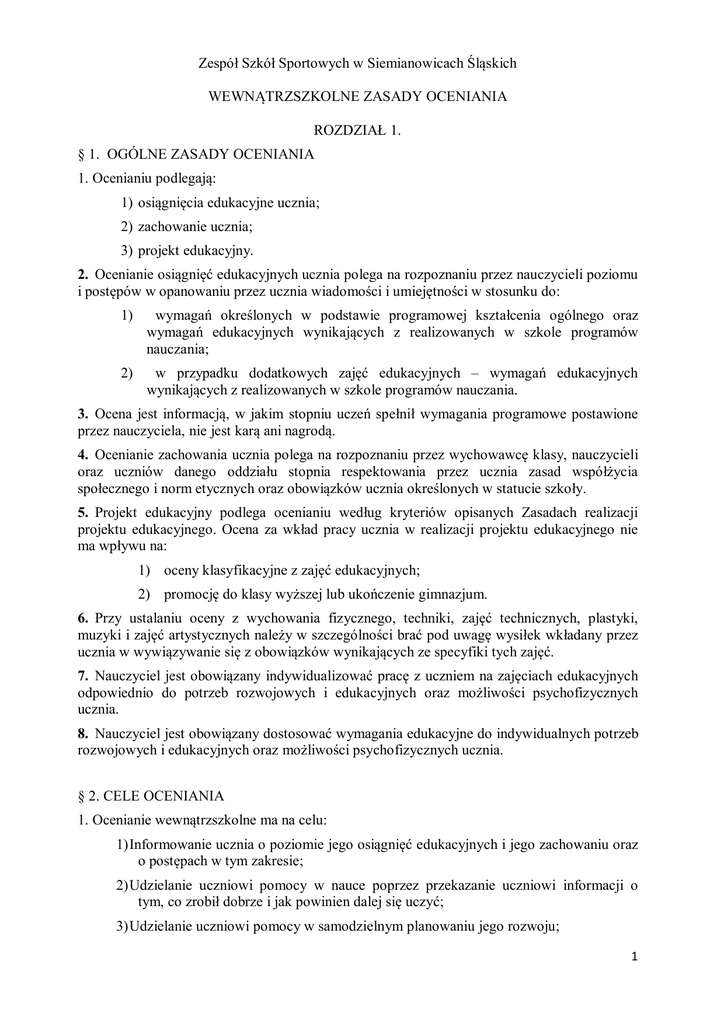 Zespół Szkół Sportowych w Siemianowicach Śląskich WEWNĄTRZSZKOLNE ZASADY OCENIANIA ROZDZIAŁ 1. § 1. OGÓLNE ZASADY OCENIANIA 1. Ocenianiu podlegają: 1) osiągnięcia edukacyjne ucznia; 2) zachowanie ucznia; 3) projekt edukacyjny. 2. Ocenianie osiągnięć edukacyjnych ucznia polega na rozpoznaniu przez nauczycieli poziomu i postępów w opanowaniu przez ucznia wiadomości i umiejętności w stosunku do: 1) wymagań określonych w podstawie programowej kształcenia ogólnego oraz wymagań edukacyjnych wynikających z realizowanych w szkole programów nauczania; 2) w przypadku dodatkowych zajęć edukacyjnych – wymagań edukacyjnych wynikających z realizowanych w szkole programów nauczania. 3. Ocena jest informacją, w jakim stopniu uczeń spełnił wymagania programowe postawione przez nauczyciela, nie jest karą ani nagrodą. 4. Ocenianie zachowania ucznia polega na rozpoznaniu przez wychowawcę klasy, nauczycieli oraz uczniów danego oddziału stopnia respektowania przez ucznia zasad współżycia społecznego i norm etycznych oraz obowiązków ucznia określonych w statucie szkoły. 5. Projekt edukacyjny podlega ocenianiu według kryteriów opisanych Zasadach realizacji projektu edukacyjnego. Ocena za wkład pracy ucznia w realizacji projektu edukacyjnego nie ma wpływu na: 1) oceny klasyfikacyjne z zajęć edukacyjnych; 2) promocję do klasy wyższej lub ukończenie gimnazjum. 6. Przy ustalaniu oceny z wychowania fizycznego, techniki, zajęć technicznych, plastyki, muzyki i zajęć artystycznych należy w szczególności brać pod uwagę wysiłek wkładany przez ucznia w wywiązywanie się z obowiązków wynikających ze specyfiki tych zajęć. 7. Nauczyciel jest obowiązany indywidualizować pracę z uczniem na zajęciach edukacyjnych odpowiednio do potrzeb rozwojowych i edukacyjnych oraz możliwości psychofizycznych ucznia. 8. Nauczyciel jest obowiązany dostosować wymagania edukacyjne do indywidualnych potrzeb rozwojowych i edukacyjnych oraz możliwości psychofizycznych ucznia. § 2. CELE OCENIANIA 1. Ocenianie wewnątrzszkolne ma na celu: 1) Informowanie ucznia o poziomie jego osiągnięć edukacyjnych i jego zachowaniu oraz o postępach w tym zakresie; 2) Udzielanie uczniowi pomocy w nauce poprzez przekazanie uczniowi informacji o tym, co zrobił dobrze i jak powinien dalej się uczyć; 3) Udzielanie uczniowi pomocy w samodzielnym planowaniu jego rozwoju; 1 4) Motywowanie ucznia do dalszych postępów w nauce i zachowaniu; 5) Monitorowanie bieżącej pracy ucznia; 6) Dostarczenie rodzicom i nauczycielom informacji o postępach, trudnościach w nauce, zachowaniu oraz specjalnych uzdolnieniach ucznia; 7) Umożliwienie nauczycielom doskonalenia organizacji i metod pracy dydaktycznowychowawczej. 2. Ocenianie wewnątrzszkolne obejmuje: 1) formułowanie przez nauczycieli wymagań edukacyjnych niezbędnych do uzyskania poszczególnych śródrocznych i rocznych ocen klasyfikacyjnych z obowiązkowych i dodatkowych zajęć edukacyjnych z uwzględnieniem zindywidualizowanych wymagań wobec uczniów objętych pomocą psychologiczno-pedagogiczną w szkole; 2) ustalanie kryteriów oceny zachowania; 3) ustalanie ocen bieżących i ustalanie śródrocznych ocen klasyfikacyjnych z obowiązkowych oraz dodatkowych zajęć edukacyjnych oraz śródrocznej oceny klasyfikacyjnej zachowania, według skali i w formach przyjętych w szkole; 4) ustalanie rocznych ocen klasyfikacyjnych z obowiązkowych i dodatkowych zajęć edukacyjnych oraz rocznej oceny klasyfikacyjnej zachowania; 5) przeprowadzanie egzaminów klasyfikacyjnych, poprawkowych i sprawdzających; 6) ustalenie warunków i trybu uzyskania wyższej niż przewidywane rocznych ocen klasyfikacyjnych z obowiązkowych zajęć edukacyjnych oraz rocznej oceny klasyfikacyjnej zachowania; 7) ustalanie sposobu i kryteriów oceny projektu edukacyjnego - dla uczniów gimnazjum; 8) ustalanie warunków i sposobu przekazywania rodzicom (prawnym opiekunom) informacji o postępach i trudnościach ucznia w nauce oraz zasad wglądu do dokumentacji oceniania i pisemnych prac uczniów; 3. Ocenianie ucznia z religii i etyki odbywa się zgodnie z odrębnymi przepisami. § 3. ZASADY OCENIANIA 1. W ocenianiu obowiązują zasady: 1) zasada jawności ocen zarówno dla ucznia jak jego rodziców (opiekunów prawnych); 2) zasada częstotliwości i rytmiczności – uczeń oceniany jest na bieżąco i rytmicznie; ocena końcowa jest wystawiana na podstawie średniej ważonej z minimalnej liczby ocen (n+2; n-liczba godzin w tygodniu); 3) zasada jawności kryteriów – uczeń i jego rodzice (prawni opiekunowie) znają kryteria oceniania, zakres materiału z każdego przedmiotu oraz formy pracy podlegające ocenie; 4) zasada różnorodności wynikająca ze specyfiki każdego przedmiotu; 5) zasada różnicowania wymagań – zadania stawiane uczniom powinny mieć zróżnicowany poziom trudności i dawać możliwość uzyskania wszystkich ocen; 6) zasada otwartości – wewnątrzszkolne oceniania podlega weryfikacji i modyfikacji w oparciu o okresową ewaluację; 2 § 4. INFORMOWANIE UCZNIÓW I RODZICÓW - OBOWIĄZKI NAUCZYCIELA: 1. Każdy nauczyciel na początku roku szkolnego informuje uczniów oraz ich rodziców o: 1) wymaganiach edukacyjnych niezbędnych do uzyskania poszczególnych śródrocznych i rocznych ocen klasyfikacyjnych z obowiązkowych i dodatkowych zajęć edukacyjnych, wynikających z realizowanego programu nauczania; 2) sposobach sprawdzania osiągnięć edukacyjnych uczniów; 3) warunkach i trybie uzyskania wyższej niż przewidywana rocznej oceny klasyfikacyjnej z obowiązkowych i dodatkowych zajęć edukacyjnych; 4) warunkach, sposobach oraz kryteriach oceny projektu edukacyjnego (dotyczy uczniów gimnazjum). 2. Informacje, o których mowa w § 4 ust.1 zawarte są w przedmiotowych zasadach oceniania, przekazywane i udostępniane mogą być: 1) przez opublikowanie informacji na stronie internetowej szkoły www.zss-siemianowice.pl w odpowiedni