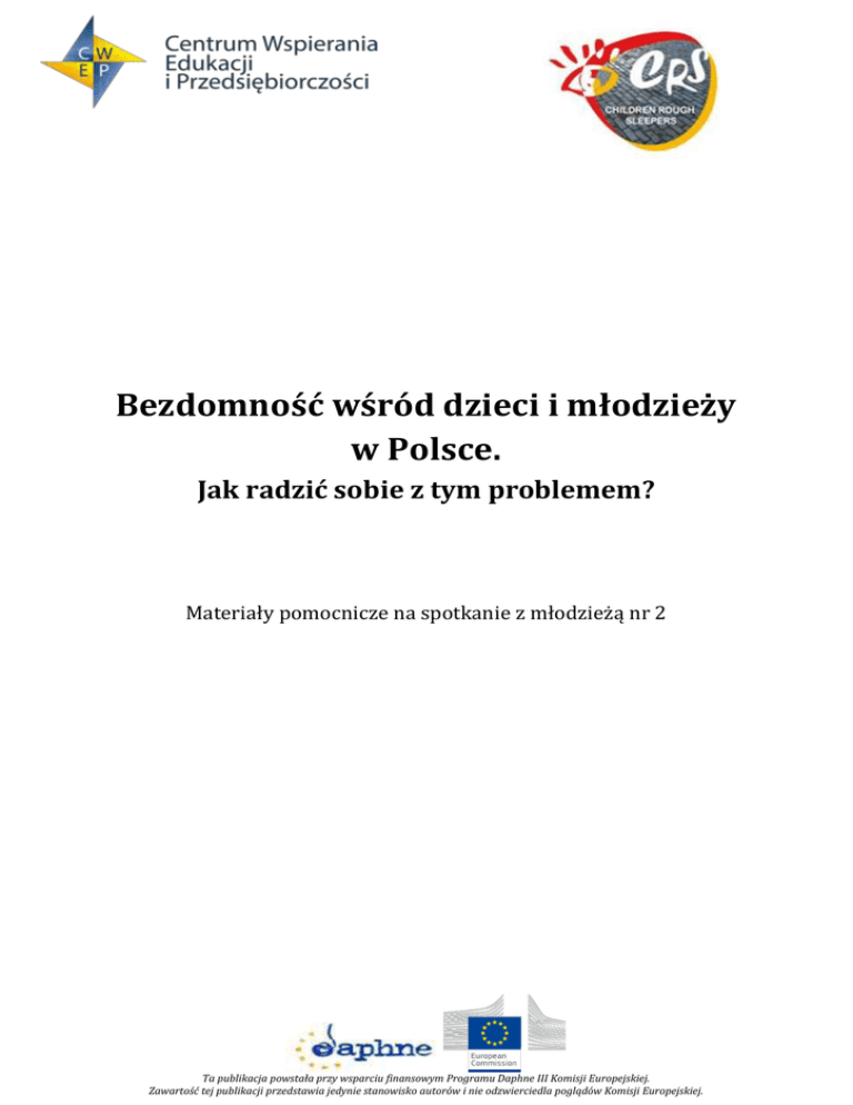 Bezdomność wśród dzieci i młodzieży w Polsce. Jak radzić sobie z tym problemem? Materiały pomocnicze na spotkanie z młodzieżą nr 2 Ta publikacja powstała przy wsparciu finansowym Programu Daphne III Komisji Europejskiej. Zawartość tej publikacji przedstawia jedynie stanowisko autorów i nie odzwierciedla poglądów Komisji Europejskiej. 2 Spis treści Wprowadzenie ................................................................................................................ 3 1. Nieco statystyki - co Główny Urząd Statystyczny, Ministerstwo Pracy i Polityki Społecznej i inne ośrodki badawcze mówią o bezdomności wśród dzieci ..................... 4 2. Co powoduje bezdomność wśród dzieci i młodzieży? Jak jej zapobiegać lub jak z niej wyjść? ......................................................................................................................13 Bibliografia.................................................................................................................... 22 Ta publikacja powstała przy wsparciu finansowym Programu Daphne III Komisji Europejskiej. Zawartość tej publikacji przedstawia jedynie stanowisko autorów i nie odzwierciedla poglądów Komisji Europejskiej. 3 Wprowadzenie Zjawisko bezdomności wśród dzieci i młodzieży w Polsce jest trudne do precyzyjnego oszacowania. Statystyka publiczna, zarówno w formie badań prowadzonych prze Główny Urząd Statystyczny (GUS), jak i Ministerstwo Pracy i Polityki Społecznej (MPiPS) realizowanych we współpracy z Urzędami Wojewódzkimi nie daje jasnego obrazu co do skali i zakresu zjawiska. Jeszcze trudniejszą kwestią wydaje się określenie sposobów wchodzenia w bezdomność przez najmłodszą część społeczeństwa oraz wyjścia z tej trudnej sytuacji. Niniejszy program edukacyjny ma na celu uwrażliwienie dzieci i młodzieży w tym temacie poprzez prezentację danych liczbowych dotyczących zjawiska bezdomności wśród dzieci i młodzieży w Polsce oraz wskazanie specyfiki bezdomności tej grupy społeczeństwa. Całość materiału została dostosowana do wymogów lekcji szkolnych i może być zrealizowana w ramach 4 godzin lekcyjnych. Materiał został podzielony na dwie części: 1. Nieco statystyki - co Główny Urząd Statystyczny, Ministerstwo Pracy i Polityki Społecznej i inne ośrodki badawcze mówią o bezdomności wśród dzieci - 90 min (2 h lekcyjne); 2. Co powoduje bezdomność wśród dzieci i młodzieży? Jak jej zapobiegać lub jak z niej wyjść? - 90 min (2 h lekcyjne). Główne cele obu części: 1. Zapoznanie dzieci i młodzieży ze skalą problemu bezdomności wśród ich rówieśników 2. Przekazanie sposobu analizy danych statystycznych 3. Zapoznanie dzieci i młodzieży z przyczynami bezdomności wśród ich rówieśników 4. Zapoznanie dzieci i młodzieży ze sposobami wychodzenia z bezdomności 5. Zapoznanie dzieci i młodzieży ze sposobami zapobiegania bezdomności wśród ich rówieśników Przygotowany program edukacyjny stanowił jeden z elementów międzynarodowego projektu badawczego pn. A study relating to children rough sleepers who are runaways & homeless and victimes of sexual exploitation/abuse & other violence on the streets and development of knowledge transfer activities that improve services and policies to support & protect these vulnerable children, realizowanego przez Stowarzyszenie „Centrum Wspierania Edukacji i Przedsiębiorczości” w Rzeszowie wspólnie z partnerami z dziewięciu krajów europejskich w ramach programu Daphne III pod kierunkiem Uniwersytetu w Wolverhampton (Wielka Brytania). Ta publikacja powstała przy wsparciu finansowym Programu Daphne III Komisji Europejskiej. Zawartość tej publikacji przedstawia jedynie stanowisko autorów i nie odzwierciedla poglądów Komisji Europejskiej. 4 1. Nieco statystyki - co Główny Urząd Statystyczny, Ministerstwo Pracy i Polityki Społecznej i inne ośrodki badawcze mówią o bezdomności wśród dzieci Cele: 1. Zapoznanie dzieci i młodzieży ze skalą problemu bezdomności wśród ich rówieśników 2. Przekazanie sposobu analizy danych statystycznych Czas: 90 min (2 h lekcyjne) Badania Głównego Urzędu Statystycznego – 45 min W prowadzonym przez GUS cyklicznie co kilka lat badaniu pn. Narodowy Spis Powszechny Ludności i Mieszkań wskazano, że szacunkowa liczba bezdomnych w roku 2011 należących do tzw. I kategorii bezdomnych (osób bez dachu nad głową) 1 wynosi około 9,6 tys. osób (według danych spisu zjawisko bezdomności ogółem dotyczy 24 tys. osób). W prezentowanych wynikach badań podana została krótka informacja o wzroście liczby bezdomnych dzieci do lat 17, co wskazuje na wzrost liczby bezdomnych rodzin2. Jak wynika z opublikowanych w kwietniu 2013 r. szczegółowych wyników badania „Narodowego Spisu Powszechnego Ludności i Mieszkań 2011”, liczba osób przebywających w schroniskach dla bezdomnych i noclegowniach spadła w roku 2011 o ponad 2000 osób w stosunku do danych z roku 20023. O ile te dane mogą być optymistyczne, o tyle szczegółowa ich analiza wskazuje, że nastąpił wzrost zagrożenia bezdomnością w różnych grupach oraz pojawiły się nowe jej formy 4. Według danych spisowych liczba dzieci i młodzieży do lat 19 pozostających bezdomnymi w roku 2011 wyniosła ogółem 1790 osób, z czego do tzw. I kategorii zaliczono 150 osób zaś do II – Do pierwszej kategorii osób bezdomnych zalicza się osoby żyjące na ulicy, w przestrzeni publicznej bez schronienia, które mogłoby zostać uznane za kwaterę mieszkalną. Do kategorii tej należą przede wszystkim osoby, które wieczór i noc w krytycznym momencie spisu spędzają poza jakąkolwiek instytucją funkcjonującą całodobowo. Druga kategoria osób bezdomnych to osoby bez stałego miejsca zamieszkania, które często przemieszczają się pomiędzy różnymi typami obiektów zbiorowego zakwaterowania (schroniska, noclegownie i instytucje dla bezdomnych)