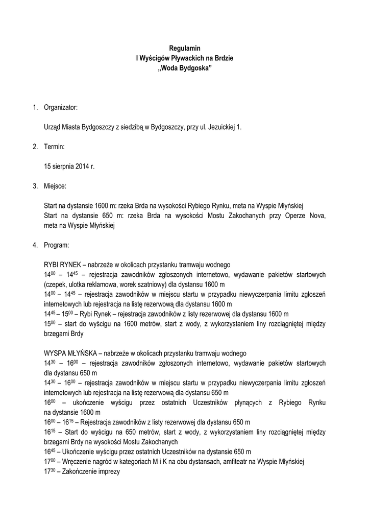 Regulamin I Wyścigów Pływackich na Brdzie „Woda Bydgoska” 1