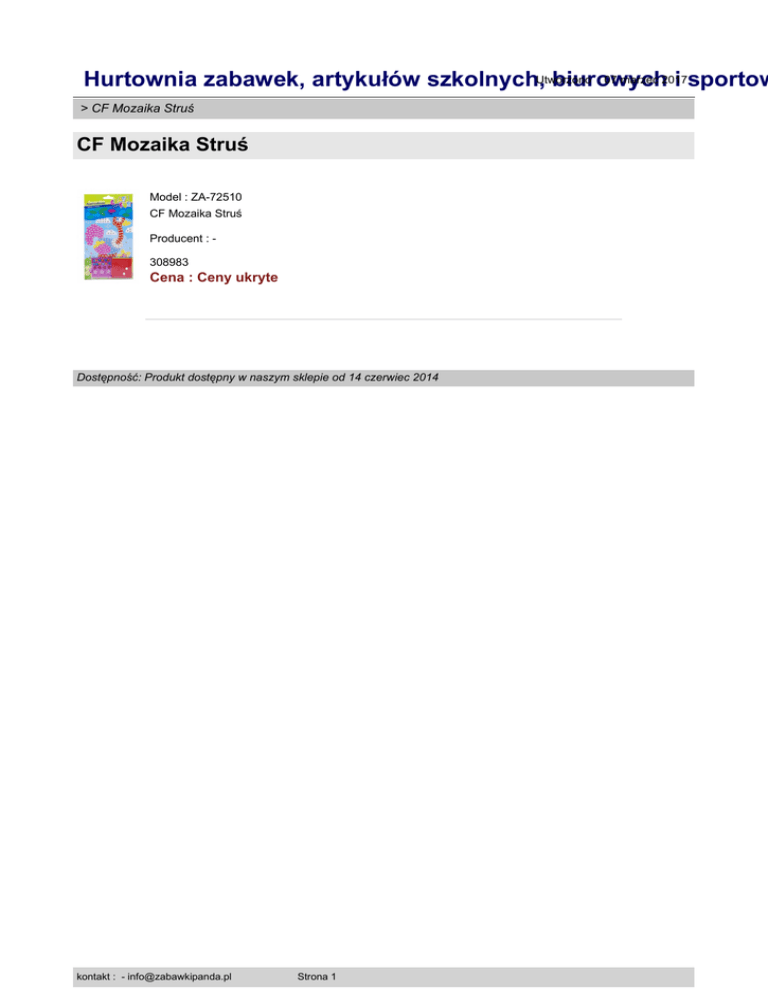 : 07 marzec 2017 Hurtownia zabawek, artykułów szkolnych,Utworzono biurowych i sportow > CF Mozaika Struś CF Mozaika Struś Model : ZA-72510 CF Mozaika Struś Producent : 308983 Cena : Ceny ukryte Dostępność: Produkt dostępny w naszym sklepie od 14 czerwiec 2014 kontakt : - [email protected] Strona 1