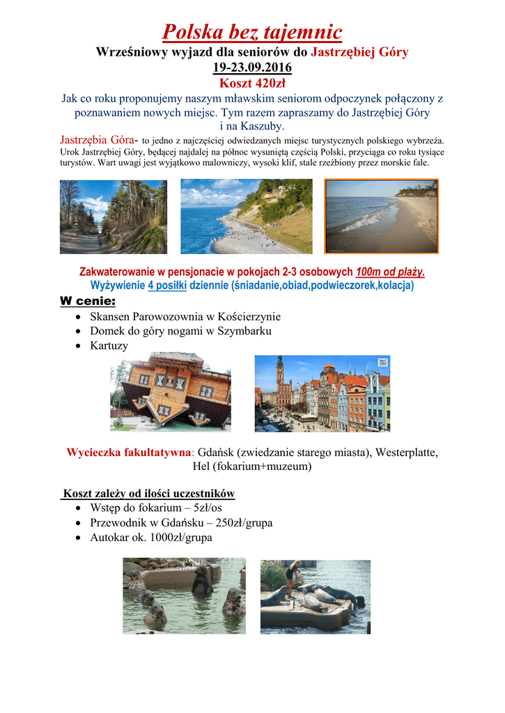Polska bez tajemnic Wrześniowy wyjazd dla seniorów do Jastrzębiej Góry 19-23.09.2016 Koszt 420zł Jak co roku proponujemy naszym mławskim seniorom odpoczynek połączony z poznawaniem nowych miejsc. Tym razem zapraszamy do Jastrzębiej Góry i na Kaszuby. Jastrzębia Góra- to jedno z najczęściej odwiedzanych miejsc turystycznych polskiego wybrzeża. Urok Jastrzębiej Góry, będącej najdalej na północ wysuniętą częścią Polski, przyciąga co roku tysiące turystów. Wart uwagi jest wyjątkowo malowniczy, wysoki klif, stale rzeźbiony przez morskie fale. Zakwaterowanie w pensjonacie w pokojach 2-3 osobowych 100m od plaży. Wyżywienie 4 posiłki dziennie (śniadanie,obiad,podwieczorek,kolacja) W cenie: Skansen Parowozownia w Kościerzynie Domek do góry nogami w Szymbarku Kartuzy Wycieczka fakultatywna: Gdańsk (zwiedzanie starego miasta), Westerplatte, Hel (fokarium+muzeum) Koszt zależy od ilości uczestników Wstęp do fokarium – 5zł/os Przewodnik w Gdańsku – 250zł/grupa Autokar ok. 1000zł/grupa