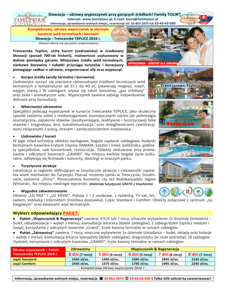 Słowacja – zdrowy wypoczynek przy gorących źródłach! Family TOUR® Internet: www.familytour.pl, E-mail: [email protected] Informacja, sprawdzenie wolnych miejsc, rezerwacja tel. 33-853-2075 lub 53-43-43-500 Kompleksowy, zdrowy wypoczynek w słynnym kurorcie wód termalnych i borowin Słowacja - Trencanske TEPLICE 2016 r. (Dojazd własny lub specjalnie zorganizowany) Trencanske Teplice, cichy kurort (uzdrowisko) w środkowej Słowacji (ponad 700-lat historii), malowniczo usytuowany w dolinie pomiędzy górami. Miejscowe źródła wód termalnych, siarkowe borowiny i zabytki przyciąga turystów i kuracjuszy pomagając zadbać o zdrowie, zregenerować siły oraz wypocząć. Gorące źródła (wody termalne i borowiny) Uzdrowisko szczyci się pięcioma różnorodnymi źródłami leczniczych wód termalnych o temperaturze od 37.7 do 40 oC (zawierają magnez, wapń, węgiel, siarkę..) W zabiegach używa się także borowinę, „gaz źródlany” oraz zioła i aromatyczne sole.. Wypoczynek zawiera zabiegi indywidualnie dobrane przy konsultacji. Właściwości zdrowotne Specjaliści polecają wypoczynek w kurorcie Trencanske TEPLICE, jako skuteczny sposób radzenia sobie z niedomaganiami reumatycznymi takimi jak polimialgia reumatyczna, zapalenia stawów (zesztywniające, reaktywne i łuszczycowe) bóle stawów i kręgosłupa, dna, autoimmunizacja.. oraz dolegliwościami cywilizacyjnymi związanymi z pracą, stresem i zanieczyszczeniem środowiska.. Uzdrowisko / kurort W jego skład wchodzą: obiekty noclegowe, bogate zaplecze zabiegowe, budynki termalnych basenów krytych (słynny HAMAM, kasztel i inne), poliklinika, gabinety specjalistów, sale koncertowe, restauracje.. Obiekty ulokowane przy promenadzie i odkrytych basenach „GRAND”. Na miejscu kwitnie bogate życie kulturalne, odbywają się festiwale i koncerty, dancingi w uroczym parku. Turystyczne atrakcje Lokalizacja w regionie obfitującym w turystyczne atrakcje i ciekawostki zapewnia wiele możliwości do Turystyki. Poznać możemy zamki w Trenczynie, Smolnicach, Jaskienie „Driny”, Pieszczańskie borowiny czy też Małokarpadzki region Winiarski.. Na miejscu niedrogie wycieczki. (materiały turystyczne GRATIS z Voucherem). Wygodne zakwaterowanie Obiekty „LD PAX” i „LD KRYM”. Pokoje 1 i 2 osobowe, z łazienką, TV-sat, tel., radiem, lodówką i Internetem (możliwa dostawka). Część Standard i Comfort. Obiekty połączone z centrum „zabiegowym” oraz basenami wód termalnych. Wybierz odpowiadający PAKIET: Pakiet „Wypoczynek & Regeneracja” zawiera: 4/5/6 lub 7 nocy, smaczne wyżywienie 2x dziennie (śniadania – bufet, obiadokolacje – wybór z menu), konsultacja lekarska (dobór zabiegów), 2 zabiegi/dzień (oprócz niedziel i świąt), korzystanie z odkrytych basenów „Grand”, kryte baseny termalne w ramach zabiegów. Pakiet „Zdrowotny” zawiera: 7 nocy, smaczne wyżywienie 3x dziennie (śniadania – bufet, obiady oraz kolacje – wybór z menu), konsultacja lekarza specjalisty (dobór zabiegów), diagnostyka (w razie potrzeby), 18 zabiegów /tydzień, korzystanie z odkrytych basenów „GRAND”, kryte baseny termalne w ramach zabiegów. Zdrowy wypoczynek – Pakiet: Trenczanskie TEPLICE 2016 r. część Standard: część Comfort: Zdrowotny 8 dni (7 nocy) Wypoczynek & Regeneracja 5 dni (4 noce) 6 dni (5 nocy) 2345 zł/os. 1445 zł/os. 1695 zł/os. 2445 zł/os. 1575 zł/os. 1795 zł/os. - Kompleksowy zdrowy wypoczynek 2016 r. - 7 dni (6 nocy) 8 dni (7 nocy) 1895 zł/os. 1995 zł/os. 2145 zł/os. 2245 zł/os. Informacja, sprawdzenie wolnych miejsc, rezerwacja 33-853-2075 53-43-43-500 | Tylko 10% zaliczki by zarezerwować! 2 | S t r o n a Kompleksowy, zdrowy wypoczynek w kurorcie wód termalnych i borowin.. Trenczanskie TEPLICE 2016 r. Cena zawiera: • 4 / 5 / 6 lub 7 nocy, w obiekcie KRYM-PAX (Standard lub Comfort) • smaczne wyżywienie (2 lub 3x dziennie – wg wybranego pakietu) • konsultacja lekarza specjalisty (dobór zabiegów) • pakiet „regeneracja” 2 zabiegi/dzień, pakiet „zdrowotny” 18 zabiegów/tydzień • korzystanie z odkrytych basenów „GRAND” – GRATIS All Inclusive • infrastruktura (leżaki, Fit & Fan, źródła wód..) – GRATIS All Inclusive • fitness centrum, możliwość kuracji „pitnej” – GRATIS All Inclusive • udział w animacjach i programie kulturalnym – GRATIS All Inclusive • całodobowa opieka specjalistów, szlafrok pokój Comfort • Internet WI-Fi w pokoju i lobby barze, sejf hotelowy • faktura VAT (polski rachunek) pozwalający skorzystać z funduszu socjalnego i odliczeń • ubezpieczenie KL + NNW Signal Iduna wraz z KL i NNW chorób przewlekłych do 10 000 € • przed wypoczynkiem zestaw pomocnych informatorów turystycznych • mapa z planem dojazdu i atrakcji Cena nie zawiera: opłaty klimatycznej (0,90 €/os/dz.) i parkingowej (4 – 7,5 €/dzień), pokój jednoosobowy +20%, apartament +20%, dla zainteresowanych przejazd Katowic i Bielska +295 zł/os Zniżki: dziecko do lat 3 Gratis, dostawka -100 zł. Karta Family TOUR® -50 zł. Wczesna rezerwacja (>35 dni)–2%. Informacja, sprawdzenie wolnych miejsc, rezerwacja 33-853-2075 53-43-43-500 | Tylko 10% zaliczki by zarezerwować!