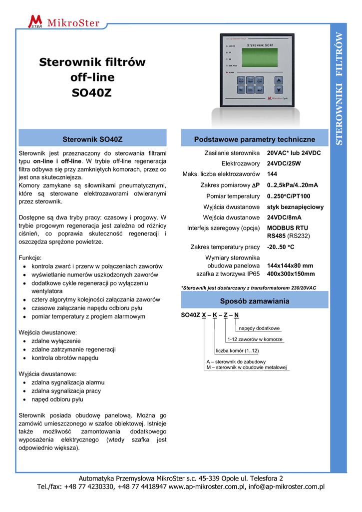 Sterownik SO40Z Sterownik jest przeznaczony do sterowania filtrami typu on-line i off-line. W trybie off-line regeneracja filtra odbywa się przy zamkniętych komorach, przez co jest ona skuteczniejsza. Komory zamykane są siłownikami pneumatycznymi, które są sterowane elektrozaworami otwieranymi przez sterownik. Dostępne są dwa tryby pracy: czasowy i progowy. W trybie progowym regeneracja jest zależna od różnicy ciśnień, co poprawia skuteczność regeneracji i oszczędza sprężone powietrze. Funkcje: kontrola zwarć i przerw w połączeniach zaworów wyświetlanie numerów uszkodzonych zaworów dodatkowe cykle regeneracji po wyłączeniu wentylatora cztery algorytmy kolejności załączania zaworów czasowe załączanie napędu odbioru pyłu pomiar temperatury z progiem alarmowym Wejścia dwustanowe: zdalne wyłączenie zdalne zatrzymanie regeneracji kontrola obrotów napędu Podstawowe parametry techniczne Zasilanie sterownika Elektrozawory Maks. liczba elektrozaworów Zakres pomiarowy P Pomiar temperatury 20VAC* lub 24VDC 24VDC/25W 144 0..2,5kPa/4..20mA 0..250C/PT100 Wyjścia dwustanowe styk beznapięciowy Wejścia dwustanowe 24VDC/8mA Interfejs szeregowy (opcja) Zakres temperatury pracy Wymiary sterownika obudowa panelowa szafka z tworzywa IP65 MODBUS RTU RS485 (RS232) -20..50 C 144x144x80 mm 400x300x150mm *Sterownik jest dostarczany z transformatorem 230/20VAC Sposób zamawiania SO40Z X – K – Z – N napędy dodatkowe 1-12 zaworów w komorze liczba komór (1..12) A – sterownik do zabudowy M – sterownik w obudowie metalowej Wyjścia dwustanowe: zdalna sygnalizacja alarmu zdalna sygnalizacja pracy napęd odbioru pyłu Sterownik posiada obudowę panelową. Można go zamówić umieszczonego w szafce obiektowej. Istnieje także możliwość zamontowania dodatkowego wyposażenia elektrycznego (wtedy szafka jest odpowiednio większa). Automatyka Przemysłowa MikroSter s.c. 45-339 Opole ul. Telesfora 2 Tel./fax: +48 77 4230330, +48 77 4418947 www.ap-mikroster.com.pl, [email protected] STEROWNIKI FILTRÓW Sterownik filtrów off-line SO40Z