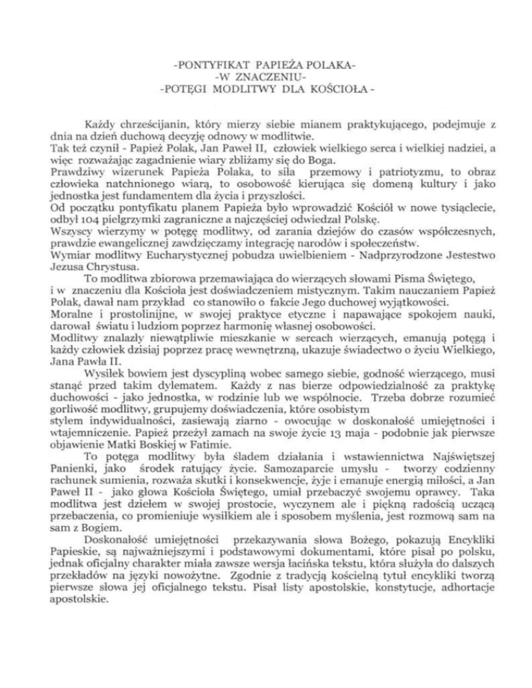 Ojcze Święty nasz rodaku, z krwi i kości tyś Polaku już za życia świętym zwanym w całym świecie poważanym Na najwyższym miejscu Matka Boża Cię postawiła i Papieżem uczyniła Ojcze Święty rozmodlony i niestrudzony pielgrzymie pamięć o Twych czynach w całym świecie słynie. Obrońcą pokoju, Kościoła się stałeś i wolność Polakom dałeś. Prosimy Cię czuwaj nad nami a modlitwami różańca Cie wspieramy Ty który widzisz nas w oknie w Niebie, ratuj nas w każdej potrzebie Do Ciebie z gorącą modlitwą się uciekamy, wstawiaj się za nami. Do Boga Najwyższego o trwałość wiary i moc Kościoła Świętego oraz za wiernych i pasterzy świata całego Za Twą przyczyną cuda się stają a Polacy mocno Cię kochają. Jeszcze nie było takiego co by tyle zrobił dla Kościoła Świętego i pokoju światowego i dla każdego, nawet niewierzącego i chorego. Twa mocna wiara i miłość sprawiła że nawet zabójcy przebaczyła Bogu i Matce Świętej zanosim niskie pokłony za to że będziesz na ołtarze wyniesiony i w poczet świętych zaliczony. Tego wyrazić nie da się zgoła co uczyniłeś dla nas i Kościoła Za Twą przyczyną Ojcze krocie łask doznałam i silniejsza w wierze się stałam. Ja w swym życiu wielkie szczęście miałam, bo Cię w pielgrzymkach spotykałam, a w modlitwie nie zapomniałam. Twe święte dłonie ucałowałam i błogosławieństwo otrzymałam. Bardzo mocno wierzę w Ciebie tu na ziemi potem w Niebie Nie opuszczaj mnie w potrzebie. Różańca część światła wznoszę o zdrowie, zgodę i wiarę proszę Tobie tylko ufać mogę pobłogosław na dalszą drogę W.