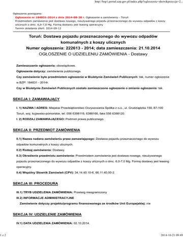 http://bzp1.portal.uzp.gov.pl/index.php?ogloszenie=show&pozycja=2... Ogłoszenie powiązane: Ogłoszenie nr 184831-2014 z dnia 2014-08-28 r. Ogłoszenie o zamówieniu - Toruń Przedmiotem zamówienia jest dostawa nowego, nieużywanego pojazdu przeznaczonego do wywozu odpadów z koszy ulicznych o dmc. 6,0-7,0 Mg. Formą dostawy jest leasing operacyjny Termin składania ofert: 2014-09-12 Toruń: Dostawa pojazdu przeznaczonego do wywozu odpadów komunalnych z koszy ulicznych Numer ogłoszenia: 222613 - 2014; data zamieszczenia: 21.10.2014 OGŁOSZENIE O UDZIELENIU ZAMÓWIENIA - Dostawy Zamieszczanie ogłoszenia: obowiązkowe. Ogłoszenie dotyczy: zamówienia publicznego. Czy zamówienie było przedmiotem ogłoszenia w Biuletynie Zamówień Publicznych: tak, numer ogłoszenia w BZP: 184831 - 2014r. Czy w Biuletynie Zamówień Publicznych zostało zamieszczone ogłoszenie o zmianie ogłoszenia: tak. SEKCJA I: ZAMAWIAJĄCY I. 1) NAZWA I ADRES: Miejskie Przedsiębiorstwo Oczyszczania Spółka z o.o., ul. Grudziądzka 159, 87-100 Toruń, woj. kujawsko-pomorskie, tel. 056 6398119, 6398166, faks 056 6398120. I. 2) RODZAJ ZAMAWIAJĄCEGO: Podmiot prawa publicznego. SEKCJA II: PRZEDMIOT ZAMÓWIENIA II.1) Nazwa nadana zamówieniu przez zamawiającego: Dostawa pojazdu przeznaczonego do wywozu odpadów komunalnych z koszy ulicznych. II.2) Rodzaj zamówienia: Dostawy. II.3) Określenie przedmiotu zamówienia: Przedmiotem zamówienia jest dostawa nowego, nieużywanego pojazdu przeznaczonego do wywozu odpadów z koszy ulicznych o dmc. 6,0-7,0 Mg. Formą dostawy jest leasing operacyjny. II.4) Wspólny Słownik Zamówień (CPV): 34.14.45.10-6, 66.11.40.00-2. SEKCJA III: PROCEDURA III.1) TRYB UDZIELENIA ZAMÓWIENIA: Przetarg nieograniczony III.2) INFORMACJE ADMINISTRACYJNE Zamówienie dotyczy projektu/programu finansowanego ze środków Unii Europejskiej: nie SEKCJA IV: UDZIELENIE ZAMÓWIENIA IV.1) DATA UDZIELENIA ZAMÓWIENIA: 02.10.2014. 1z2 2014-10-21 09:49 http://bzp1.portal.uzp.gov.pl/index.php?ogloszenie=show&pozycja=2... IV.2) LICZBA OTRZYMANYCH OFERT: 1. IV.3) LICZBA ODRZUCONYCH OFERT: . IV.4) NAZWA I ADRES WYKONAWCY, KTÓREMU UDZIELONO ZAMÓWIENIA: SG Equipment Leasing Polska Sp. z o.o., ul. Marszałkowska 111, 00-102 Warszawa, kraj/woj. mazowieckie. Małopolska Wytwórnia Maszyn Brzesko Sp. z o.o., ul. Szczepanowska 21, 32-800 Brzesko, kraj/woj. małopolskie. IV.5) Szacunkowa wartość zamówienia (bez VAT): 270000,00 PLN. IV.6) INFORMACJA O CENIE WYBRANEJ OFERTY ORAZ O OFERTACH Z NAJNIŻSZĄ I NAJWYŻSZĄ CENĄ Cena wybranej oferty: 321270,49 Oferta z najniższą ceną: 321270,49 / Oferta z najwyższą ceną: 321270,49 Waluta: PLN. 2z2 2014-10-21 09:49