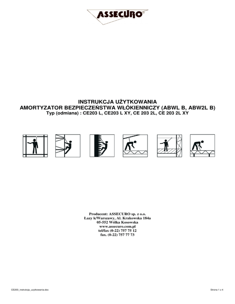 INSTRUKCJA UŻYTKOWANIA AMORTYZATOR BEZPIECZEŃSTWA WŁÓKIENNICZY (ABWL B, ABW2L B) Typ (odmiana) : CE203 L, CE203 L XY, CE 203 2L, CE 203 2L XY Producent: ASSECURO sp. z o.o. Łazy k/Warszawy, Al. Krakowska 184a 05-552 Wólka Kosowska www.assecuro.com.pl tel/fax (0-22) 757 75 12 fax. (0-22) 757 77 73 CE203_instrukcja_uzytkowania.doc Strona 1 z 4 ZASTOSOWANIE Amortyzator jest elementem systemu powstrzymywania spadania zgodnym z normą EN 355:2002, należącym do systemów ochrony osobistej. Stanowi element pochłaniający energię i gwarantuje bezpieczne powstrzymywanie spadania z wysokości w zakresie opisanym poniżej. Przeznaczony jest do stosowania z indywidualnym sprzętem chroniącym przed upadkiem z wysokości. Jest niezbędnym składnikiem systemu zabezpieczającego przed upadkiem z wysokości składającego się z: szelek bezpieczeństwa, amortyzatora, elementów łączących i kotwiących. Amortyzator w pełni zabezpiecza przed nadmiernymi przeciążeniami organizmu człowieka przy spadaniu i redukuje obciążenie do wartości <6,0 kN. KONSTRUKCJA Amortyzator wykonany jest ze specjalnie tkanej dwuwarstwowej taśmy i taśmy zewnętrznej zakończonej obustronnie osłoniętymi pętlami mocującymi. Połączone w procesie tkackim obie warstwy taśmy amortyzującej stanowią element amortyzujący - pochłaniający energię upadku przez rozrywanie wątku łączącego obie taśmy. Amortyzator złożony jest w pakiet osłonięty folią termokurczliwą, pod którą umieszczone jest oznakowanie amortyzatora (oznaczenie producenta, nazwa i typ amortyzatora , numer normy, piktogram nakazujący zapoznanie się z niniejszą instrukcją, numer seryjny, rok produkcji i znak kontroli jakości, znak zgodności, piktogram dot. kalkulacji wolnej przestrzenie potrzebnej do wyhamowania upadku.). Do jednej pętli w sposób trwały przyłączona jest jedna taśma bezpieczeństwa (CE203L) lub dwie taśmy bezpieczeństwa (CE203 2L). Taśmy bezpieczeństwa wykonane są z taśmy poliamidowej o szerokości 25 mm, spełniają wymagania normy EN 354: 2010. Amortyzatory produkowane są w wersjach bez zatrzaśników i zatrzaśnikami: Zatrzaśniki X: G- AJ 510, B- AJ 511,H – AJ 560 Zatrzaśniki Y: (dla amortyzatorów typu CE 203 2L XY- dwa zatrzaśniki): G - AJ 510, B - AJ 511,H - AJ 560, F1- AJ 590, F2 – AJ 591, F3 - AJ 592, F4 - AJ 592A Amortyzatory produkowane są w długościach standardowych: Typ CE203 L CE203 L XY CE203 2L CE203 2L XY Długość standardowa [m] 1,5 1,7 1,5 1,7 Na życzenie klienta dopuszcza się zmniejszenie lub zwiększenie długości – długości maksymalna amortyzatorów bez zatrzaśników Lmax =1,8 m; z zatrzaśnikami Lmax = 2,0 m. UWAGA: Nie wolno dokonywać samodzielnie żadnych zmian lub poprawek w amortyzatorze. Wszelkie uwagi dotyczące konstrukcji należy zgłaszać do producenta. SPOSÓB UŻYTKOWANIA Przed pierwszym wydaniem amortyzatora należy: * Sprawdzić zgodności danych znajdujących się na Karcie Użytkowania (w kartach użytkowania ostatnie siedem cyfr oznacza nr seryjny) i metce * Przeprowadzić dokładne oględziny taśmy, szwów i elementów metalowych. Amortyzator, w którym stwierdzono niezgodność danych lub uszkodzenie nie może być dopuszczony do użytkowania i powinien być przekazany do oceny przez producenta. Wszystkie naprawy mogą być przeprowadzane jedynie przez ASSECURO. Potwierdzeniem przeprowadzenia kontroli jest wpis w Karcie Użytkowania. Przed każdym użyciem amortyzator należy dokładnie skontrolować. W przypadku wątpliwości co do stanu technicznego, amortyzator należy wycofać z użytkowania i przekazać osobie kompetentnej. Ponowne wydanie sprzętu, do użytkowania, powinno być potwierdzone pisemnie, przez osobę kompetentną. Uwaga: Kartę Użytkowania należy przechowywać przez cały okres użytkowania amortyzatora. Dopuszcza się użytkowanie sprzętu jedynie przez osoby przeszkolone lub pod bezpośrednim nadzorem takich osób. Przed przystąpieniem do pracy użytkownik powinien ocenić, czy istnieje możliwość przeprowadzenia, w razie wypadku, skutecznej akcji ratunkowej. Użytkownik powinien zapoznać się również z zasadami prowadzenia akcji ratunkowej (ewakuacyjnej). Sprzęt zabezpieczający przed upadkiem z wysokości może być stosowany jedynie przez osoby nie posiadające przeciwwskazań co do pracy na wysokości. Amortyzator z taśmą (taśmami) jest składnikiem systemu powstrzymywania spadania. Wraz z szelkami bezpieczeństwa stanowi kompletny, lekki i prosty w użyciu system ochrony osobistej. Amortyzator należy przypiąć bezpośrednio do przedniego lub tylnego punktu zaczepowego szelek bezpieczeństwa. Amortyzatorów włókienniczych nie należy używać w przypadku: • Wytrzymałości punktów kotwiczącego mniejszej niż 10 kN, 0 • Narażenia na działanie ognia lub przedmiotów rozgrzanych powyżej 80 C, • Narażenia na kontakt z przedmiotami o ostrych krawędziach, CE203_instrukcja_uzytkowania.doc Strona 2 z 4 • Narażenia na kontakt z farbami, rozpuszczalnikami, środkami utleniającymi, kwasami, zasadami itp., impregnatami drewna i innymi środkami chemicznymi. ZALECENIA, NAKAZY I ZAKAZY DOTYCZĄCE UŻYTKOWANIA Włókiennicze amortyzatory bezpieczeństwa są użytkowane jako podzespoły składowe zespołów łącząco amortyzujących w systemach powstrzymywania spadania. Amortyzator łączony może być, z innym sprzętem np. szelkami bezpieczeństwa (PN-EN 361) i punktem kotwiczącym (PN-EN795), zatrzaśnikami (PN-EN 362) dopuszczonymi do stosowania w systemach powstrzymywania spadania. Przed użyciem należy się zapoznać z instrukcją użytkowania poszczególnych składników systemu powstrzymywania spadania. Amortyzator nie może być używany inaczej niż zgodnie z przeznaczeniem. Maksymalna długość amortyzatora z taśmą bezpieczeństwa i zakończeniami nie powinna przekroczyć 2 m. Punkt zamocowania podzespołu łącząco amortyzującego należy zlokalizować możliwie bezpośrednio