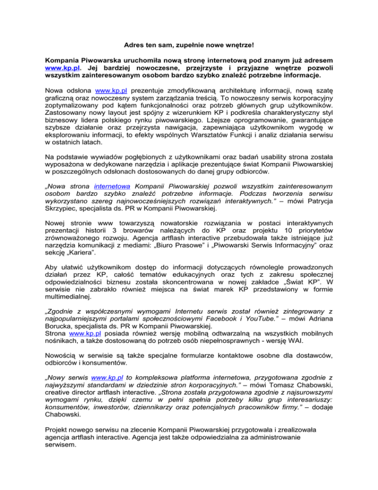 Adres ten sam, zupełnie nowe wnętrze! Kompania Piwowarska uruchomiła nową stronę internetową pod znanym już adresem www.kp.pl. Jej bardziej nowoczesne, przejrzyste i przyjazne wnętrze pozwoli wszystkim zainteresowanym osobom bardzo szybko znaleźć potrzebne informacje. Nowa odsłona www.kp.pl prezentuje zmodyfikowaną architekturę informacji, nową szatę graficzną oraz nowoczesny system zarządzania treścią. To nowoczesny serwis korporacyjny zoptymalizowany pod kątem funkcjonalności oraz potrzeb głównych grup użytkowników. Zastosowany nowy layout jest spójny z wizerunkiem KP i podkreśla charakterystyczny styl biznesowy lidera polskiego rynku piwowarskiego. Lżejsze oprogramowanie, gwarantujące szybsze działanie oraz przejrzysta nawigacja, zapewniająca użytkownikom wygodę w eksplorowaniu informacji, to efekty wspólnych Warsztatów Funkcji i analiz działania serwisu w ostatnich latach. Na podstawie wywiadów pogłębionych z użytkownikami oraz badań usability strona została wyposażona w dedykowane narzędzia i aplikacje prezentujące świat Kompanii Piwowarskiej w poszczególnych odsłonach dostosowanych do danej grupy odbiorców. „Nowa strona internetowa Kompanii Piwowarskiej pozwoli wszystkim zainteresowanym osobom bardzo szybko znaleźć potrzebne informacje. Podczas tworzenia serwisu wykorzystano szereg najnowocześniejszych rozwiązań interaktywnych.” – mówi Patrycja Skrzypiec, specjalista ds. PR w Kompanii Piwowarskiej. Nowej stronie www towarzyszą nowatorskie rozwiązania w postaci interaktywnych prezentacji historii 3 browarów należących do KP oraz projektu 10 priorytetów zrównoważonego rozwoju. Agencja artflash interactive przebudowała także istniejące już narzędzia komunikacji z mediami: „Biuro Prasowe” i „Piwowarski Serwis Informacyjny” oraz sekcję „Kariera”. Aby ułatwić użytkownikom dostęp do informacji dotyczących równolegle prowadzonych działań przez KP, całość tematów edukacyjnych oraz tych z zakresu społecznej odpowiedzialności biznesu została skoncentrowana w nowej zakładce „Świat KP”. W serwisie nie zabrakło również miejsca na świat marek KP przedstawiony w formie multimedialnej. „Zgodnie z współczesnymi wymogami Internetu serwis został również zintegrowany z najpopularniejszymi portalami społecznościowymi Facebook i YouTube.” – mówi Adriana Borucka, specjalista ds. PR w Kompanii Piwowarskiej. Strona www.kp.pl posiada również wersję mobilną odtwarzalną na wszystkich mobilnych nośnikach, a także dostosowaną do potrzeb osób niepełnosprawnych - wersję WAI. Nowością w serwisie są także specjalne formularze kontaktowe osobne dla dostawców, odbiorców i konsumentów. „Nowy serwis www.kp.pl to kompleksowa platforma internetowa, przygotowana zgodnie z najwyższymi standardami w dziedzinie stron korporacyjnych.” – mówi Tomasz Chabowski, creative director artflash interactive. „Strona została przygotowana zgodnie z najsurowszymi wymogami rynku, dzięki czemu w pełni spełnia potrzeby kilku grup interesariuszy: konsumentów, inwestorów, dziennikarzy oraz potencjalnych pracowników firmy.” – dodaje Chabowski. Projekt nowego serwisu na zlecenie Kompanii Piwowarskiej przygotowała i zrealizowała agencja artflash interactive. Agencja jest także odpowiedzialna za administrowanie serwisem. Zapraszamy na nowa stronę www.kp.pl! Do redaktora: Kompania Piwowarska – lider branży piwowarskiej w Polsce Kompania Piwowarska jest największym przedsiębiorstwem piwowarskim w Polsce. Kilkusetletnie doświadczenia w warzeniu piwa, nowoczesne technologie i rygorystyczne przestrzeganie zasad produkcji na światowym poziomie gwarantują najwyższą jakość naszych produktów. Do portfela marek KP należą najpopularniejsze polskie piwa – m.in. Tyskie, Żubr, Lech, Dębowe Mocne, Redd's, a także międzynarodowe marki premium: Pilsner Urquell, Grolsch oraz Peroni Nastro Azzurro. Kompania Piwowarska (utworzona w 1999 roku) posiada trzy browary (w Tychach, Poznaniu i Białymstoku) oraz oddziały handlowe na terenie całego kraju. Kompania Piwowarska prowadzi także działalność społeczną nastawioną na walkę z wykluczeniem społecznym na tle ubóstwa oraz programy edukacyjne popularyzujące odpowiedzialność i umiar w konsumowaniu alkoholu. Wielkość sprzedaży osiągniętej przez KP w roku finansowym zakończonym 31 marca 2011 r. wyniosła 14,1 mln hektolitrów piwa. SABMiller – jeden z największych na świecie producentów piwa Kompania Piwowarska jest częścią jednego z największych na świecie producentów piwa - SABMiller plc. Grupa produkuje lub dystrybuuje piwo na sześciu kontynentach, a jej ogólnoświatowy portfel obejmuje międzynarodowe piwa premium, takie jak Grolsch, Miller Genuine Draft, Peroni Nastro Azzurro czy Pilsner Urquell oraz czołowe marki lokalne, takie jak Aquila, Castle, Miller Lite, Snow czy Tyskie. SABMiller jest jedną z największych na świecie (poza USA) firm rozlewających produkty Coca-Coli. W roku finansowym zakończonym 31 marca 2011 SABMiller osiągnął przychody w wysokości 28,3 mld USD oraz wypracował zysk brutto (EBITA) w wysokości 5 mld USD. SABMiller plc jest notowany na giełdach papierów wartościowych w Londynie i Johannesburgu. Dodatkowych informacji udzielają: Patrycja Skrzypiec Specjalista ds. PR Kompania Piwowarska SA [email protected] tel. 85/676 91 71 Tomasz Chabowski creative director artflash interactive [email protected] tel. +48 603877356