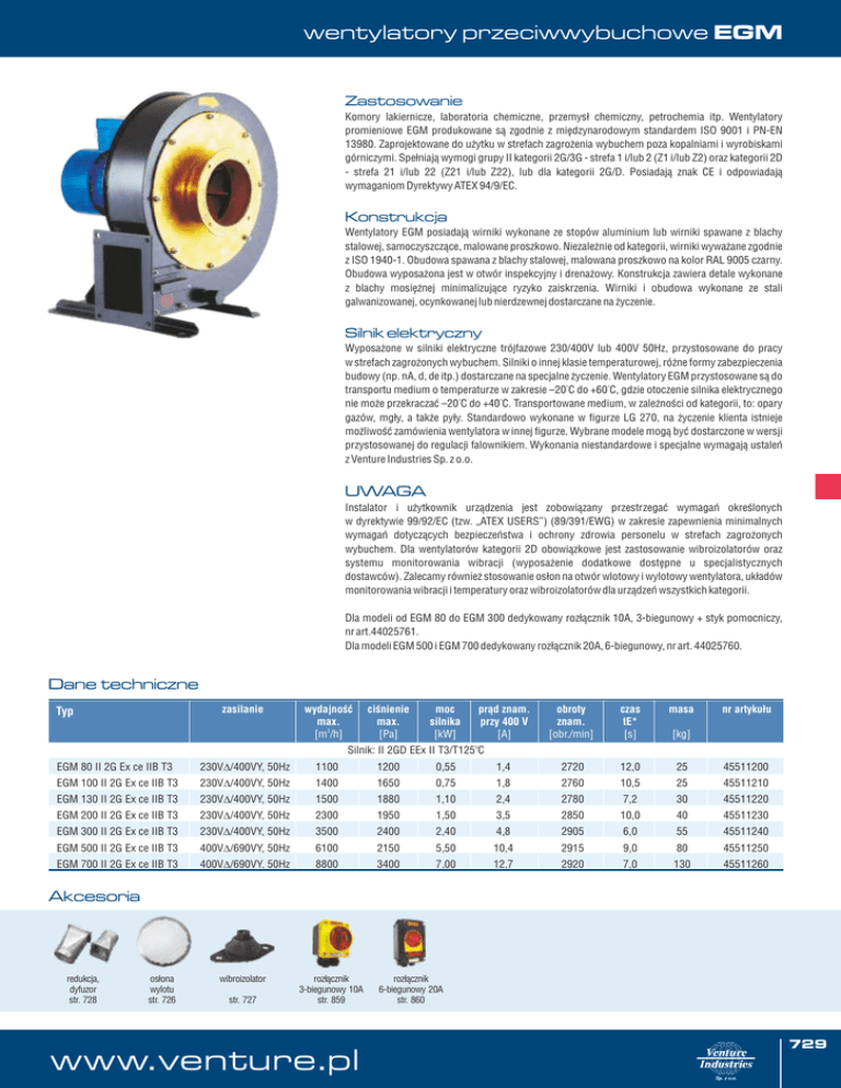 wentylatory przeciwwybuchowe EGM Zastosowanie Komory lakiernicze, laboratoria chemiczne, przemysł chemiczny, petrochemia itp. Wentylatory promieniowe EGM produkowane są zgodnie z międzynarodowym standardem ISO 9001 i PN-EN 13980. Zaprojektowane do użytku w strefach zagrożenia wybuchem poza kopalniami i wyrobiskami górniczymi. Spełniają wymogi grupy II kategorii 2G/3G - strefa 1 i/lub 2 (Z1 i/lub Z2) oraz kategorii 2D - strefa 21 i/lub 22 (Z21 i/lub Z22), lub dla kategorii 2G/D. Posiadają znak CE i odpowiadają wymaganiom Dyrektywy ATEX 94/9/EC. Konstrukcja Wentylatory EGM posiadają wirniki wykonane ze stopów aluminium lub wirniki spawane z blachy stalowej, samoczyszczące, malowane proszkowo. Niezależnie od kategorii, wirniki wyważane zgodnie z ISO 1940-1. Obudowa spawana z blachy stalowej, malowana proszkowo na kolor RAL 9005 czarny. Obudowa wyposażona jest w otwór inspekcyjny i drenażowy. Konstrukcja zawiera detale wykonane z blachy mosiężnej minimalizujące ryzyko zaiskrzenia. Wirniki i obudowa wykonane ze stali galwanizowanej, ocynkowanej lub nierdzewnej dostarczane na życzenie. Silnik elektryczny Wyposażone w silniki elektryczne trójfazowe 230/400V lub 400V 50Hz, przystosowane do pracy w strefach zagrożonych wybuchem. Silniki o innej klasie temperaturowej, różne formy zabezpieczenia budowy (np. nA, d, de itp.) dostarczane na specjalne życzenie. Wentylatory EGM przystosowane są do transportu medium o temperaturze w zakresie –20°C do +60°C, gdzie otoczenie silnika elektrycznego nie może przekraczać –20°C do +40°C. Transportowane medium, w zależności od kategorii, to: opary gazów, mgły, a także pyły. Standardowo wykonane w figurze LG 270, na życzenie klienta istnieje możliwość zamówienia wentylatora w innej figurze. Wybrane modele mogą być dostarczone w wersji przystosowanej do regulacji falownikiem. Wykonania niestandardowe i specjalne wymagają ustaleń z Venture Industries Sp. z o.o. UWAGA Instalator i użytkownik urządzenia jest zobowiązany przestrzegać wymagań określonych w dyrektywie 99/92/EC (tzw. „ATEX USERS”) (89/391/EWG) w zakresie zapewnienia minimalnych wymagań dotyczących bezpieczeństwa i ochrony zdrowia personelu w strefach zagrożonych wybuchem. Dla wentylatorów kategorii 2D obowiązkowe jest zastosowanie wibroizolatorów oraz systemu monitorowania wibracji (wyposażenie dodatkowe dostępne u specjalistycznych dostawców). Zalecamy również stosowanie osłon na otwór wlotowy i wylotowy wentylatora, układów monitorowania wibracji i temperatury oraz wibroizolatorów dla urządzeń wszystkich kategorii. Dla modeli od EGM 80 do EGM 300 dedykowany rozłącznik 10A, 3-biegunowy + styk pomocniczy, nr art.44025761. Dla modeli EGM 500 i EGM 700 dedykowany rozłącznik 20A, 6-biegunowy, nr art. 44025760. Dane techniczne zasilanie Typ wydajność max. [m3/h] ciśnienie max. [Pa] moc silnika [kW] prąd znam. przy 400 V [A] obroty znam. [obr./min] czas tE* [s] masa nr artykułu [kg] Silnik: II 2GD EEx II T3/T125oC EGM 80 II 2G Ex ce IIB T3 230VD/400VY, 50Hz 1100 1200 0,55 1,4 2720 12,0 25 45511200 EGM 100 II 2G Ex ce IIB T3 230VD/400VY, 50Hz 1400 1650 0,75 1,8 2760 10,5 25 45511210 EGM 130 II 2G Ex ce IIB T3 230VD/400VY, 50Hz 1500 1880 1,10 2,4 2780 7,2 30 45511220 EGM 200 II 2G Ex ce IIB T3 230VD/400VY, 50Hz 2300 1950 1,50 3,5 2850 10,0 40 45511230 EGM 300 II 2G Ex ce IIB T3 230VD/400VY, 50Hz 3500 2400 2,40 4,8 2905 6,0 55 45511240 EGM 500 II 2G Ex ce IIB T3 400VD/690VY, 50Hz 6100 2150 5,50 10,4 2915 9,0 80 45511250 EGM 700 II 2G Ex ce IIB T3 400VD/690VY, 50Hz 8800 3400 7,00 12,7 2920 7,0 130 45511260 Akcesoria redukcja, dyfuzor str. 728 osłona wylotu str. 726 wibroizolator str. 727 rozłącznik 3-biegunowy 10A str. 859 www.venture.pl rozłącznik 6-biegunowy 20A str. 860 729 wentylatory przeciwwybuchowe EGM Dane techniczne zasilanie Typ wydajność max. [m3/h] ciśnienie max. [Pa] moc silnika [kW] prąd znam. przy 400 V [A] obroty znam. [obr./min] czas tE* [s] masa nr artykułu [kg] Silnik:II 2D IP6X T125oC EGM 80 II 2D Ex tD A21 IP6X T125oC 230VD/400VY, 50Hz 1100 1200 0,55 1,36 2800 - 25 45511400 EGM 100 II 2D Ex tD A21 IP6X T125oC 230VD/400VY, 50Hz 1400 1650 0,75 1,73 2855 - 25 45511410 EGM 130 II 2D Ex tD A21 IP6X T125oC 230VD/400VY, 50Hz 1500 1880 1,10 2,40 2845 - 30 45511420 EGM 200 II 2D Ex tD A21 IP6X T125oC 230VD/400VY, 50Hz 2300 1950 1,50 3,25 2860 - 40 45511430 EGM 300 II 2D Ex tD A21 IP6X T125oC 230VD/400VY, 50Hz 3500 2400 3,00 6,10 2890 - 55 45511440 6100 2150 5,50 10,30 2925 - 80 45511450 8800 3400 7,50 Silnik: II 2G EEx d/de IIC T4 13,80 2930 - 130 45511460 o EGM 500 II 2D Ex tD A21 IP6X T125 C 400VD/690VY, 50Hz EGM 700 II 2D Ex tD A21 IP6X T125oC 400VD/690VY, 50Hz EGM 80 II 2G Ex cd/de IIB T4 230VD/400VY, 50Hz 1100 1200 0,55 1,38 2790 - 25 45511500 EGM 100 II 2G Ex cd/de IIB T4 230VD/400VY, 50Hz 1400 1650 0,75 1,75 2840 - 25 45511510 EGM 130 II 2G Ex cd/de IIB T4 230VD/400VY, 50Hz 1500 1880 1,10 2,45 2835 - 30 45511520 EGM 200 II 2G Ex cd/de IIB T4 230VD/400VY, 50Hz 2300 1950 1,50 3,30 2850 - 40 45511530 EGM 300 II 2G Ex cd/de IIB T4 230VD/400VY, 50Hz 3500 2400 3,00 6,20 2885 - 55 45511540 EGM 500 II 2G Ex cd/de IIB T4 400VD/690VY, 50Hz 6100 2150 5,50 10,50 2925 - 80 45511550 EGM 700 II 2G Ex cd/de IIB T4 400VD/690VY, 50Hz 8800 3400 7,50 14,00 2930 - 130 45511560 *) określa się jedynie dla silników budowy wzmocnionej EExe Charakterystyki pracy Wymiary [mm] EGM 80 Ciśnienie całkowite [Pa] 3 Wydajność [m /h] EGM 100 [Pa] * 1800 1600 Ciśnienie całkowite 1400 1200 1000 0,75 kW 800 600 400 200 0 0 200 400 600 800 Wydajność 1000 1200 1400 [m3/h] 730 Venture Industries Sp. z o.o. ul. Mokra 27, 05-092 Łomianki - Kiełpin tel. +48 22 751 95 50, 751 20 31 fax +48 22 751 22 59, 751 12 02 e-mail: [email protected] wentylatory przeciwwybuchowe EGM Charakterystyki pracy Wymiary [mm] EGM 130 [Pa] * 2000 1800 Ciśnienie całkowite 1600 1400 1,1 kW 1200 1000 800 600 400 200 0 0 200 400 600 800 1000 1200 14