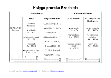 Księga proroka Ezechiela Potępienie POWOŁANIE Ezechiela Odnowa Izraela Judy innych narodów UPADEK Jerozolimy •Ammonitów (25,1 - 7) •Moabitów (25,8 - 11) •znaki sądu (4,1 - 5,4) jako narodu w Tysiącletnim Królestwie •nawrócenie (33,1 - 33) •nowa świątynia (40,1 - 43,27) •zgromadzenie (34,1 - 37,28) •nowe praktyki religijne (44,1 - 46,24) •usunięcie wrogów Izraela (38,1 - 39,29) •nowy kraj (47,1 - 48,35) •Edomu (25,12 - 14) •wiadomości o sądzie (5,5 - 7,27) •Filistynów (25,15 -1 7) •Tyru (26,1 - 28,19) •wizje sądu (8,1 - 11,25) •Sydonu (28,20 - 24) •wyjaśnienia nt. sądu (12,1 - 24,27) [28,25-26 dygresja] •Egiptu (29,1 - 32,32) 1 ------------3 4 ----------------24 1 ---------------------------------------24 25 ---------------------32 1 -------------------------------------------------------------------------32 Artykuły do ściągnięcia: http://www.biblia.polok.pl/ lub w dziale Download http://www.iwportal.net 33 ------------------39 40 ------------------48 33 ------------------------------------------------48 Temat: Sąd Boży sprzyja poznawaniu Boga. „Wtedy poznacie, że jestem Panem” Artykuły do ściągnięcia: http://www.biblia.polok.pl/ lub w dziale Download http://www.iwportal.net Linia czasu w księdze Ezechiela Początek służby Nebukadnesar pokonuje Egipcjan prorockiej Daniel wzięty do Babilonu Jeremiasz a 1000 627 Dawid 605 597 592 Ezechiel wzięty do Babilonu Nebukadnesar podbija Judę; Jeremiasz zabrany do Egiptu 586 Ezechiel zaczyna służbę Cyrus Perski zezwala na powrót Żydów 571 538 400 Ostatnie znane proroctwo Ezechiela Sześć wizji w księdze Ezechiela 1. Wizja Boga (1,4-28) 2. Wizja zwoju (2,9 - 3,3) 3. Wizja na równinie (3,22-23) 4. Wizje Jerozolimy (a) niegodziwość w świątyni (8,1-18) (b) zabicie mieszkańców miasta (9,1-11) (c) spalenie miasta (10,1-22 (d) niegodziwi książęta i opuszczenie Jerozolimy przez chwałę Pana (11,1-25) 5. Wizja suchych kości (37,1-10) 6. Wizja nowej świątyni, nowego kultu i odnowionego kraju (40,1 - 48,35) Dziesięć znaków w księdze Ezechiela ZNAK NAUKA FRAGMENT 1. Cegła (tabliczka gliniana) oblężenie i upadek Jerozolimy 4,1-3 2. Poza czas wygnania 4,4-8 3. Chleb degradacja w niewoli 4,9-17 4. Ogolenie zepsucie ludności Jerozolimy 5,1-17 5. Zapakowanie tobołów na drogę wygnanie do innego kraju 12,1-16 6. Drżenie przykry sąd 12,17-20 7. Wyostrzony miecz nadciągający sąd 21,1-32 8. Piec do wytopu sąd & oczyszczenie 22,1-31 9. Śmierć żony Ezechiela utrata błogosławieństwa 24,15-27 10. Dwa patyki odnowienie unii Izraela i Judy 37,15-28 Artykuły do ściągnięcia: http://www.biblia.polok.pl/ lub w dziale Download http://www.iwportal.net Artykuły do ściągnięcia: http://www.biblia.polok.pl/ lub w dziale Download http://www.iwportal.net
