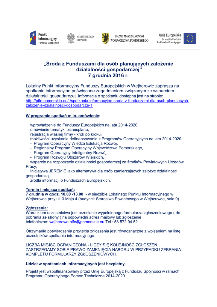 „Środa z Funduszami dla osób planujących założenie działalności gospodarczej” 7 grudnia 2016 r. Lokalny Punkt Informacyjny Funduszy Europejskich w Wejherowie zaprasza na spotkanie informacyjne poświęcone zagadnieniom związanym ze wsparciem działalności gospodarczej. Informacja o spotkaniu dostępna jest na stronie: http://pife.pomorskie.eu/-/spotkania-informacyjne-sroda-z-funduszami-dla-osob-planujacychzalozenie-dzialalnosci-gospodarcze-1 W programie spotkań m.in. omówienie: wprowadzenie do Funduszy Europejskich na lata 2014-2020, omówienie tematyki biznesplanu, rejestracja własnej firmy - krok po kroku, możliwości uzyskania dofinansowania z Programów Operacyjnych na lata 2014-2020: - Program Operacyjny Wiedza Edukacja Rozwój, - Regionalny Program Operacyjny Województwa Pomorskiego, - Program Operacyjny Inteligentny Rozwój, - Program Rozwoju Obszarów Wiejskich, wsparcie na rozpoczęcie działalności gospodarczej ze środków Powiatowych Urzędów Pracy, Inicjatywa JEREMIE jako alternatywa dla osób zamierzających założyć działalność gospodarczą, źródła informacji o Funduszach Europejskich. Termin i miejsca spotkań: 7 grudnia w godz. 10.00 -13.00 - w siedzibie Lokalnego Punktu Informacyjnego w Wejherowie przy ul. 3 Maja 4 (budynek Starostwa Powiatowego w Wejherowie, sala 9). Zgłoszenia: Warunkiem uczestnictwa jest przesłanie wypełnionego formularza zgłoszeniowego ( do pobrania ze strony ) na odpowiedni adres mailowy lub zgłoszenie telefoniczne: [email protected] Tel.: 58 572 94 52 Otrzymanie potwierdzenia przyjęcia zgłoszenia jest równoznaczne z wpisaniem na listę uczestników spotkania informacyjnego. LICZBA MIEJSC OGRANICZONA - LICZY SIĘ KOLEJNOŚĆ ZGŁOSZEŃ ZASTRZEGAMY SOBIE PRAWO ZAMKNIĘCIA NABORU W PRZYPADKU ZEBRANIA KOMPLETU FORMULARZY ZGŁOSZENIOWYCH. Udział w spotkaniach informacyjnych jest bezpłatny. Projekt jest współfinansowany przez Unię Europejską z Funduszu Spójności w ramach Programu Operacyjnego Pomoc Techniczna 2014-2020.