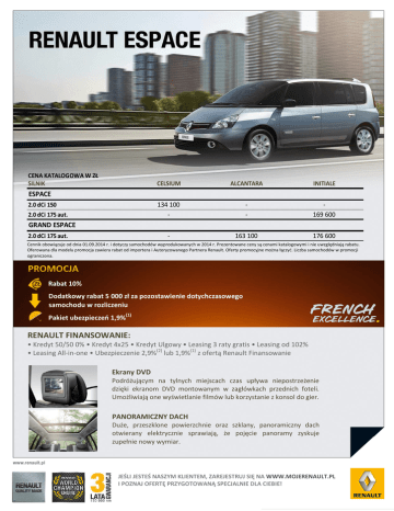 CENA KATALOGOWA W ZŁ SILNIK CELSIUM ALCANTARA INITIALE 134 100 - - 169 600 - 163 100 176 600 ESPACE 2.0 dCi 150 2.0 dCi 175 aut. GRAND ESPACE 2.0 dCi 175 aut. Cennik obowiązuje od dnia 01.09.2014 r. i dotyczy samochodów wyprodukowanych w 2014 r. Prezentowane ceny są cenami katalogowymi i nie uwzględniają rabatu. Oferowana dla modelu promocja zawiera rabat od importera i Autoryzowanego Partnera Renault. Oferty promocyjne można łączyć. Liczba samochodów w promocji ograniczona. Rabat 10% Dodatkowy rabat 5 000 zł za pozostawienie dotychczasowego samochodu w rozliczeniu Pakiet ubezpieczeń 1,9%(1) RENAULT FINANSOWANIE: • Kredyt 50/50 0% • Kredyt 4x25 • Kredyt Ulgowy • Leasing 3 raty gratis • Leasing od 102% • Leasing All-in-one • Ubezpieczenie 2,9%(2) lub 1,9%(1) z ofertą Renault Finansowanie Ekrany DVD Podróżującym na tylnych miejscach czas upływa niepostrzeżenie dzięki ekranom DVD montowanym w zagłówkach przednich foteli. Umożliwiają one wyświetlanie filmów lub korzystanie z konsol do gier. PANORAMICZNY DACH Duże, przeszklone powierzchnie oraz szklany, panoramiczny dach otwierany elektrycznie sprawiają, że pojęcie panoramy zyskuje zupełnie nowy wymiar. JEŚLI JESTEŚ NASZYM KLIENTEM, ZAREJESTRUJ SIĘ NA WWW.MOJERENAULT.PL I POZNAJ OFERTĘ PRZYGOTOWANĄ SPECJALNIE DLA CIEBIE! WYPOSAŻENIE Celsium Alcantara Initiale ● 2 500 ● ● ● 2 500 ● ● ● ● 0 ● ● ● ● ● ● - ● ● 7 650 ● ● 7 650 ● ● ● ● ● ● ● ● ● ● ● ● ● ● ● ● ● ● ● ● ● ● ● ● ● ● 1 300 / P ● ● ● ● ● ● ● 1 680 / P ● ● ● ● ● ● ● ● ● ● ● ● ● ● ● ● 1 180 / P ● ● ● ● 5 300 / P 600 / P ● 350 / P ● ● ● 1 180 / P ● ● ● ● 5 300 / P ● 350 ● ● ● ● ● ● ● ● ● ● ● ● ● ● 1 880 / P ● ● 1880 ● ● ● ● ● ● ● ● ● ● ● ● ● ● ● 1060 / P ● 250 290 ● ● ● 1060 ● 250 290 ● ● ● 1060 ● 290 WYGLĄD ZEWNĘTRZNY Zewnętrzne klamki drzwi w kolorze matowego chromu Lakier metalizowany Lakier niemetalizowany Listwy ozdobne przednich błotników w kolorze nadwozia Obudowy lusterek wstecznych oraz dolna listwa wzdluż przedniej szyby i przednich bocznych szyb w kolorze Czarna Perła Obręcze kół ze stopu metali lekkich 17˝ wzór Eptius ciemnografitowe Obręcze kół ze stopu metali lekkich 17" wzór Monterey Poprzeczki dachowe w kolorze nadwozia Elektrycznie otwierany, panoramiczny, szklany dach z regulowną przesłoną WYGLĄD WEWNĘTRZNY Klamka wewnętrzna w kolorze matowego chromu Obramowania nawiewów w desce rozdzielczej w kolorze czarnym błyszczącym Pdświetlane pokrętła nawiewów w desce rozdzielczej Obramowania głośników w drzwiach w kolorze matowego chromu Środkowa konsola w kolorze czarnym błyszczącym Środkowa konsola w kolorze czarnym błyszczącym z napisem Initiale Płaty drzwi pokryte skórą ekologiczną w kolorze ciemnografitowym z przeszyciami w kolorze beżowym Czteroramienna, skórzana kierownica z przyciskami regulatora-ogranicznika prędkości Skórzana gałka dźwigni zmiany biegów w kolorze ciemnografitowym ze wstawką w kolorze matowego chromu Mieszek osłony dźwigni zmiany biegów ze skóry ekologicznej w kolorze ciemnografitowym PROWADZENIE AUTA System wspomagania parkowania tyłem System wspomagania parkowania przodem i tyłem System wspomagania parkowania przodem i tyłem z kamerą cofania Elektroniczny klakson Układ kierowniczy ze wspomaganiem Automatyczny hamulec postojowy, elektromechaniczny Komputer pokładowy Regulator - ogranicznik prędkości Karta Renault Hands Free WIDOCZNOŚĆ Czujnik deszczu i światła Funkcja oświetlania drogi do domu Follow me home Podgrzewana tyna szyba Otwierana szyba w klapie bagażnika Atermiczna przednia szyba Przyciemniane boczne szyby Reflektory przeciwmgłowe Reflektory halogenowe ze światłami do jazdy dziennej wykonanymi w technologii LED Reflektory ksenonowe ze światłami do jazdy dziennej wykonanymi w technologii LED Spryskiwacze reflektorów Wewnętrzne lusterko wsteczne z przełącznikiem dzień / noc Fotochromatyczne wewnętrzne lusterko wsteczne Elektrycznie regulowane, składane i podgrzewane lusterka wsteczne, asferyczne po stronie kierowcy, z wbudowanym czujnikiem temperatury zewnetrznej KOMFORT I ELEMENTY WYSTROJU WNĘTRZA Automatyczna klimatyzacja z możliwością regulacji z przodu Automatyczna klimatyzacja z możliwością regulacji z przodu i z tyłu Kierownica z regulacją ustawienia w pionie i poziomie KOMFORT I ELEMENTY WYSTROJU WNĘTRZA C.D Kierownica z regulacją ustawienia w pionie i poziomie Elektryczne, impulsowe podnośniki szyb z przeodu i z tyłu, z funkcją zapobiegania przycięciu palców Osłona przeciwsłoneczna po stronie kierowcy i pasażera z lusterkiem zamykanym, przesuwaną klapką oraz dodatkowa, wysuwana środkowa osłona przeciwsłoneczna Wewnętrzny uchwyt opuszczania klapy bagażnika 3 gniazda 12V 2 żaluzje przeciwsłoneczne 4 żaluzje przeciwsłoneczne 6 żaluzji przeciwsłonecznych Dywaniki podłogowe w 1. rzędzie Dywanik podłogowe w 1. i 2. rzędzie Dywaniki podłogowe w 1., 2. i 3. rzędzie Celsium Alcantara Initiale Zdejmowane podłokietniki tylnych foteli z regulacją nachylenia Pogrzewane fotele przednie - 1 600 ● ● ● Przednie fotele regulowane manualnie ● ● - Przednie fotele regulowane elektrycznie - - ● Tylne siedzenia z wbudowanymi pasami bezpieczeństwa, składane do położenia stolika, mocowane na prowadnicach, przystosowane do mocowania fotelików dziecięcych ISOFIX ● ● ● 3 720 5 400 7 080 ● - - SIEDZENIA - TAPICERKA 2 dodatkowe tylne fotele Tapicerka materiałowa wykonana w technologii Teflon ® z elementami skóry ekologicznej w kolorze ciemnografitowym Tapicerka z alkantary z elementami skóry ekologicznej w kolorze ciemnografitowym 3 900 ● - Tapicerka skórzana z elementami skóry ekologicznej w kolorze ciemnografitowym - - ● Tapic