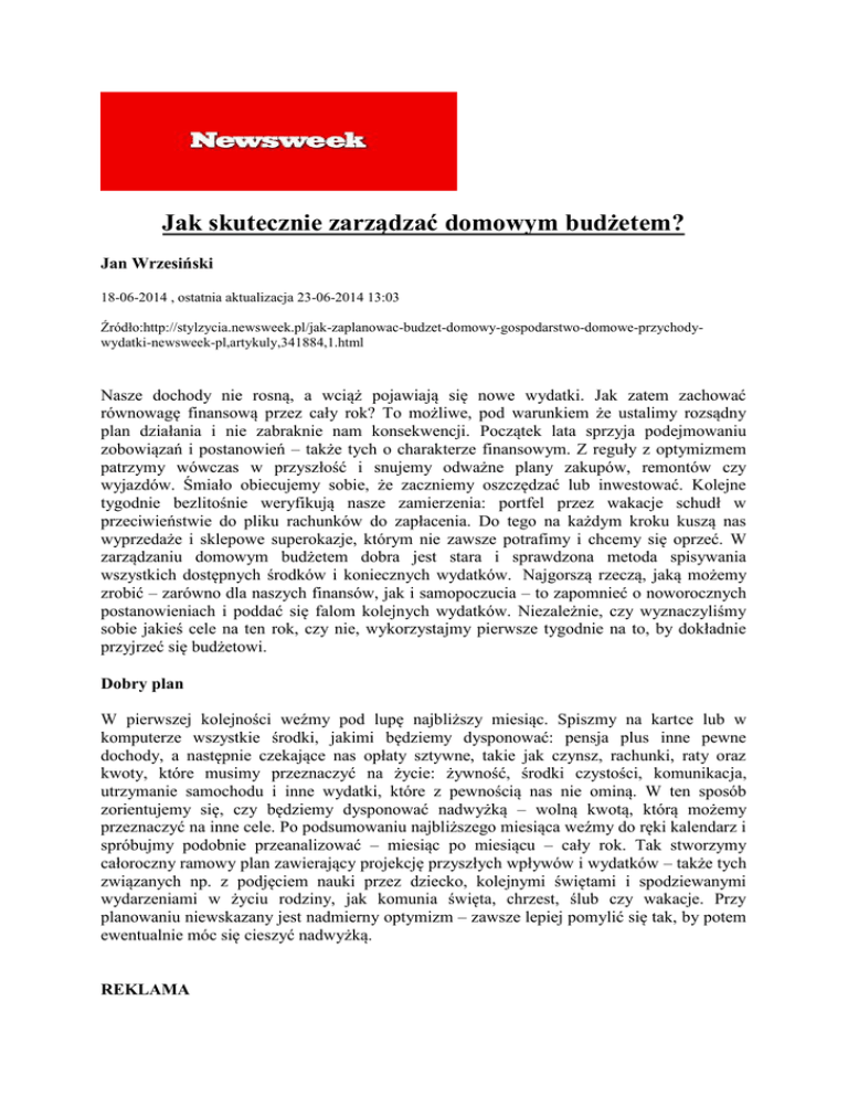 Jak skutecznie zarządzać domowym budżetem? Jan Wrzesiński 18-06-2014 , ostatnia aktualizacja 23-06-2014 13:03 Źródło:http://stylzycia.newsweek.pl/jak-zaplanowac-budzet-domowy-gospodarstwo-domowe-przychodywydatki-newsweek-pl,artykuly,341884,1.html Nasze dochody nie rosną, a wciąż pojawiają się nowe wydatki. Jak zatem zachować równowagę finansową przez cały rok? To możliwe, pod warunkiem że ustalimy rozsądny plan działania i nie zabraknie nam konsekwencji. Początek lata sprzyja podejmowaniu zobowiązań i postanowień – także tych o charakterze finansowym. Z reguły z optymizmem patrzymy wówczas w przyszłość i snujemy odważne plany zakupów, remontów czy wyjazdów. Śmiało obiecujemy sobie, że zaczniemy oszczędzać lub inwestować. Kolejne tygodnie bezlitośnie weryfikują nasze zamierzenia: portfel przez wakacje schudł w przeciwieństwie do pliku rachunków do zapłacenia. Do tego na każdym kroku kuszą nas wyprzedaże i sklepowe superokazje, którym nie zawsze potrafimy i chcemy się oprzeć. W zarządzaniu domowym budżetem dobra jest stara i sprawdzona metoda spisywania wszystkich dostępnych środków i koniecznych wydatków. Najgorszą rzeczą, jaką możemy zrobić – zarówno dla naszych finansów, jak i samopoczucia – to zapomnieć o noworocznych postanowieniach i poddać się falom kolejnych wydatków. Niezależnie, czy wyznaczyliśmy sobie jakieś cele na ten rok, czy nie, wykorzystajmy pierwsze tygodnie na to, by dokładnie przyjrzeć się budżetowi. Dobry plan W pierwszej kolejności weźmy pod lupę najbliższy miesiąc. Spiszmy na kartce lub w komputerze wszystkie środki, jakimi będziemy dysponować: pensja plus inne pewne dochody, a następnie czekające nas opłaty sztywne, takie jak czynsz, rachunki, raty oraz kwoty, które musimy przeznaczyć na życie: żywność, środki czystości, komunikacja, utrzymanie samochodu i inne wydatki, które z pewnością nas nie ominą. W ten sposób zorientujemy się, czy będziemy dysponować nadwyżką – wolną kwotą, którą możemy przeznaczyć na inne cele. Po podsumowaniu najbliższego miesiąca weźmy do ręki kalendarz i spróbujmy podobnie przeanalizować – miesiąc po miesiącu – cały rok. Tak stworzymy całoroczny ramowy plan zawierający projekcję przyszłych wpływów i wydatków – także tych związanych np. z podjęciem nauki przez dziecko, kolejnymi świętami i spodziewanymi wydarzeniami w życiu rodziny, jak komunia święta, chrzest, ślub czy wakacje. Przy planowaniu niewskazany jest nadmierny optymizm – zawsze lepiej pomylić się tak, by potem ewentualnie móc się cieszyć nadwyżką. REKLAMA Nie wszystko oczywiście da się przewidzieć. Nasz plan zatem będzie zawsze miał charakter jedynie orientacyjny i niewykluczone, że rozmaite okoliczności zmuszą nas do jego skorygowania. Skonstruowanie go pozwoli nam jednak z dystansu spojrzeć na całoroczne finanse. Ujemny bilans Stworzenie całorocznej „mapy drogowej” rodzinnych finansów jest stosunkowo proste, a budżet domowy niezagrożony, jeśli z wyliczeń wynika, że możemy liczyć na jakąś nadwyżkę. Co jednak zrobić, gdy bilans jest ujemny i nie ma szans na zwiększenie dochodów? Oczywiście wiele zależy od skali niezbilansowania. W pierwszej kolejności warto szukać rozwiązań najprostszych (to wcale nie znaczy, że łatwych) i bezkosztowych (ale niekoniecznie bezbolesnych), przede wszystkim polegających na racjonalizacji wydatków. Przyjrzyjmy się dokładnie stałym rachunkom. Może wprowadzenie drobnych korekt w życiu codziennym pozwoli na zmniejszenie opłat? Dzięki np. zmianie sposobu zmywania naczyń, zastąpieniu kąpieli w wannie prysznicem, wyłączaniu nieużywanych w danym momencie urządzeń elektrycznych (ładowarki, telewizora) czy dopasowaniu rozmiaru garnków do wielkości palników można zaoszczędzić sporo pieniędzy. A przecież takich prostych i w miarę bezbolesnych sposobów na oszczędzanie jest wiele. Nie zaszkodzi też poszukać innych dostawców niektórych usług – tańszego banku czy operatora telefonii. Postarajmy się również starannie przyjrzeć naszym zakupom. Chodźmy na nie z uprzednio przygotowaną listą produktów i nabywajmy tylko to, co się na niej znajduje. Unikniemy w ten sposób zakupu rzeczy przypadkowych, przeważnie – jak się później okazuje – zupełnie niepotrzebnych. Nie każdemu oczywiście odpowiada model zakupowy pod hasłem: wpaść, zgarnąć to, co najpotrzebniejsze, i wyjść. Jeśli ktoś lubi zakupy i ceni sobie w nich pewną dozę nieprzewidywalności albo chce od czasu do czasu ulec małym kaprysom, może spróbować zapanować nad swoim temperamentem, ustalając z góry, jeszcze przed wyjściem na sklepowe łowy, nieprzekraczalny, bezpieczny dla domowych finansów limit, kwotę, której nawet w największej gorączce zakupowej nie przekroczy. Nie pożyczaj W sytuacji, gdy budżet domowy wciąż nie chce się dopiąć, wiele osób ulega pokusie skorzystania z oferty pożyczek. To błąd. Jeśli planujemy większy zakup, a nie mamy poważniejszych problemów finansowych albo nasze kłopoty są tylko przejściowe i mamy pewność, że szybko miną, to skorzystanie z oferty kredytowej będzie miało sens. Kredyt po prostu ułatwia nam wtedy życie – dzięki niemu nie musimy oszczędzać latami, by kupić samochód lub pojechać na wymarzoną wycieczkę. Polska odpowiedź na kryzys? Oszczędzanie Jeżeli jednak co miesiąc nie możemy związać końca z końcem, a pożyczka ma nas tylko na chwilę wybawić z trwałych kłopotów, trzymajmy się z dala od tego typu rozwiązań. Kredyt nie zlikwiduje trwale braków, a w kolejnych miesiącach najprawdopodobniej nie będziemy w stanie spłacać rat, co pogłębi nasze problemy finansowe. W efekcie jako osoby, których budżet domowy ma bilans ujemny, a więc jako klienci bez tzw. zdolności kredytowej, będziemy skazani wyłącznie na najdroższe oferty. Za moment radości