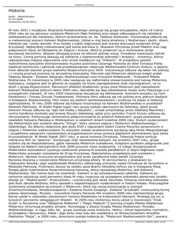 Misternicy Kaszubscy Historia Autor: Administrator 07.04.2008. Zmieniony 24.03.2012. W roku 2001 z inicjatywy Wojciecha Rybakowskiego zawiązuje się grupa entuzjastów, która 16 marca 2002 roku po raz pierwszy wystawia Misterium Męki Pańskiej przy okazji odbywających się rekolekcji wielkopostnych dla młodzieży, którym przewodniczy ks. bp. Tadeusz Gocłowski. Inscenizacja odbywa się w malowniczej scenerii Kalwarii Wejherowskiej. Udział w niej biorą amatorzy z Wejherowa i okolic: dzieci, młodzież jak i osoby dorosłe. Przy każdej z kaplic odgrywana jest scenka dotycząca wydarzeń Drogi Krzyżowej. Najbardziej rozbudowana jest scena pierwsza tj. Skazanie Chrystusa przed Piłatem oraz ciąg połączonych stacji od Obnażenia do Zdjęcia z Krzyża. Aktorzy przebrani są w stylizowane stroje ówczesnej Jerozolimy. Skazani dźwigają krzyże na których później wiszą. Orszakowi towarzyszy Setnik na koniu. Cenną pomocą okazują się żołnierze z wejherowskiej jednostki i strażacy - ochotnicy, którzy zabezpieczają miejsca odgrywania scen przed modlącymi się "widzami". W przepiekny sposób rozbrzmiewa specjalnie skomponowana muzyka autorstwa Cezarego Paciorka do słów Tomasza Pohla. Zaplecze techniczne i patronat nad przedsięwzięciem obejmuje Wejherowskie Centrum Kultury, a główny trzon aktorski stanowi grupa teatralna Eksperyment przy WCK. Inscenizacja odbywa się także rok później i z roczną przerwą powraca na Jerozolimę Kaszubską. Patronat nad Misterium obejmuje ksiądz prałat Tadeusz Reszka - Dziekan Dekanatu Wejherowskiego oraz Krzysztof Hildebrandt - Prezydent Miasta Wejherowa. Po inscenizacji w 2005 roku zawiązuje się nieformalne stowarzyszenie pod nazwą Misternicy Kaszubscy, związane jest to głównie ze względu na liczne zaangażowanie osób niezwiązanych, na co dzień z grupą Eksperyment. Pierwszym efektem działalności grupy poza Misterium jest nawiedzenie Kalwarii Wielewskiej późnym latem 2005 roku. Narodziła się idea odwiedzania miejsc kultu Pasyjnego a w szczególności Kalwarii. W roku 2005 inscenizacja doczekuje się sfilmowania. Autorami projektu są Yach Paszkiewicz i Tomasz Żmuda Trzebiatowski. Premiera filmu odbywa się rok później przy pełnych ławkach w Kolegiacie Wejherowskiej. Film cieszy się wielkim zainteresowaniem i oczekuje na pokaz w telewizji ogólnopolskiej. W roku 2006 odbywa się kolejna inscenizacja na Kalwarii Wejherowskiej w przeddzień Niedzieli Palmowej. W Wielki Piątek tegoż roku grupa zostaje zaproszona do Gdańska, gdzie przed Dworem Artusa odbywa się "sąd nad Cieślą z Nazaretu", orszak przechodząc przez Gdańską Starówkę i centra handlowe dochodzi pod bramę Stoczni Gdańskiej, gdzie przy pomniku Trzech Krzyży odbywa się Ukrzyżowanie. Kontynuując zamierzenia pielgrzymowania po polskich Kalwariach, grupa postanawia nawiedzić Kalwarie Pakoską w Wielkopolsce w ostatnich dniach kwietnia 2006 roku. Dużym wydarzeniem dla Misterników jest wydanie albumu "Droga", który zawiera zdjęcia z Misterium Wejherowskiego i Gdańskiego. Do albumu dołączona jest płyta DVD z nagraniami pieśni Czarka Paciorka oprawionymi w zdjęcia z Misteriów wejherowskich.To wszystko zostało przetworzone wprawną ręką Mirka Miłogrodzkiego i uzupełnione pasyjnymi rozważaniami przygotowanymi przez przeora gdańskich dominikanów ojca Jacka Krzysztofowicza. W Wielki Piątek 2007 roku, w porze konania Chrystusa, Telewizja Polska emituje nakręcony film na "jedynce". Kontynując chęć nawiedzania kalwarii, we wrześniu 2007 roku, grupa wybiera się do Niepokalanowa, gdzie nawiedza Misterium kukiełkowe. Kolejnym punktem pielgrzymki jest Golgota na Wałach Jasnogórskich.Rok 2008 przynosi nowe wydarzenia. 12 lutego Stowarzyszenie Misterników Kaszubskich uzyskuje osobowość prawną.W kościele parafialnym w Gdyni-Dąbrowie część Misterników prowadzi rozważania do Drogi Krzyżowej. Nabożeństwo przeplatane jest scenkami z Misterium. Oprawa muzyczna przygotowana jest przez parafianina tejże parafii Cezarego Paciorka.Starania o rozszerzenie Misterium przynoszą efekty. W porozumieniu z dziekanem ks. Tadeuszem Reszką i jego współudziale Misternicy odtwarzają uroczysty wjazd Chrystusa do Jerozolimy w Niedzielę Palmową. Przemarsz Jezusa na osiołku spod Bramy Oliwskiej kończy się w Kolegiacie Mszą Świętą gdzie rozbrzmiewa Hosanna!Kolejną Kalwarią, którą nawiedzają Misternicy jest Kalwaria Wejherowska. Nie można było nie podziwiać Kalwarii w jej odrestaurowanej odsłonie. Kalwaria po remoncie odzyskuje swój pierwotny blask.W maju rozgrywa się przepiękne widowisko plenerowe światłodźwięk pt: "Wejheropolis". Producentem, i scenarzystą jest Jacek Spychała. Postacią centralną widowiska jest duch Jakuba Wejhera, który opoiada o najważniejszych wydarzeniach w historii miasta. Poszczególne wydarzenia przeplatane są scenami z Misterium, które ma swoją kontynuację w scenach Zmartwychwstania, Wniebowstapienia i Zesłania Ducha Świętego. Zesłanie "przybrało" nowoczesną formę pokazu laserowego. Muzyka - oczywiście Cezary Paciorek.We wrześniu 2008 roku reprezentacja grupy bierze udział w widowisku plenerowym Victoria Wiedeńska na krakowskich błoniach. Wcielają się oni w tureckich janczarów oblegających Wiedeń. W 2009 roku misternicy biorą udział w inscenizacji "Znak Gryfa" w Szczecinie oraz "Oblężenie Malborka" i "Magic Malbork".Z pomocą Urzędu Miasta Wejherowa Misternicy otrzymują projekty strojów. Korzystając z dotacji Urzędu Miasta Wejherowa i Powiatu Wejherowskiego, w ciągu kilku lat, grupa uzyskuje nowe kostiumy. Hełmy i stroje legionistów rzymskich, arcykapłana i faryzeuszy, Piłata i jego świty oraz ludu.We współpracy ze Stowarzyszeniem Artystów Plastyków "Pasja", w 2009 roku, stworzona zostaje kolekcja pt. "Misterium Wejherowskich Gór", zawiera http://www.misternicy.wejherowo.pl Kreator PDF Utworzono 7 March, 2017, 13:24 Misternicy Kaszubscy 