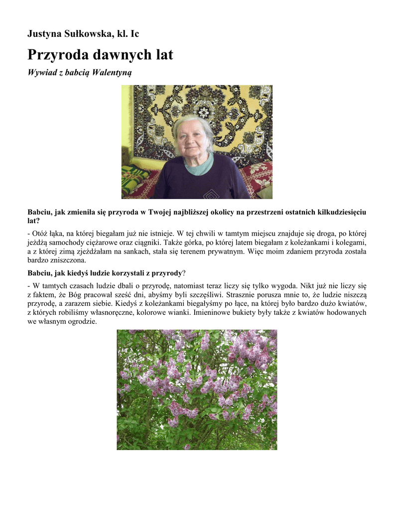 Justyna Sułkowska, kl. Ic Przyroda dawnych lat Wywiad z babcią Walentyną Babciu, jak zmieniła się przyroda w Twojej najbliższej okolicy na przestrzeni ostatnich kilkudziesięciu lat? - Otóż łąka, na której biegałam już nie istnieje. W tej chwili w tamtym miejscu znajduje się droga, po której jeżdżą samochody ciężarowe oraz ciągniki. Także górka, po której latem biegałam z koleżankami i kolegami, a z której zimą zjeżdżałam na sankach, stała się terenem prywatnym. Więc moim zdaniem przyroda została bardzo zniszczona. Babciu, jak kiedyś ludzie korzystali z przyrody? - W tamtych czasach ludzie dbali o przyrodę, natomiast teraz liczy się tylko wygoda. Nikt już nie liczy się z faktem, że Bóg pracował sześć dni, abyśmy byli szczęśliwi. Strasznie porusza mnie to, że ludzie niszczą przyrodę, a zarazem siebie. Kiedyś z koleżankami biegałyśmy po łące, na której było bardzo dużo kwiatów, z których robiliśmy własnoręczne, kolorowe wianki. Imieninowe bukiety były także z kwiatów hodowanych we własnym ogrodzie. Co było, Twoim zdaniem Babciu, przyczyną zmian w środowisku? - Myślę, że przyrodę na gorsze zmieniły nawozy używane przez rolników. Kiedy ja biegałam jako malutkie dziecko, nie używano żadnych sztucznym nawozów, wszystko robiliśmy własnoręcznie. No i nie oszukujmy się, były to ciężkie lata, kiedy mój tata stał parę godzin za żywnością, a ja, jako najstarsza z rodzeństwa, musiałam bardzo dużo pomóc mojej mamie. Jakie gatunki roślin i zwierząt były kiedyś liczniejsze niż teraz? - Moim zdaniem więcej było roślin leczniczych, między innymi różne zioła. Przeważającą część zwierząt, moim zdaniem, były dzikie zwierzęta na przykład dziki lub lisy, które „wykradały” nam kury, ale było też dużo owiec. Zdecydowanie mniej było bydła. Jakie gatunki roślin i zwierząt uprawiano w przydomowych ogródkach kwiatowych, warzywnych i drzewa owocowe w sadach? - Bardzo popularna była także hodowla pomidorów naturalna, bo w dzisiejszych czasach gospodarze bardziej posługują się hodowlą z nawozami, aby pobudzić ich wzrost. W moim ogrodzie zawsze znajdowały się tylko te owoce, które były jak najbardziej zdrowe i z witaminami. Sad zawsze był zadbany, gdyż rządził nim mój mąż, a twój dziadek. Znajdowała się w nim jabłoń, która jest do dziś. Jakie rośliny uprawiali rolnicy, kiedy ty byłaś mała Babciu? - Mój tata, a twój pradziadek uprawiali głównie zboża, a były to: jęczmień, owies i pszenica. Mieliśmy też własne ziemniaki i buraki. Bardzo dziękuję za rozmowę Babciu.