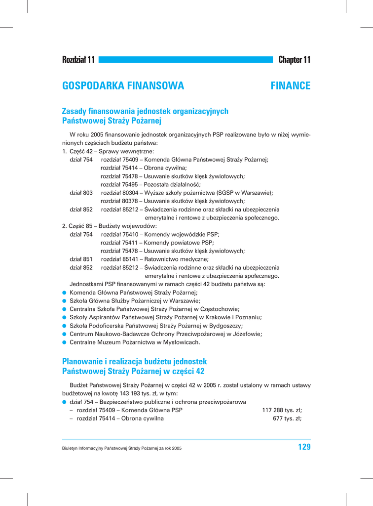 Rozdzia³ 11 GOSPODARKA FINANSOWA Chapter 11 FINANCE Zasady finansowania jednostek organizacyjnych Pañstwowej Stra¿y Po¿arnej W roku 2005 finansowanie jednostek organizacyjnych PSP realizowane by³o w ni¿ej wymienionych czêœciach bud¿etu pañstwa: 1. Czêœæ 42 – Sprawy wewnêtrzne: dzia³ 754 rozdzia³ 75409 – Komenda G³ówna Pañstwowej Stra¿y Po¿arnej; rozdzia³ 75414 – Obrona cywilna; rozdzia³ 75478 – Usuwanie skutków klêsk ¿ywio³owych; rozdzia³ 75495 – Pozosta³a dzia³alnoœæ; dzia³ 803 rozdzia³ 80304 – Wy¿sze szko³y po¿arnictwa (SGSP w Warszawie); rozdzia³ 80378 – Usuwanie skutków klêsk ¿ywio³owych; dzia³ 852 rozdzia³ 85212 – Œwiadczenia rodzinne oraz sk³adki na ubezpieczenia emerytalne i rentowe z ubezpieczenia spo³ecznego. 2. Czêœæ 85 – Bud¿ety wojewodów: dzia³ 754 rozdzia³ 75410 – Komendy wojewódzkie PSP; rozdzia³ 75411 – Komendy powiatowe PSP; rozdzia³ 75478 – Usuwanie skutków klêsk ¿ywio³owych; dzia³ 851 rozdzia³ 85141 – Ratownictwo medyczne; dzia³ 852 rozdzia³ 85212 – Œwiadczenia rodzinne oraz sk³adki na ubezpieczenia emerytalne i rentowe z ubezpieczenia spo³ecznego. Jednostkami PSP finansowanymi w ramach czêœci 42 bud¿etu pañstwa s¹: l Komenda G³ówna Pañstwowej Stra¿y Po¿arnej; l Szko³a G³ówna S³u¿by Po¿arniczej w Warszawie; l Centralna Szko³a Pañstwowej Stra¿y Po¿arnej w Czêstochowie; l Szko³y Aspirantów Pañstwowej Stra¿y Po¿arnej w Krakowie i Poznaniu; l Szko³a Podoficerska Pañstwowej Stra¿y Po¿arnej w Bydgoszczy; l Centrum Naukowo-Badawcze Ochrony Przeciwpo¿arowej w Józefowie; l Centralne Muzeum Po¿arnictwa w Mys³owicach. Planowanie i realizacja bud¿etu jednostek Pañstwowej Stra¿y Po¿arnej w czêœci 42 Bud¿et Pañstwowej Stra¿y Po¿arnej w czêœci 42 w 2005 r. zosta³ ustalony w ramach ustawy bud¿etowej na kwotê 143 193 tys. z³, w tym: l dzia³ 754 – Bezpieczeñstwo publiczne i ochrona przeciwpo¿arowa – rozdzia³ 75409 – Komenda G³ówna PSP 117 288 tys. z³; – rozdzia³ 75414 – Obrona cywilna 677 tys. z³; Biuletyn Informacyjny Pañstwowej Stra¿y Po¿arnej za rok 2005 129 Rozdzia³ 11 Chapter 11 l dzia³ 803 – Szkolnictwo wy¿sze – rozdzia³ 80304 – Wy¿sze szko³y po¿arnictwa 25 176 tys. z³; l dzia³ 852 – Opieka spo³eczna – rozdzia³ 85212 – Œwiadczenia rodzinne oraz sk³adki na ubezpieczenia emerytalne i rentowe z ubezpieczenia spo³ecznego 52 tys. z³. W roku 2005 r. bud¿et jednostek nadzorowanych przez Komendê G³ówn¹ PSP zwiêkszony zosta³ o œrodki finansowe m.in.: l z rezerwy celowej: – w rozdziale 75409 na sfinansowanie dodatku s³u¿by cywilnej (wraz z pochodnymi) dla urzêdników mianowanych – 13,9 tys. z³; – w rozdziale 75409 na poligon po¿arniczy w Bornem Sulinowie w zwi¹zku z realizacj¹ programu „Zagospodarowanie przejêtego mienia i rekultywacji terenów zdegradowanych przez wojska Federacji Rosyjskiej” – 600 tys. z³; – w rozdziale 75409 na dotacje dla jednostek ochrony przeciwpo¿arowej dzia³aj¹cych w ramach Krajowego Systemu Ratowniczo-Gaœniczego – 5000 tys. z³; – w rozdziale 75478 na zakup sprzêtu do usuwania klêsk ¿ywio³owych i masowych zagro¿eñ – 5000 tys. z³; – w rozdziale 80304 na sfinansowanie kosztów zwi¹zanych z odbywaniem przez studentów i studentki w 2005 r. przysposobienia obronnego prowadzonego w systemie samokszta³cenia i konsultacji zakoñczonego egzaminem – 28,5 tys. z³; – w rozdziale 80378 na sfinansowanie zakupu ciê¿kiego samochodu specjalistycznego przeznaczonego do dzia³añ zwi¹zanych z usuwaniem skutków powodzi, awarii chemicznych i innych dzia³añ ratowniczo-gaœniczych prowadzonych w sytuacjach zaistnienia klêsk ¿ywio³owych – 500 tys. z³; – w rozdziale 80378 na dofinansowanie zakupu kontenera kwatermistrzowsko-socjalnego z przeznaczeniem magazynowym dla 60 osób – 350 tys. z³; l z rezerwy ogólnej: – w rozdziale 75409 o kwotê 379 tys. z³ z przeznaczeniem na odtworzenie zapasów magazynowych i innych darów przekazanych przez Polsk¹ Misjê Medyczn¹ (224 tys. z³), Polski Czerwony Krzy¿ (10 tys. z³) i Caritas (145 tys. z³), rz¹dowi Rumunii w ramach pomocy humanitarnej; – w rozdziale 75495 o kwotê 35 tys. z³ na realizacjê zadañ zwi¹zanych z pobytem w Polsce obywatelek polskich i ich rodzin ewakuowanych z Iraku. Ponadto na podstawie decyzji ministra spraw wewnêtrznych i administracji zwiêkszono plan w rozdziale 75409 o kwotê 600 tys. z³ – na zakoñczenie robót budowlanych w obiektach Szko³y Aspirantów PSP w Poznaniu, 50 tys. z³ – dla Komendy G³ównej PSP w zwi¹zku z udzia³em w akcji poszukiwawczo-ratowniczej w Pakistanie oraz 52 tys. z³ – na dodatkowe szkolenia przeprowadzane w Centralnej Szkole PSP w Czêstochowie. Do realizacji w 2006 r. jako wydatki bud¿etu pañstwa, które w roku 2005 nie wygasaj¹ z up³ywem roku bud¿etowego zosta³a przesuniêta kwota 5326 tys. z³, z czego: l w rozdziale 75409: – w ramach inwestycji wieloletniej KSRG kwota – 550 tys. z³; 130 Biuletyn Informacyjny Pañstwowej Stra¿y Po¿arnej za rok 2005 Rozdzia³ 11 Chapter 11 – na zakup wyposa¿enia pomieszczeñ serwerowni w KG PSP kwota – 350 tys. z³; – na zakup 2 samochodów ratownictwa drogowego w ramach po¿yczki Banku Œwiatowego nr 7223 POL – 196 tys. z³; – zakup samochodów ratownictwa technicznego w ramach Sektorowego Programu Operacyjnego Transport – 1012 tys. z³; l w rozdziale 75478: – zakup sprzêtu do usuwania skutków klêsk ¿ywio³owych i masowych zagro¿eñ – 3218 tys. z³. Tabela 53. Bud¿et jednostek nadzorowanych przez Komendê G³ówn¹ PSP po dokonanych zmianach Plan na 2005 r. (w tys. z³) Wykonanie w 2005 r. (w tys. z³) 1. Wydatki p³acowe wraz z pochodnymi 41 089 41 049 2. Wydatki rzeczowe 27 909 27 874 3. Dotacje 34 154 34 143 4. Wydatki maj¹tkowe 20 958 18 850 124 114 121 916 551 517 5000 1782 35 33 129 700 124 248 23 704 23 704 1500 1500 850 850 26 054