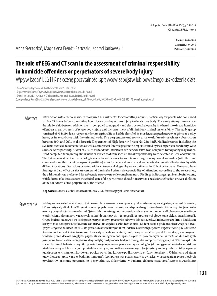 © Psychiatr Psychol Klin 2016, 16 (3), p. 131–135 DOI: 10.15557/PiPK.2016.0018 Anna Sieradzka1, Magdalena Erendt-Bartczak2, Konrad Jankowski3 Received: 06.06.2016 Accepted: 27.06.2016 Published: 30.09.2016 The role of EEG and CT scan in the assessment of criminal responsibility in homicide offenders or perpetrators of severe body injury Wpływ badań EEG i TK na ocenę poczytalności sprawców zabójstw lub poważnego uszkodzenia ciała Anna Sieradzka Psychiatric Medical Practice “Dermed”, Lodz, Poland Department of Forensic Psychiatry Babinski’s Memorial Hospital in Lodz, Lodz, Poland 3 Department of Adult Psychiatry “D” of Babinski’s Memorial Hospital in Lodz, Lodz, Poland Correspondence: Anna Sieradzka, Specjalistyczne Gabinety Lekarskie Dermed, ul. Piotrkowska 48, 90-265 Łódź, tel.: +48 668 816 178, e-mail: [email protected] 1 2 Abstract Intoxication with ethanol is widely recognized as a risk factor for committing a crime, particularly for people who consumed alcohol 24 hours before committing homicide or causing serious injury to the victim’s body. The study attempts to evaluate the relationship between additional tests: computed tomography and electroencephalography in ethanol intoxicated homicide offenders or perpetrators of severe body injury and the assessment of diminished criminal responsibility. The study group consisted of 90 individuals suspected of crime against life or health, classified as murder, attempted murder or grievous bodily harm, as in accordance with the criminal code. The perpetrators underwent a six-week forensic psychiatry observation between 2004 and 2008 in the Forensic Department of High Security Prison No. 2 in Łódź. Medical records, including the available medical documentation as well as categorical forensic psychiatric reports issued by two experts in psychiatry, were assessed retrospectively. A total of 77% of respondents underwent further extensive head computed tomography diagnostics. Head computed tomography abnormalities related to diminished criminal responsibility were detected in 37% of offenders. The lesions were described by radiologists as ischaemic lesions, ischaemic softening, developmental anomalies (with the most common being the cyst of transparent partition) as well as cortical, subcortical and cortical-subcortical brain atrophy with different locations. Deviations detected with electroencephalography were confirmed in 11% of defendants. However, these findings had no effect on the assessment of diminished criminal responsibility of offenders. According to the researchers, the additional tests performed for a forensic report were only complementary. Findings indicating significant brain lesions, which do not take into account the clinical state of the perpetrator, should not serve as a basis for a reduction or even abolition of the soundness of the perpetrator of the offense. Key words: sanity, alcohol intoxication, EEG, CT, forensic psychiatric observation Streszczenie Intoksykacja alkoholem etylowym jest powszechnie uznawana za czynnik ryzyka dokonania przestępstwa, szczególnie u osób, które spożywały alkohol na 24 godziny przed popełnieniem zabójstwa lub poważnego uszkodzenia ciała ofiary. Podjęto próbę oceny poczytalności sprawców zabójstwa lub poważnego uszkodzenia ciała w stanie upojenia alkoholowego zwykłego w odniesieniu do przeprowadzonych badań dodatkowych – tomografii komputerowej głowy oraz elektroencefalografii. Grupę badaną stanowiło 90 osób podejrzanych o czyn przeciwko zdrowiu lub życiu, zakwalifikowany zgodnie z kodeksem karnym jako zabójstwo, usiłowanie zabójstwa lub ciężkie uszkodzenie ciała. Badani zostali poddani obserwacji sądowo-psychiatrycznej w latach 2004–2008 przez okres sześciu tygodni w Oddziale Obserwacji Sądowo-Psychiatrycznej w Zakładzie Karnym nr 2 w Łodzi. Analizowano retrospektywnie dokumentację medyczną, w tym dostępną dokumentację lekarską oraz wydane przez dwóch biegłych psychiatrów kategoryczne opinie sądowo-psychiatryczne. U 77% osób badanych przeprowadzono dalszą szczegółową diagnostykę pod postacią badania tomografii komputerowej głowy. U 37% podsądnych stwierdzono odchylenia od wyniku prawidłowego opisywane przez lekarzy radiologów jako mogące odpowiadać ogniskom niedokrwiennym lub malacjom poniedokrwiennym, anomaliom rozwojowym (najczęstszą zmianą była torbiel przegrody przeźroczystej) i zanikom korowym, podkorowym lub korowo-podkorowym, o różnej lokalizacji. Odchylenia od stanu prawidłowego opisywane w badaniu tomografii komputerowej pozostawały w związku w orzeczeniem przez biegłych psychiatrów znacznie ograniczonej poczytalności. Odchylenia w badaniu elektroencefalograficznym stwierdzono 131 © Medical Communications Sp. z o.o. This is an open-access article distributed under the terms of the Creative Commons Attribution-NonCommercial-NoDerivatives License (CC BY-NC-ND). Reproduction is permitted for personal, educational, non-commercial use, provided that the original article is in whole, unmodified, and properly cited. Anna Sieradzka, Magdalena Erendt-Bartczak, Konrad Jankowski u 11% podsądnych. Powyższy wynik nie wpłynął na orzeczenie o zmienionej poczytalności przez biegłych lekarzy psychiatrów. W ocenie badaczy przeprowadzone badania dodatkowe celem wydania opinii sądowo-psychiatrycznej mają znaczenie pomocnicze. Wynik badania wskazujący na znaczne zmiany, bez uwzględnienia stanu klinicznego, nie powinien przesądzać o zniesieniu lub ograniczeniu poczytalności sprawcy. Słowa kluczowe: poczytalność, upojenie alkoholowe, EEG, TK, obserwacja sądowo-psychiatryczna F 132 INTRODUCTION orensic evaluation for competence to stand trial and criminal responsibility is diagnostic judgment that influences the adjudication of criminal defendants. Individuals with schizophrenia and other psychotic illness have the highest rates of incompetence. Substance abuse and organic disorders