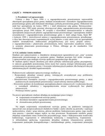 CZĘŚĆ I – WPROWADZENIE 1. Przedmiot i cel opracowania Ustawa z dnia 7 lipca 1994 r. o zagospodarowaniu przestrzennym wprowadziła obowiązek sporządzania przez gminy studium uwarunkowań i kierunków zagospodarowania przestrzennego gminy jako dokument określający politykę przestrzenną gminy. Dokument ten miał być sporządzony do końca 1999 r. i miał obejmować całą gminę. Równocześnie z końcem roku 1999 miały przestać obowiązywać plany zagospodarowania przestrzennego sporządzone przed 1995 rokiem. W związku z niewielkim zaawansowaniem w zakresie sporządzania miejscowych planów zagospodarowania przestrzennego i sporządzania studiów uwarunkowań i zagospodarowania przestrzennego gmin w skali całego kraju, Sejm RP z końcem 1999 r. znowelizował ustawę o zagospodarowaniu przestrzennym, przedłużając o dwa lata obowiązywanie wspomnianych wyżej planów a więc także czas na sporządzanie studiów uwarunkowań. Jednocześnie przygotowywany jest nowy projekt ustawy o zagospodarowaniu i planowaniu przestrzennym, który wprowadza zasadnicze zmiany w systemie planowania przestrzennego w Polsce, zbliżając go do standardów Unii Europejskiej. A/ Cel, zadania i istota studium Studium jest opracowaniem o charakterze strategicznym (generalnym) jest „osią” systemu planowania przestrzennego na poziomie gminy. Studium powinno być ściśle związane z opracowaniem typu strategia rozwoju społeczno gospodarczego dla gminy. W studium oprócz innych określona jest także polityka informacyjna gminy przynajmniej w zakresie gospodarki przestrzennej, która może być częścią strategii informacyjnej gminy zorientowanej na promocję gminy i tworzenie informacyjnych podstaw dla bieżących decyzji administracyjnych i działań organizatorskich. Podstawowymi zadaniami opracowywanego studium są: - Rozpoznanie aktualnej sytuacji gminy, istniejących uwarunkowań oraz problemów związanych z jej rozwojem; - Sformułowanie kierunków rozwoju i zagospodarowania przestrzennego gminy, a także podstawowych zasad polityki przestrzennej i zasad ochrony interesu publicznego; - Stworzenie podstaw do koordynacji sporządzania planów miejscowych i wydawania decyzji o warunkach zabudowy i zagospodarowania terenu wydawanych bez planów miejscowych; - Promocja miasta i gminy. Na proces sporządzanie studium składają się następujące prace (etapy): ♦ rozpoznanie uwarunkowań rozwoju gminy; ♦ określenie kierunków zagospodarowania przestrzennego; ♦ sformułowanie polityki przestrzennej. Na etapie rozpoznania uwarunkowań rozwoju gminy, na podstawie istniejących opracowań oraz przeprowadzonych dodatkowo badań i analiz określa się potrzeby i aspiracje społeczeństwa, władz i grup interesu, główne problemy funkcjonowania gminy, jego zasoby oraz procesy i zjawiska mające wpływ na stan przestrzeni. Rozpoznanie zasobów gminy obejmuje rozpoznanie stanu środowiska przyrodniczego, stanu i funkcjonowania środowiska kulturowego, wyposażenia w infrastrukturę techniczną i transportową, wyposażenia w infrastrukturę społeczną, rozpoznanie aktualnej struktury własnościowej gruntów, rozpoznanie potencjału demograficznego i intelektualnego gminy, rozpoznanie potencjału 6 ekonomicznego i gospodarczego, rozpoznanie sytuacji na rynku pracy i rozpoznanie problemów bezrobocia. Część prac analitycznych nad studium tworzy rzetelną bazę informacyjną nt. stanu zagospodarowania i funkcjonowania gminy, co pozwoli władzom gminy przygotować i opracować koncepcje rozwoju gminy i miejscowe plany zagospodarowania przestrzennego, podejmować decyzję administracyjne w przypadkach terenów, dla których nie opracowano planu. B/ Korzyści wynikające z opracowania studium - określenie polityki przestrzennej gminy i stworzenie podstaw dobrego gospodarowania jej przestrzenią (polityka prowadzona przez władze gminy) - usprawnienie funkcjonowania gminy w zakresie gospodarki przestrzennej (wydawanie decyzji, sporządzanie dalszych opracowań planistycznych i programów branżowych) - łatwość dostępu do informacji poprzez zbudowanie systemu informacyjnego o zagospodarowaniu przestrzennym i funkcjonowaniu gminy 2. Zagadnienia zawarte w studium, forma opracowania Na zawartość merytoryczną studium składają się trzy główne elementy: - diagnoza stanu istniejącego i funkcjonowania gminy - uwarunkowania; - kierunki zagospodarowania przestrzennego; - polityka przestrzenna gminy. Elaborat opracowania Studium składa się z następujących części: 1. Uchwały Rady Miejskiej w Drawsku Pomorskim w sprawie Studium uwarunkowań i kierunków zagospodarowania przestrzennego gminy Drawsko Pomorskie – stanowiącej Ustalenia Studium. 2. Załącznika nr 1 do Uchwały: Rysunek Studium pt. “ Drawsko Pomorskie - studium uwarunkowań i kierunków zagospodarowania przestrzennego gminy”, w skali 1:10000 ( w sekcjach ) 1:5 000 dla poszczególnych jednostek osadniczych i 1: 25 000, stanowiącego graficzny zapis opracowania, 3. Załącznika nr 2 do Uchwały: Część opisowa - studium uwarunkowań i kierunków zagospodarowania przestrzennego gminy Drawsko Pomorskie. 4. Rysunków stanowiących ilustrację graficzną analizowanych zagadnień tematycznych (schematy i mapy): a) Drawsko Pomorskie - studium uwarunkowań i kierunków zagospodarowania przestrzennego gminy – UŻYTKOWANIE TERENU (INWENTARYZACJA SYNTETYCZNA) skala 1: 10 000 i 1: 5 000. b) Drawsko Pomorskie - studium uwarunkowań i kierunków zagospodarowania przestrzennego gminy- INFRASTRUKTURA TECHNICZNA skala 1: 25 000 (1:100 000). c) Drawsko Pomorskie - studium uwarunkowań i kierunków zagospodarowania przestrzennego gminy- KOMUNIKACJA skala 1: 25 000 (1:100 000). d) Drawsko Pomorskie - studium uwarunkowań i kierunków zagospodarowania przestrzennego miasta i gminy- ŚRODOWISKO PRZYRODNICZE skala 1: 25 000 (1:100 000). e) Drawsko Pomorskie - studium uwarunkowań i kierunków zagospodarowania przestrzennego miasta i gmi