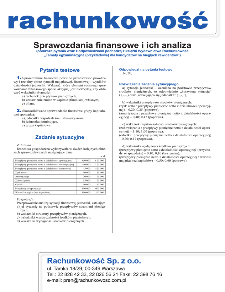 Sprawozdania finansowe i ich analiza (poniższe pytania wraz z odpowiedziami pochodzą z książki Wydawnictwa Rachunkowość „Tematy egzaminacyjne (przykładowe) dla kandydatów na biegłych rewidentów”) Pytania testowe 1. Sprawozdanie finansowe powinno przedstawiać prawdziwy i rzetelny obraz sytuacji majątkowej, finansowej i wyników działalności jednostki. Wskazać, który element rocznego sprawozdania finansowego spółki akcyjnej jest niezbędny, aby obliczyć wskaźniki płynności: a) rachunek przepływów pieniężnych, b) z estawienie zmian w kapitale (funduszu) w łasnym, c) bilans. 2. Skonsolidowane sprawozdanie finansowe grupy kapitałowej sporządza: a) jednostka współzależna i stowarzyszona, b) jednostka dominująca, c) grupa kapitałowa. Zadanie sytuacyjne Założenia Jednostka gospodarcza wykazywała w dwóch kolejnych okresach sprawozdawczych następujące dane: w zł Przepływy pieniężne netto z działalności operacyjnej +50 000 + 60 000 Przepływy pieniężne netto z działalności finansowej –5 000 +20 000 Przepływy pieniężne netto z działalności inwestycyjnej Zysk netto Amortyzacja 10 000 20 000 Zobowiązania 55 000 Odsetki Przychody ze sprzedaży –10 000 10 000 Wartość majątku (bez kapitałów) 500 000 100 000 – 20 000 Odpowiedzi na pytania testowe 1c, 2b, Rozwiązania zadania sytuacyjnego a) sytuacja jednostki – oceniana na podstawie przepływów środków pieniężnych, to odpowiednio „korzystna sytuacja” (+,-,-,) oraz „rozwijająca się jednostka” (+,-,+), b) wskaźniki przepływów środków pieniężnych: (zysk netto : przepływy pieniężne netto z działalności operacyjnej) – 0,20; 0,25 (poprawa), (amortyzacja : przepływy pieniężne netto z działalności operacyjnej) – 0,40; 0,42 (poprawa), c) wskaźniki wystarczalności środków pieniężnych: (zobowiązania : przepływy pieniężne netto z działalności operacyjnej) – 1,10; 1,00 (poprawa), (odsetki : przepływy pieniężne netto z działalności operacyjnej) – 0,20; 0,17 (poprawa), d) wskaźniki wydajności środków pieniężnych: (przepływy pieniężne netto z działalności operacyjnej : przychody ze sprzedaży) – 0,10; 0,10 (bez zmian), (przepływy pieniężne netto z działalności operacyjnej : wartość majątku bez kapitałów) – 0,50; 0,60 (poprawa). 15 000 25 000 60 000 10 000 600 000 100 000 Dyspozycje Przeprowadzić analizę sytuacji finansowej jednostki, ustalając: a) jej sytuację na podstawie przepływów strumieni pieniężnych, b) wskaźniki struktury przepływów pieniężnych, c) wskaźniki wystarczalności środków pieniężnych, d) wskaźniki wydajności środków pieniężnych. Rachunkowość Sp. z o.o. ul. Tamka 18/29; 00-349 Warszawa Tel.: 22 828 42 33, 22 826 56 21 Faks: 22 398 76 16 e-mail: [email protected]