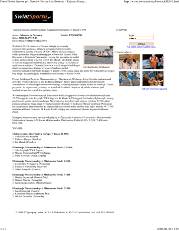 Portal Świat Sportu .pl - Sport w Polsce i na Świecie - Tadeusz Haręz... Tadeusz Haręza Motorowodnym Wicemistrzem Europy w klasie O-500 Autor: Informacja Prasowa Data: 2008-06-29 19:18 Dyscyplina: Motorowodniactwo Źródło: PZMWiW http://www.swiatsportu.pl/news,full,910.html Twój Profil login ●●●●● zaloguj W dniach 28-29 czerwca w Śremie odbyły się zawody Nie masz konta? Załóż tutaj. motorowodne podczas, których rozegrano Motorowodne Mistrzostwa Europy w klasie O-500. Odbyła się fascynująca Losowe zdjęcia walka pomiędzy Węgrem startującym w barwach Austrii Attilą Havasem, a Polakiem Tadeuszem Haręzą. Na początku do walki o złoto próbował się włączyć Czech Jiri Masek, ale defekt silnika w trzecim biegu uniemożliwił mu skuteczną walkę i w rezultacie zajął trzecie miejsce. Tadeusz Haręza w trzech biegach był drugi i fot: Bartłomiej Wichniarz dzięki swojej równej formie wywalczył srebrny medal Motorowodnych Mistrzostw Europy w klasie O-500. Klasą samą dla siebie był Attila Havas wygrał trzy biegi i bezapelacyjnie został mistrzem Europy w klasie O-500. Prezes Polskiego Związku Motorowodnego i Narciarstwa Wodnego Jerzy Czeszko podsumował zawody: Wielkie gratulacje dla Tadeusza Haręzy. Jest to jeden najbardziej utytułowanych zawodników w historii sportu motorowodnego, a dzisiaj dołożył kolejny medal do kolekcji. Trzeba przyznać, że organizatorzy stanęli na wysokości zadania i impreza się udała zarówno pod względem sportowym jak i organizacyjnym. zobacz wszystkie galerie W eliminacjach Motorowodnych Mistrzostw Polski wygrywali faworyci w młodzieżowej klasie JT-250 wygrała Ada Przybył (WKS Zegrze). W klasie S-550 wygrał Lechosław Rybarczyk, zwany profesorem sportu motorowodnego. Nieprzyjemny incydent miał miejsce w klasie T-550, gdzie podczas drugiego biegu uległ wypadkowi mistrz Europy w tej klasie Marcin Gembiak (Posnania) na szczęście po przewiezieniu do szpitala lekarze orzekli tylko drobny uraz ręki i łąkotki. W T-550 triumfował Karol Gańczak. W klasie T-400 kolejny raz triumfował Marcin Szymczak (Baszta Żnin). Następne motorowodne zawody odbędą się w Zbąszyniu w dniach 6-7 września - Motorowodne Mistrzostwa Europy S-550 oraz Motorowodne Mistrzostwa Polski O-125, T-550, T-400 oraz OSY-400. WYNIKI: Motorowodne Mistrzostwa Europy w klasie O-500: 1. Attila Havas (Austria) 2. Tadeusz Haręza (Polska) 3. Jiri Masek (Czechy) Eliminacja Motorowodnych Mistrzostw Polski JT-250: 1. Ada Przybył (WKS Zegrze) 2. Maciej Wojewódzki (WKS Zegrze) 3. Piotr Kowalski (WKS Zegrze) Eliminacje Motorowodnych Mistrzostw Polski S-550: 1. Lechosław Rybarczyk (Posnania) 2. Łukasz Ciołek (Ślizg Szczecin) 3. Adam Łabędzki (Austria) Eliminacje Motorowodnych Mistrzostw Polski T-400 1. Marcin Szymczyk (Baszta Żnin) 2. Marcin Mucha (Posnania) 3. Jacek Kołpaczyński (Ślizg Szczecin) Eliminacje Motorowodnych Mistrzostw Polski T-550 1. Karol Gańczak (Austria) 2. Krzysztof Śniadecki (Baszta Żnin) 3. Michał Gembiak (Posnania) © 2008 STIgroup sp. z o.o. | ul. ks. J. Dzierżonia 4; 42-221 Częstochowa | tel. +48 515-263-893 1z1 2008-06-30 11:01
