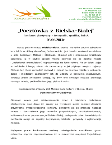 Dom Kultury w Olszówce ul. Olszówka 20d Bielsko-Biała 43-309 tel. 33 829 25 84 www.mdk.beskidy.pl e-mail: [email protected] „Pocztówka z Bielska-Białej” konkurs plastyczny – fotografia, grafika, kolaż. 03.06.2013r Nasze piękne miasto Bielsko-Biała, urzeka nie tylko swoimi zabytkami lecz także urokliwą atmosferą. Jednocześnie jest bardzo malowniczo ułożone u stóp Beskidów: Małego i Śląskiego. Bliskość gór i przepiękne krajobrazy sprawiają, iż w szybki sposób można oderwać się od zgiełku miasta i „naładować akumulatory”, odpoczywając na łonie natury. Na co dzień, żyjąc w pośpiechu i biegu, nieraz nie zauważamy w jak pięknym miejscu żyjemy. Dlatego też chcąc rozbudzić zachwyt i miłość do naszego miasta w pokoleniu dzieci i młodzieży, zapraszamy ich do udziału w konkursie plastycznym. Tworząc prace zwracamy uwagę, by były one swojego rodzaju promocją naszego miasta, podkreśleniem jego piękna i uroku. Organizatorem imprezy jest Miejski Dom Kultury w Bielsku-Białej, Dom Kultury w Olszówce. Głównym celem jest zainteresowanie dzieci i młodzieży technikami plastycznymi oraz danie im szansy na wyrażenie siebie poprzez działania artystyczne. Przeprowadzenie konkursu przyczyni się do promocji naszego miasta i dostrzeżenia jego walorów przyrodniczych, architektonicznych, kulturowych oraz popularyzacja Bielska-Białej, zachęcanie dzieci i młodzieży do zwrócenia uwagi na aspekty turystyczne, bliskość przyrody z aglomeracją miejską. Najlepsze prace konkursowe zostaną udostępnienie szerokiemu gronu odbiorców poprzez zaprezentowanie ich w przestrzeni miejskiej Cygańskiego Lasu. Dom Kultury w Olszówce ul. Olszówka 20d Bielsko-Biała 43-309 tel. 33 829 25 84 www.mdk.beskidy.pl e-mail: [email protected] Regulamin: • Konkurs ma zasięg rejonowy. • Przeznaczony jest dla osób między 3 a 19 rokiem życia. • W przypadku osób niepełnoletnich formularz zgłoszeniowy podpisać musi rodzic bądź opiekun prawny. • Prace będą oceniane według grup wiekowych. • Jedna osoba może złożyć maksymalnie 3 prace (można złożyć jedną pracę składającą się z 3 części). • Złożone prace nie mogą być większego formatu niż A3. • Prace konkursowe powinny być nieoprawione i na odwrocie zawierać imię, nazwisko, wiek autora, telefon, adres, nazwisko nauczyciela lub instruktora. • Tematyką konkursu jest miasto Bielsko-Biała. • Techniki: fotografia artystyczna, grafika warsztatowa i komputerowa, kolaż (techniki kombinowane). • Termin oddania prac mija 15.05.2013r. • Ogłoszenie wyników 3.06.2013r. • Pace należy nadsyłać na adres Domu Kultury w Olszówce (ul. Olszówka 20D, 43-300 Bielsko-Biała z dopiskiem „Pocztówka z Bielska-Białej”) lub złożyć osobiście w sekretariacie. • Organizator konkursu uhonoruje laureatów nagrodami rzeczowymi oraz dyplomami. Dopuszczalne jest przyznawanie nagród i wyróżnień w niniejszym konkursie przez niezależne instytucje, osoby prywatne (które będą mogły wykorzystać prace do celów reklamowych). • Jury przyzna Grand Prix, oraz w każdej grupie wiekowej I, II i III miejsce. • Jedną z głównych nagród dla zwycięzcy będzie wydruk jego pracy na banerze w celach promocyjnych miasta Bielska-Białej. • Udział w konkursie jest równoznaczny z wyrażeniem przez osoby uczestniczące zgody na przetwarzanie przez organizatora konkursie ich danych osobowych na potrzeby konkursu oraz w celach marketingowych (ustawa o ochronie danych osobowych z dn. 29.08.1997 r. Dz.U. Nr 133, poz. 833 z póz. zm.). • Nadesłanie prac jest jednoznaczne z akceptacją niniejszego Regulaminu. • Po zakończeniu konkursu odbędzie się wystawa prac w Domu Kultury w Olszówce. • Prace przechodzą na własność organizatora – nie będą zwracane • Organizator zastrzega sobie prawo do bezpłatnej reprodukcjiprac. • Udział w konkursie jest bezpłatny.