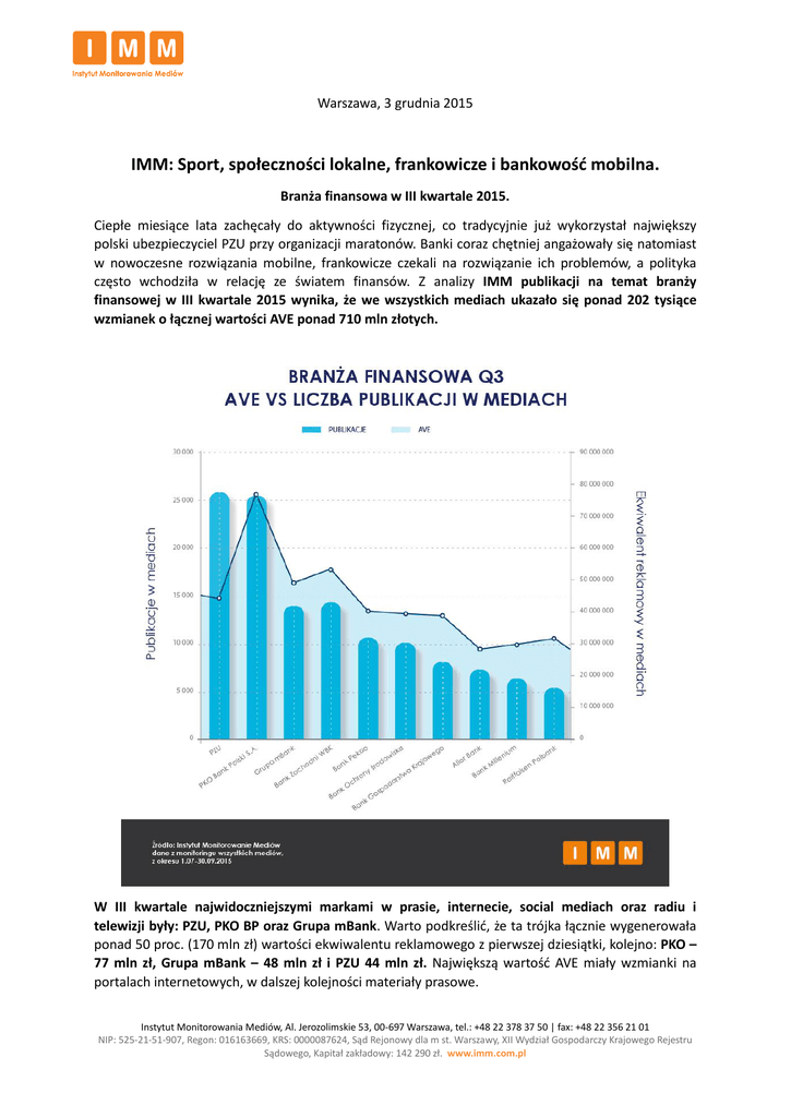 Warszawa, 3 grudnia 2015 IMM: Sport, społeczności lokalne, frankowicze i bankowość mobilna. Branża finansowa w III kwartale 2015. Ciepłe miesiące lata zachęcały do aktywności fizycznej, co tradycyjnie już wykorzystał największy polski ubezpieczyciel PZU przy organizacji maratonów. Banki coraz chętniej angażowały się natomiast w nowoczesne rozwiązania mobilne, frankowicze czekali na rozwiązanie ich problemów, a polityka często wchodziła w relację ze światem finansów. Z analizy IMM publikacji na temat branży finansowej w III kwartale 2015 wynika, że we wszystkich mediach ukazało się ponad 202 tysiące wzmianek o łącznej wartości AVE ponad 710 mln złotych. W III kwartale najwidoczniejszymi markami w prasie, internecie, social mediach oraz radiu i telewizji były: PZU, PKO BP oraz Grupa mBank. Warto podkreślić, że ta trójka łącznie wygenerowała ponad 50 proc. (170 mln zł) wartości ekwiwalentu reklamowego z pierwszej dziesiątki, kolejno: PKO – 77 mln zł, Grupa mBank – 48 mln zł i PZU 44 mln zł. Największą wartość AVE miały wzmianki na portalach internetowych, w dalszej kolejności materiały prasowe. Instytut Monitorowania Mediów, Al. Jerozolimskie 53, 00-697 Warszawa, tel.: +48 22 378 37 50 | fax: +48 22 356 21 01 NIP: 525-21-51-907, Regon: 016163669, KRS: 0000087624, Sąd Rejonowy dla m st. Warszawy, XII Wydział Gospodarczy Krajowego Rejestru Sądowego, Kapitał zakładowy: 142 290 zł. www.imm.com.pl PZU dba o zdrowie, bezpieczeństwo i zaprasza do współpracy Annę Komorowską. W ciepłe letnie miesiące amatorzy sportu z zapałem śledzą kalendarz maratonów i innych długodystansowych biegów. W analizowanym przez IMM III kwartale 2015 roku tradycyjnie już największy polski ubezpieczyciel włączył się w krzewienie aktywności fizycznej wśród Polaków. Najpopularniejszy 37 Maraton Warszawski oprócz emocji sportowych i wielu nowych inicjatyw, takich jak RunBlogFest (czyli spotkanie blogujących biegaczy) wzbudził również narzekania na chaos komunikacyjny związany z tym wydarzeniem. Na lokalnych forach często pojawiały się komentarze dotyczące utrudnień w poruszaniu się po Warszawie. „Wielkie podziękowania dla organizatorów i władz miasta za skuteczny chaos i bajzel komunikacyjny po obu stronach Wisły. Państwu dziękujemy.” Sympatię internautów zdobyła natomiast kolejna odsłona akcji #stopwariatom. Wolontariusze PZU wspólnie z policją rozdawali kierowcom niebieskie serduszka mające przypominać im o bezpieczeństwie pieszych. Poza walorami edukacyjnymi internauci docenili również piosenkę, która zagościła w reklamie akcji. „Piosenka z reklamy pzu tej z „kochasz? Powiedz stop wariatom drogowym” sprawia ze chce mi się płakać ale ją kocham #MTVHottest Justin Bieber” Na początku sierpnia Radio Zet podało, że Anna Komorowska od dwóch tygodni zasiada w Radzie Fundacji PZU. Do Rady trafił też między innymi dyrektor Muzeum Powstania Warszawskiego Jan Ołdakowski i redaktor naczelny tygodnika „Polityka” Jerzy Baczyński. Jednak to żona byłego Prezydenta RP wzbudziła największe zainteresowanie internautów. Na portalach społecznościowych pojawiły się liczne wpisy odnoszące się do tej sytuacji, a często też nawiązujące do wcześniejszych deklaracji Bronisława Komorowskiego. BZ WBK – lider bankowości wyzwala potencjał społeczny W lipcu w mediach pojawiła się informacja, że Bank Zachodni WBK w najnowszej analizie bankowości mobilnej zajął pierwsze miejsce w Polsce i drugie w Europie. Forrester Research, międzynarodowa firma badawczo-doradcza, opisuje Bank Zachodni WBK S.A. jako jeden z dwóch Europejskich banków oferujących szeroki zakres funkcji transakcyjnych, ciekawe oferty w kanale mobilnym, łatwiejsze wprowadzenie do punktów kontaktu, oraz promowanie dodatkowych usług. Aplikacja Banku Zachodniego WBK znalazła się również wśród najpopularniejszych mobilnych aplikacji finansowych. Informacje te zmobilizowały internautów do przemyśleń na temat możliwości skorzystania z usług tego banku. Instytut Monitorowania Mediów, Al. Jerozolimskie 53, 00-697 Warszawa, tel.: +48 22 378 37 50 | fax: +48 22 356 21 01 NIP: 525-21-51-907, Regon: 016163669, KRS: 0000087624, Sąd Rejonowy dla m st. Warszawy, XII Wydział Gospodarczy Krajowego Rejestru Sądowego, Kapitał zakładowy: 142 290 zł. www.imm.com.pl Fundacja Banku Zachodniego WBK ruszyła z 2 edycją konkursu „Tu mieszkam, tu zmieniam”. Program, organizowany we współpracy z Bankiem, daje szansę lokalnym fundacjom, stowarzyszeniom oraz społecznikom na otrzymanie jednego z 300 grantów, którymi będą wsparte najciekawsze projekty lokalne. Zmobilizowane społeczności lokalne skrzykiwały się na mediach społecznościowych i proponowały ciekawe inicjatywy. Przedszkola, towarzystwa kultury i inne podmioty rywalizowały zacięcie o przyznanie grantu. „Cuda się zdarzają!!! GTK otrzymało grant na realizację projektu w ramach akcji BZWBK „Tu mieszkam tu zmieniam”. Jest super – mamy pieniądze na cykl warsztatów fotograficznych od jesieni do wiosny, na wystawę i folder. Proszę Was kochani głosujcie na projekt przez internet, bo można ugrać jeszcze więcej.” Frankowicze na start Letnie miesiące nie oznaczały wakacji dla osób zaangażowanych w działalność w sprawie kredytów we frankach i ustawodawstwa w tym zakresie. W lipcu posłowie PO złożyli do Sejmu projekt ustawy, umożliwiający przewalutowanie kredytów we frankach. W wojnę medialną włączyły się również same banki. Commerzbank podał w komunikacie, że wprowadzenie ustawy w życie naruszy umowę Polski i Niemiec w sprawie popierania i wzajemnej ochrony inwestycji. Wzbudziło to komentarze internautów. „Obecna histeria zagranicznych banków (prawie ¾ rynku!) doskonale pokazuje jak bardzo były bezkarne i wszechstronne w ostatnich latach oraz gdzie mają swoich polskich klientów.” Instytut Mon