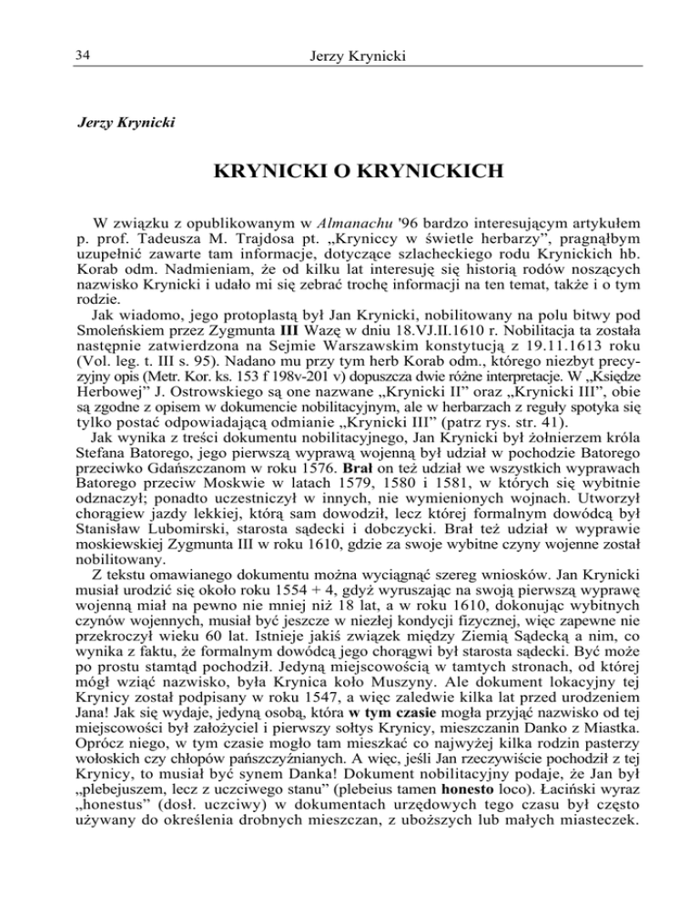34 Jerzy Krynicki Jerzy Krynicki KRYNICKI O KRYNICKICH W związku z opublikowanym w Almanachu '96 bardzo interesującym artykułem p. prof. Tadeusza M. Trajdosa pt. „Kryniccy w świetle herbarzy”, pragnąłbym uzupełnić zawarte tam informacje, dotyczące szlacheckiego rodu Krynickich hb. Korab odm. Nadmieniam, że od kilku lat interesuję się historią rodów noszących nazwisko Krynicki i udało mi się zebrać trochę informacji na ten temat, także i o tym rodzie. Jak wiadomo, jego protoplastą był Jan Krynicki, nobilitowany na polu bitwy pod Smoleńskiem przez Zygmunta III Wazę w dniu 18.VJ.II.1610 r. Nobilitacja ta została następnie zatwierdzona na Sejmie Warszawskim konstytucją z 19.11.1613 roku (Vol. leg. t. III s. 95). Nadano mu przy tym herb Korab odm., którego niezbyt precyzyjny opis (Metr. Kor. ks. 153 f 198v-201 v) dopuszcza dwie różne interpretacje. W „Księdze Herbowej” J. Ostrowskiego są one nazwane „Krynicki II” oraz „Krynicki III”, obie są zgodne z opisem w dokumencie nobilitacyjnym, ale w herbarzach z reguły spotyka się tylko postać odpowiadającą odmianie „Krynicki III” (patrz rys. str. 41). Jak wynika z treści dokumentu nobilitacyjnego, Jan Krynicki był żołnierzem króla Stefana Batorego, jego pierwszą wyprawą wojenną był udział w pochodzie Batorego przeciwko Gdańszczanom w roku 1576. Brał on też udział we wszystkich wyprawach Batorego przeciw Moskwie w latach 1579, 1580 i 1581, w których się wybitnie odznaczył; ponadto uczestniczył w innych, nie wymienionych wojnach. Utworzył chorągiew jazdy lekkiej, którą sam dowodził, lecz której formalnym dowódcą był Stanisław Lubomirski, starosta sądecki i dobczycki. Brał też udział w wyprawie moskiewskiej Zygmunta III w roku 1610, gdzie za swoje wybitne czyny wojenne został nobilitowany. Z tekstu omawianego dokumentu można wyciągnąć szereg wniosków. Jan Krynicki musiał urodzić się około roku 1554 + 4, gdyż wyruszając na swoją pierwszą wyprawę wojenną miał na pewno nie mniej niż 18 lat, a w roku 1610, dokonując wybitnych czynów wojennych, musiał być jeszcze w niezłej kondycji fizycznej, więc zapewne nie przekroczył wieku 60 lat. Istnieje jakiś związek między Ziemią Sądecką a nim, co wynika z faktu, że formalnym dowódcą jego chorągwi był starosta sądecki. Być może po prostu stamtąd pochodził. Jedyną miejscowością w tamtych stronach, od której mógł wziąć nazwisko, była Krynica koło Muszyny. Ale dokument lokacyjny tej Krynicy został podpisany w roku 1547, a więc zaledwie kilka lat przed urodzeniem Jana! Jak się wydaje, jedyną osobą, która w tym czasie mogła przyjąć nazwisko od tej miejscowości był założyciel i pierwszy sołtys Krynicy, mieszczanin Danko z Miastka. Oprócz niego, w tym czasie mogło tam mieszkać co najwyżej kilka rodzin pasterzy wołoskich czy chłopów pańszczyźnianych. A więc, jeśli Jan rzeczywiście pochodził z tej Krynicy, to musiał być synem Danka! Dokument nobilitacyjny podaje, że Jan był „plebejuszem, lecz z uczciwego stanu” (plebeius tamen honesto loco). Łaciński wyraz „honestus” (dosł. uczciwy) w dokumentach urzędowych tego czasu był często używany do określenia drobnych mieszczan, z uboższych lub małych miasteczek. Krynicki o Krynickich 35 Również Danko z Miastka w dokumencie lokacyjnym jest określony jako „ vir honestus de Miastko'', a więc był mieszczaninem. W dokumencie nobilitacyjnym zaznaczono też, że matka Jana pochodziła ze starego polskiego rodu szlacheckiego. W XVI wieku zdarzały się, choć rzadko, przypadki poślubienia plebejusza przez szlachciankę, ale ten plebejusz musiał być nie byle kim. Na pewno nie mógł być nim pasterz wołoski, czy chłop pańszczyźniany, zwłaszcza, jeżeli szlachcianka była ze starego rodu. Z. Wąsowicz w swoim opracowaniu „Stara Krynica”, opierając się na analizie dokumentu lokacyjnego, uważa Danka za katolika i Polaka. Nie wiadomo, czy to prawda, ale na pewno szlachciance ze starego polskiego rodu, zapewne katoliczce, znacznie łatwiej byłoby poślubić plebejusza katolika, niż schizmatyka, to była przecież połowa XVI wieku, jeszcze przed Unią Brzeską. To, że potomkowie Jana byli przeważnie grekokatolikami, nie przesądza sprawy. Wiadomo, że po Unii Brzeskiej uboższa ludność, także uboższa szlachta, nierzadko korzystała z posług religijnych blisko położonej cerkwi, zamiast dalekiego kościoła. Uproszczony sposób określania narodowości na podstawie obrządku powstał dopiero po rozbiorach, jako wynalazek austriacki. Na marginesie może warto zaznaczyć, że przy czytaniu starych pism, zwłaszcza sprzed połowy XIX wieku, należy zachować dużą ostrożność przy interpretacji takich określeń jak „Litwin” czy „Rusin” w odniesieniu do szlachty. Wbrew obecnie rozpowszechnionemu mniemaniu, nie musiały one wcale oznaczać narodowości, jak to byłoby dziś, lecz najczęściej odpowiadały pochodzeniu z danego regionu. W przypadku określenia „Rusin” oznaczały także wyznawcę prawosławia czy obrządku greckokatolickiego, jako wyznań typowych dla ziem ruskich Rzeczypospolitej. Znane było szlacheckie powiedzenie: „Gente Ruthenus, natione Polonus” - z pochodzenia Rusin, z narodowości Polak. Wracając jednak do tematu, chociaż wydaje się bardzo prawdopodobnym, że Jan Krynicki pochodził z Krynicy k. Muszyny i był synem Danka z Miastka, to jednak nie można tego uważać za pewne, brak bowiem bezpośredniego dowodu. Za potomków Jana Krynickiego uważa się Krynickich - Adamkowiczów, Krynickich - Eliaszowiczów i Krynickich - Tymkowiczów. Tak podaje Boniecki w swoim herbarzu. W wydanym przez władze austriackie „Poczcie szlachty Królestwa Galicji i Bukowiny” podano, że rzeczywiście niektórzy przedstawiciele tych linii legitymowali się herbem Korab odm., był jednak przypadek legitymowania się herbem Sas, a w wielu przypad kach nie 