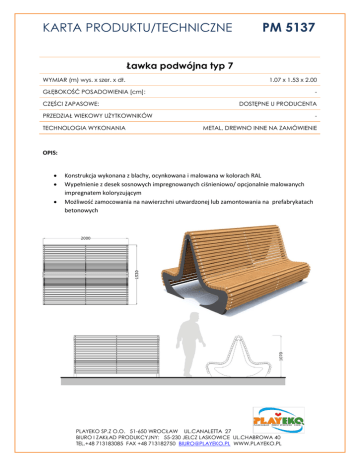 KARTA PRODUKTU/TECHNICZNE PM 5137 Ławka podwójna typ 7 WYMIAR (m) wys. x szer. x dł. 1.07 x 1.53 x 2.00 GŁĘBOKOŚĆ POSADOWIENIA [cm]: CZĘŚCI ZAPASOWE: DOSTĘPNE U PRODUCENTA PRZEDZIAŁ WIEKOWY UŻYTKOWNIKÓW TECHNOLOGIA WYKONANIA METAL, DREWNO INNE NA ZAMÓWIENIE OPIS: Konstrukcja wykonana z blachy, ocynkowana i malowana w kolorach RAL Wypełnienie z desek sosnowych impregnowanych ciśnieniowo/ opcjonalnie malowanych impregnatem koloryzującym Możliwość zamocowania na nawierzchni utwardzonej lub zamontowania na prefabrykatach betonowych PLAYEKO SP.Z O.O. 51-650 WROCŁAW UL.CANALETTA 27 BIURO I ZAKŁAD PRODUKCYJNY: 55-230 JELCZ LASKOWICE UL.CHABROWA 40 TEL.+48 713183085 FAX +48 713182750 [email protected] WWW.PLAYEKO.PL