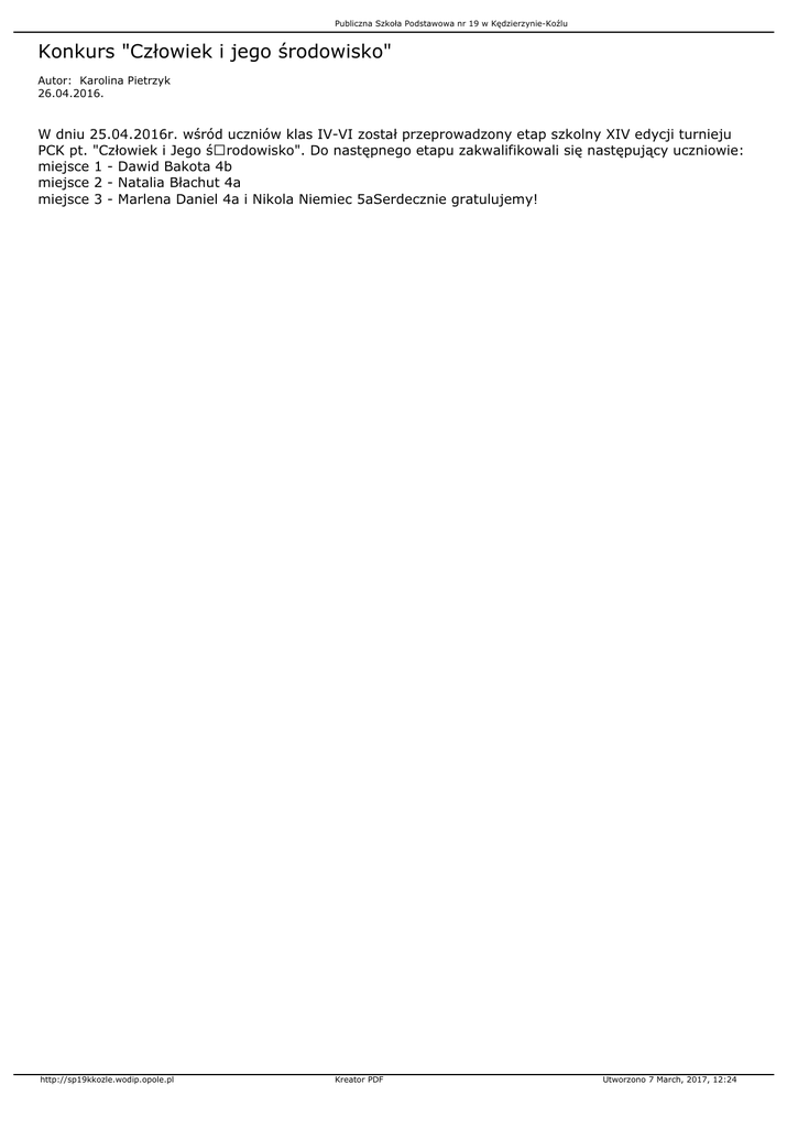 Publiczna Szkoła Podstawowa nr 19 w Kędzierzynie-Koźlu Konkurs "Człowiek i jego środowisko" Autor: Karolina Pietrzyk 26.04.2016. W dniu 25.04.2016r. wśród uczniów klas IV-VI został przeprowadzony etap szkolny XIV edycji turnieju PCK pt. "Człowiek i Jego śŒrodowisko". Do następnego etapu zakwalifikowali się następujący uczniowie: miejsce 1 - Dawid Bakota 4b miejsce 2 - Natalia Błachut 4a miejsce 3 - Marlena Daniel 4a i Nikola Niemiec 5aSerdecznie gratulujemy! http://sp19kkozle.wodip.opole.pl Kreator PDF Utworzono 7 March, 2017, 12:24