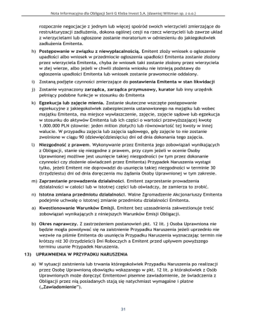 Nota Informacyjna dla Obligacji Serii G Kleba Invest S.A. (dawniej Wittman sp. z o.o.) rozpocznie negocjacje z jednym lub więcej spośród swoich wierzycieli zmierzające do restrukturyzacji zadłużenia, dokona ogólnej cesji na rzecz wierzycieli lub zawrze układ z wierzycielami lub ogłoszone zostanie moratorium w odniesieniu do jakiegokolwiek zadłużenia Emitenta. h) Postępowanie w związku z niewypłacalnością. Emitent złoży wniosek o ogłoszenie upadłości albo wniosek w przedmiocie ogłoszenia upadłości Emitenta zostanie złożony przez wierzyciela Emitenta, chyba że wniosek taki zostanie złożony przez wierzyciela w złej wierze, albo jeżeli w chwili złożenia wniosku nie istnieją podstawy do ogłoszenia upadłości Emitenta lub wniosek zostanie prawomocnie oddalony. i) Zostaną podjęte czynności zmierzające do postawienia Emitenta w stan likwidacji j) Zostanie wyznaczony zarządca, zarządca przymusowy, kurator lub inny urzędnik pełniący podobne funkcje w stosunku do Emitenta k) Egzekucja lub zajęcie mienia. Zostanie skuteczne wszczęte postępowanie egzekucyjne z jakiegokolwiek zabezpieczenia ustanowionego na majątku lub wobec majątku Emitenta, ma miejsce wywłaszczenie, zajęcie, zajęcie sądowe lub egzekucja w stosunku do aktywów Emitenta lub ich części o wartości przewyższającej kwotę 1.000.000 PLN (słownie: jeden milion złotych) lub równowartość tej kwoty w innej walucie. W przypadku zajęcia lub zajęcia sądowego, gdy zajęcie to nie zostanie zwolnione w ciągu 90 (dziewięćdziesięciu) dni od dnia dokonania tego zajęcia. l) Niezgodność z prawem. Wykonywanie przez Emitenta jego zobowiązań wynikających z Obligacji, stanie się niezgodne z prawem, przy czym jeżeli w ocenie Osoby Uprawnionej możliwe jest usunięcie takiej niezgodności (w tym przez dokonanie czynności czy złożenie oświadczeń przez Emitenta) Przypadek Naruszenia wystąpi tylko, jeżeli Emitent nie doprowadzi do usunięcia takiej niezgodności w terminie 30 (trzydziestu) dni od dnia doręczenia mu żądania Osoby Uprawnionej w tym zakresie. m) Zaprzestanie prowadzenia działalności. Emitent zaprzestanie prowadzenia działalności w całości lub w istotnej części lub oświadczy, że zamierza to zrobić. n) Istotna zmiana przedmiotu działalności. Walne Zgromadzenie Akcjonariuszy Emitenta podejmie uchwałę o istotnej zmianie przedmiotu działalności Emitenta. a) Kwestionowanie Warunków Emisji. Emitent bez uzasadnienia zakwestionuje treść zobowiązań wynikających z niniejszych Warunków Emisji Obligacji. b) Okres naprawczy. Z zastrzeżeniem postanowień pkt. 12 lit. j Osoba Uprawniona nie będzie mogła powoływać się na zaistnienie Przypadku Naruszenia jeżeli uprzednio nie wezwie na piśmie Emitenta do usunięcia Przypadku Naruszenia wyznaczając termin nie krótszy niż 30 (trzydzieści) Dni Roboczych a Emitent przed upływem powyższego terminu usunie Przypadek Naruszenia. 13) UPRAWNIENIA W PRZYPADKU NARUSZENIA a) W sytuacji zaistnienia lub trwania któregokolwiek Przypadku Naruszenia po realizacji przez Osobę Uprawnioną obowiązku wskazanego w pkt. 12 lit. p którakolwiek z Osób Uprawnionych może doręczyć Emitentowi pisemne zawiadomienie, że świadczenia z Obligacji przez nią posiadanych stają się natychmiast wymagalne i płatne („Zawiadomienie”). 31