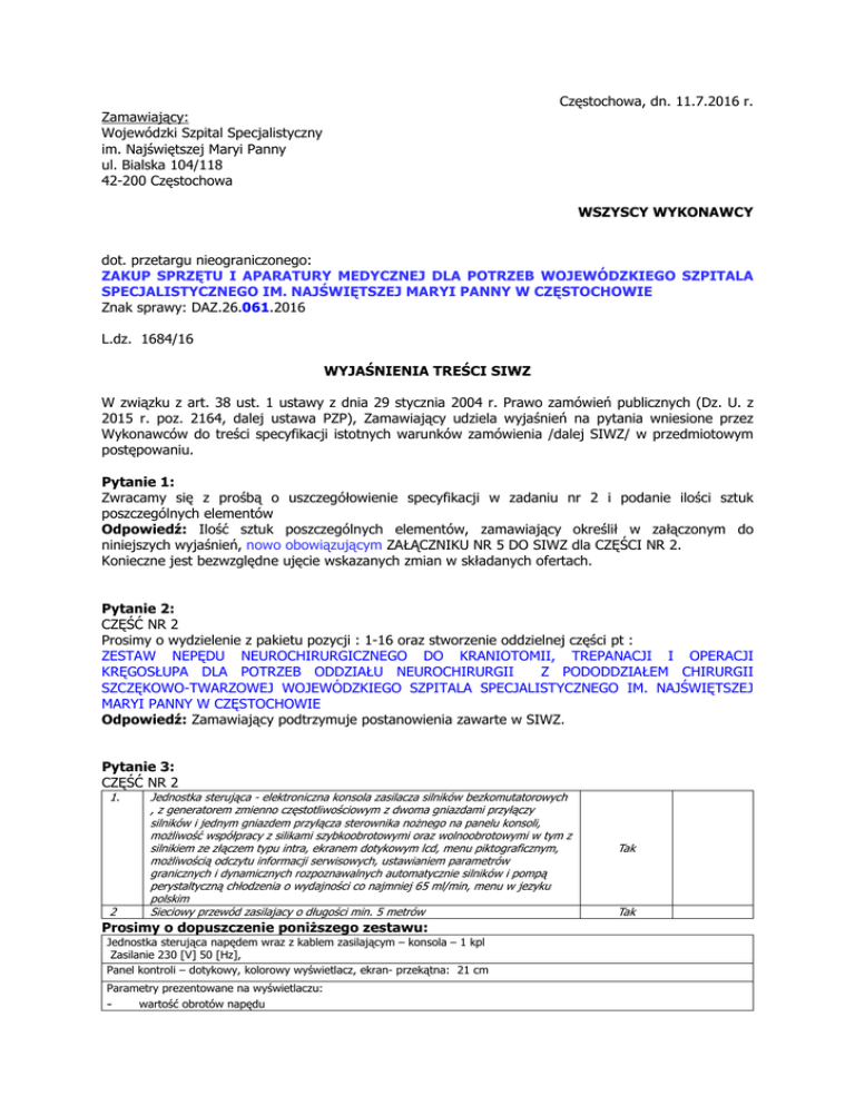 Częstochowa, dn. 11.7.2016 r. Zamawiający: Wojewódzki Szpital Specjalistyczny im. Najświętszej Maryi Panny ul. Bialska 104/118 42-200 Częstochowa WSZYSCY WYKONAWCY dot. przetargu nieograniczonego: ZAKUP SPRZĘTU I APARATURY MEDYCZNEJ DLA POTRZEB WOJEWÓDZKIEGO SZPITALA SPECJALISTYCZNEGO IM. NAJŚWIĘTSZEJ MARYI PANNY W CZĘSTOCHOWIE Znak sprawy: DAZ.26.061.2016 L.dz. 1684/16 WYJAŚNIENIA TREŚCI SIWZ W związku z art. 38 ust. 1 ustawy z dnia 29 stycznia 2004 r. Prawo zamówień publicznych (Dz. U. z 2015 r. poz. 2164, dalej ustawa PZP), Zamawiający udziela wyjaśnień na pytania wniesione przez Wykonawców do treści specyfikacji istotnych warunków zamówienia /dalej SIWZ/ w przedmiotowym postępowaniu. Pytanie 1: Zwracamy się z prośbą o uszczegółowienie specyfikacji w zadaniu nr 2 i podanie ilości sztuk poszczególnych elementów Odpowiedź: Ilość sztuk poszczególnych elementów, zamawiający określił w załączonym do niniejszych wyjaśnień, nowo obowiązującym ZAŁĄCZNIKU NR 5 DO SIWZ dla CZĘŚCI NR 2. Konieczne jest bezwzględne ujęcie wskazanych zmian w składanych ofertach. Pytanie 2: CZĘŚĆ NR 2 Prosimy o wydzielenie z pakietu pozycji : 1-16 oraz stworzenie oddzielnej części pt : ZESTAW NEPĘDU NEUROCHIRURGICZNEGO DO KRANIOTOMII, TREPANACJI I OPERACJI KRĘGOSŁUPA DLA POTRZEB ODDZIAŁU NEUROCHIRURGII Z PODODDZIAŁEM CHIRURGII SZCZĘKOWO-TWARZOWEJ WOJEWÓDZKIEGO SZPITALA SPECJALISTYCZNEGO IM. NAJŚWIĘTSZEJ MARYI PANNY W CZĘSTOCHOWIE Odpowiedź: Zamawiający podtrzymuje postanowienia zawarte w SIWZ. Pytanie 3: CZĘŚĆ NR 2 1. 2 Jednostka sterująca - elektroniczna konsola zasilacza silników bezkomutatorowych , z generatorem zmienno częstotliwościowym z dwoma gniazdami przyłączy silników i jednym gniazdem przyłącza sterownika nożnego na panelu konsoli, możliwość współpracy z silikami szybkoobrotowymi oraz wolnoobrotowymi w tym z silnikiem ze złączem typu intra, ekranem dotykowym lcd, menu piktograficznym, możliwością odczytu informacji serwisowych, ustawianiem parametrów granicznych i dynamicznych rozpoznawalnych automatycznie silników i pompą perystaltyczną chłodzenia o wydajności co najmniej 65 ml/min, menu w jezyku polskim Sieciowy przewód zasilajacy o długości min. 5 metrów Prosimy o dopuszczenie poniższego zestawu: Jednostka sterująca napędem wraz z kablem zasilającym – konsola – 1 kpl Zasilanie 230 [V] 50 [Hz], Panel kontroli – dotykowy, kolorowy wyświetlacz, ekran- przekątna: 21 cm Parametry prezentowane na wyświetlaczu: wartość obrotów napędu Tak Tak - kierunek obrotów kody błędów wielkość przepływu irygacji możliwość podłączenia do 3 napędów Waga konsoli 7,3 kg, możliwość mocowania konsoli na stojaku Regulacja progu prędkości obrotowej napędu z konsoli w zakresie co najmniej 1000 – 75 000 obrotów na minutę. Możliwość podpięcia do jednej konsoli 3 napędów z czego 2 niezależnych systemów pracujących jednocześnie. Mozłiwość podpięcia silników szybkoobrotowych i wolnoobrotowych Możliwość odczytu informacji serwisowych Możliwość ustawienia parametrów granicznych i dynamicznych rozpoznawalnych automatycznie silników Możliwość bezpośredniego podpięcia do konsoli systemu pił : oscylacyjna, posuwisto zwrotna i sagitalna Aktywacja napędu za pomocą nożnego oraz włącznika ręcznego na konsoli: Aktywowanie napędów Wbudowane- zintegrowane dwie pompy perystaltyczne – regulacja z napędu konsoli, Zakres pracy pompy irygacyjnej 0,5ml/min – 100 ml/min, możliwość rozbudowy o specjalnie dedykowany pilot sterujący funkcjami pomp. Możliwość zmiany kierunku obrotów głowicy silnika z poziomu sterownika nożnego i konsoli sterującej Możliwość rozszerzenia o „shaver” kręgosłupowy - przystosowany oraz zarejestrowany do zabiegów usuwania tkanki miękkiej z dysków międzykręgowych, również w procedurach przezskórnych z możliwością pracy obrotowej oraz oscylacyjnej Możliwość rozbudowy o specjalny, dedykowany do obsługi parametrów pompy irygacyjnej pilot sterujący Możliwość rozszerzenia systemu o zintegrowany z konsolą neuromonitoring- gniazdo w konsoli Możliwość współpracy konsoli z systemem do neuronawigacji i nawigowania poszczególnych jej elementów Praca napędu możliwa bez sterownika nożnego- sterowanie napędem z poziomu konsoli Odpowiedź: Zamawiający podtrzymuje postanowienia zawarte w SIWZ. Pytanie 4: CZĘŚĆ NR 2 3. Sterownik nożny jednoprzyciskowy z przyciskiem funkcyjnym i przyciszkiem służącym do zmiany kierunku obrotów i mozliwościa sterowania funkcjami konsoli Tak Prosimy o dopuszczenie poniższego zestawu: Sterownik nożny z uchwytem do przenoszenia stopą podczas operacji przez użytkownika (warunek sterylności), 1szt Podświetlany sterownik nożny. Sterownik obsługujący następujące funkcje : 1. zmiana kierunku obrotów, 2. zmiana napędu, 3. zmiana rodzaju przyśpieszenia tj. 0-1, lub płynne 4. zmiana prędkości Odpowiedź: Zamawiający podtrzymuje postanowienia zawarte w SIWZ. Pytanie 5: CZĘŚĆ NR 2 5. 6. 7. 8. 9. 10. 11. 12. Uchwyt uniwersalny - prostnica extra krótka - kraniotom szybkoobrotowy ze zintegrowany silnikiem, próg maksymalnej prędkości obrotowej regulowany od 10 000 do 80 000 obr./min. Ze skokiem co 5 000 obr./min., moc maksymalna 140 w, masa nie większa niż 125g, maksymalny moment obrotowy 2,2 ncm, wymiary 17x156 mm +/-5% Osłona opony twardej do kraniotomu nieobrotowa średnia wymiary 14 x 65 mm Osłona opony twardej do kraniotomu nieobrotowa długa wymiary 14 x 70 mm FREZ KRANIOTOMU I II i III, FREZY O RÓŻNYCH KSZTAŁTACH TYPU ROZETKOWE/DIAMENTOWE, FREZY DO KĄTNICY/PROSTNICY SZYBKOOBROTOWEJ, MOŻLIWOŚĆ WYBORU Z KATALOGU WYKONAWCY, PONAD 100 RÓŻNYCH ROZMIARÓW I KSZTAŁTÓW, FREZY JEDNEJ DŁUGOŚCI PASUJĄCE DO RÓŻNYCH DŁUGOŚCI KĄTNIC, MOŻLIWOŚĆ MYCIA DEZYNFEKCJI I STERYLIZACJI MOŻLIWOŚĆ MYCIA DEZYNFEKCJI I STERYLIZACJI (DO WYBORU PRZEZ ZAMAWIAJĄ